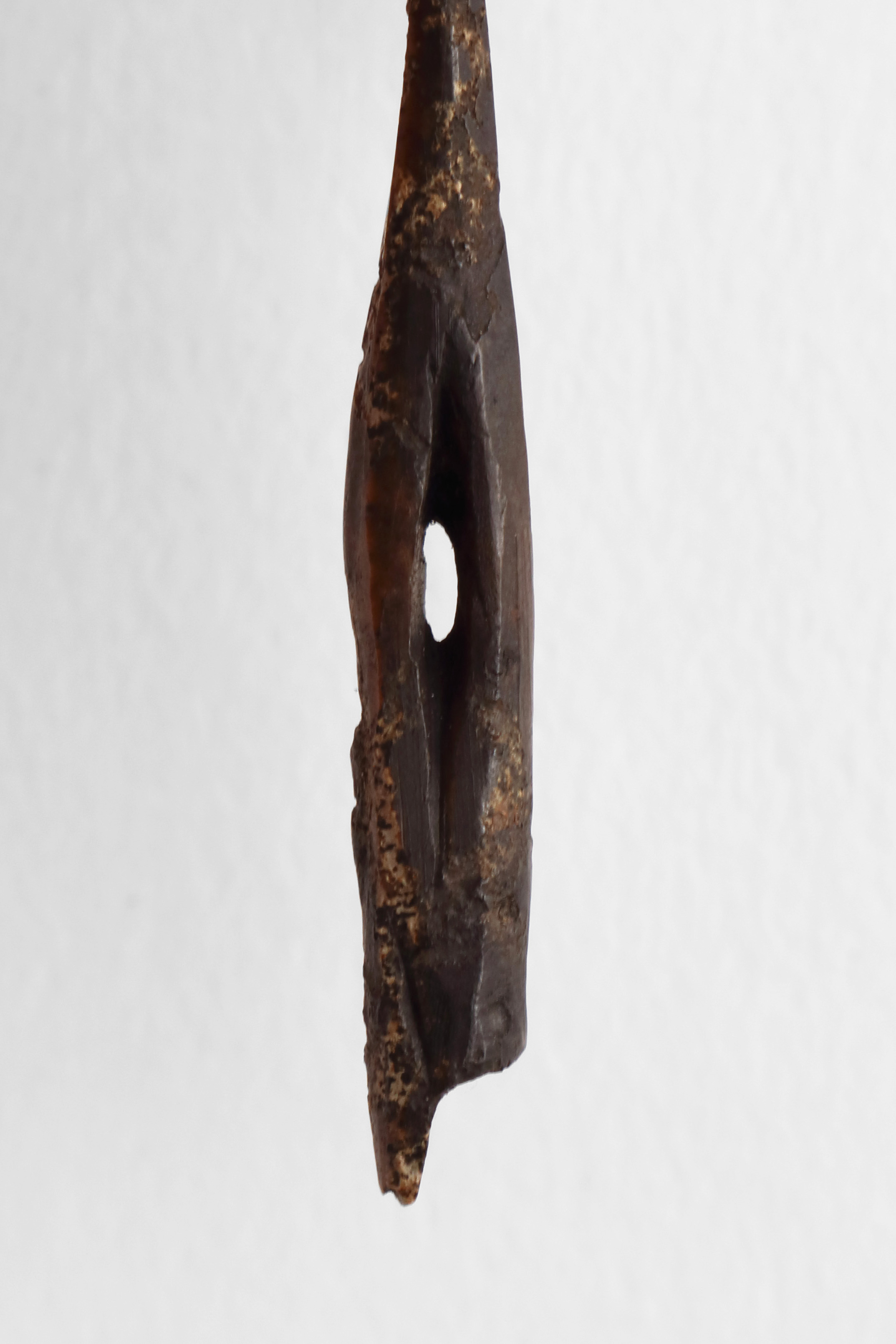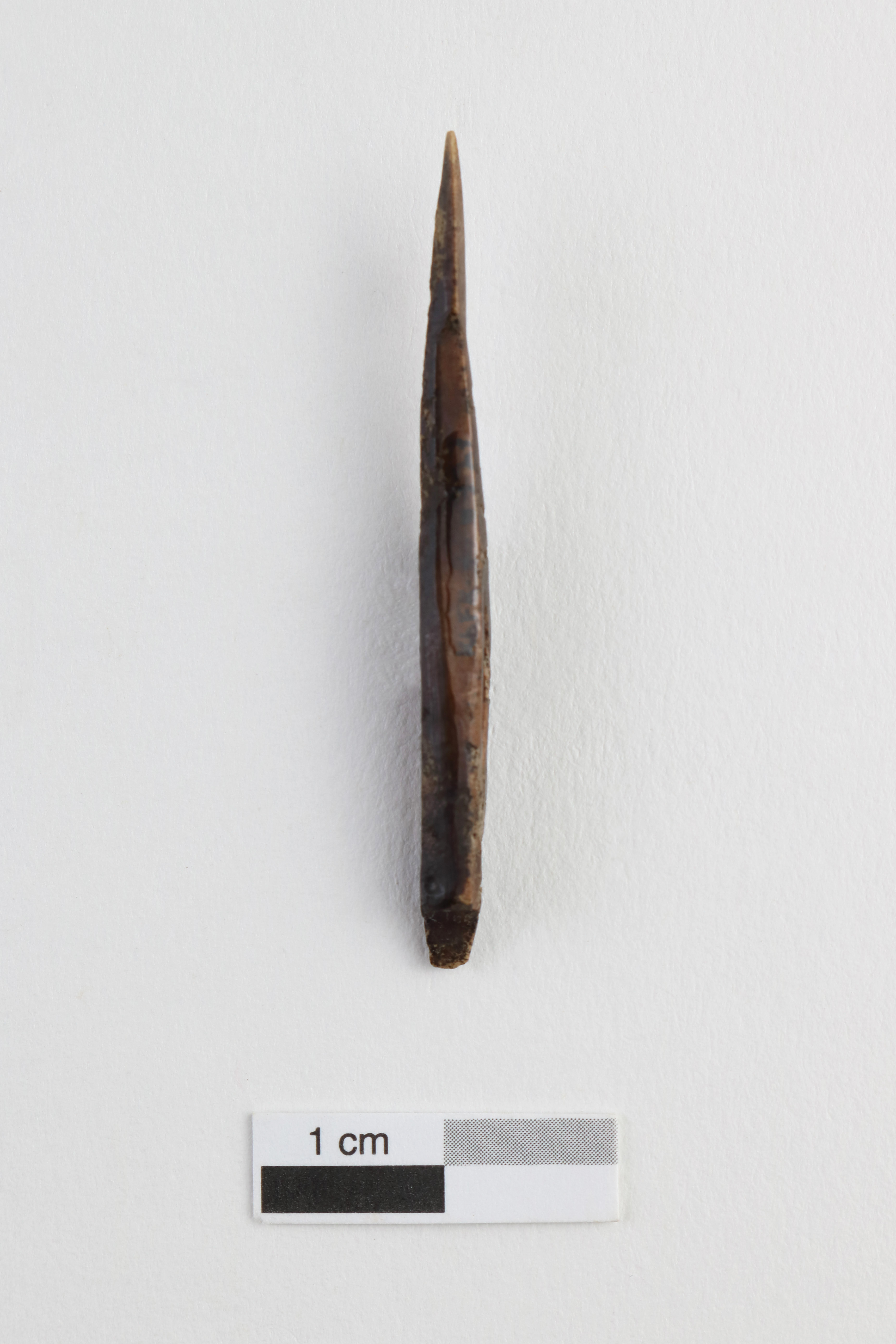 La pointe barbelée est associée au Dorsétien classique (2 200 à 1 500 ans avant aujourd'hui). La pointe en ivoire de morse présente une double barbelure ainsi qu'une perforation sur la partie mésio-proximale.