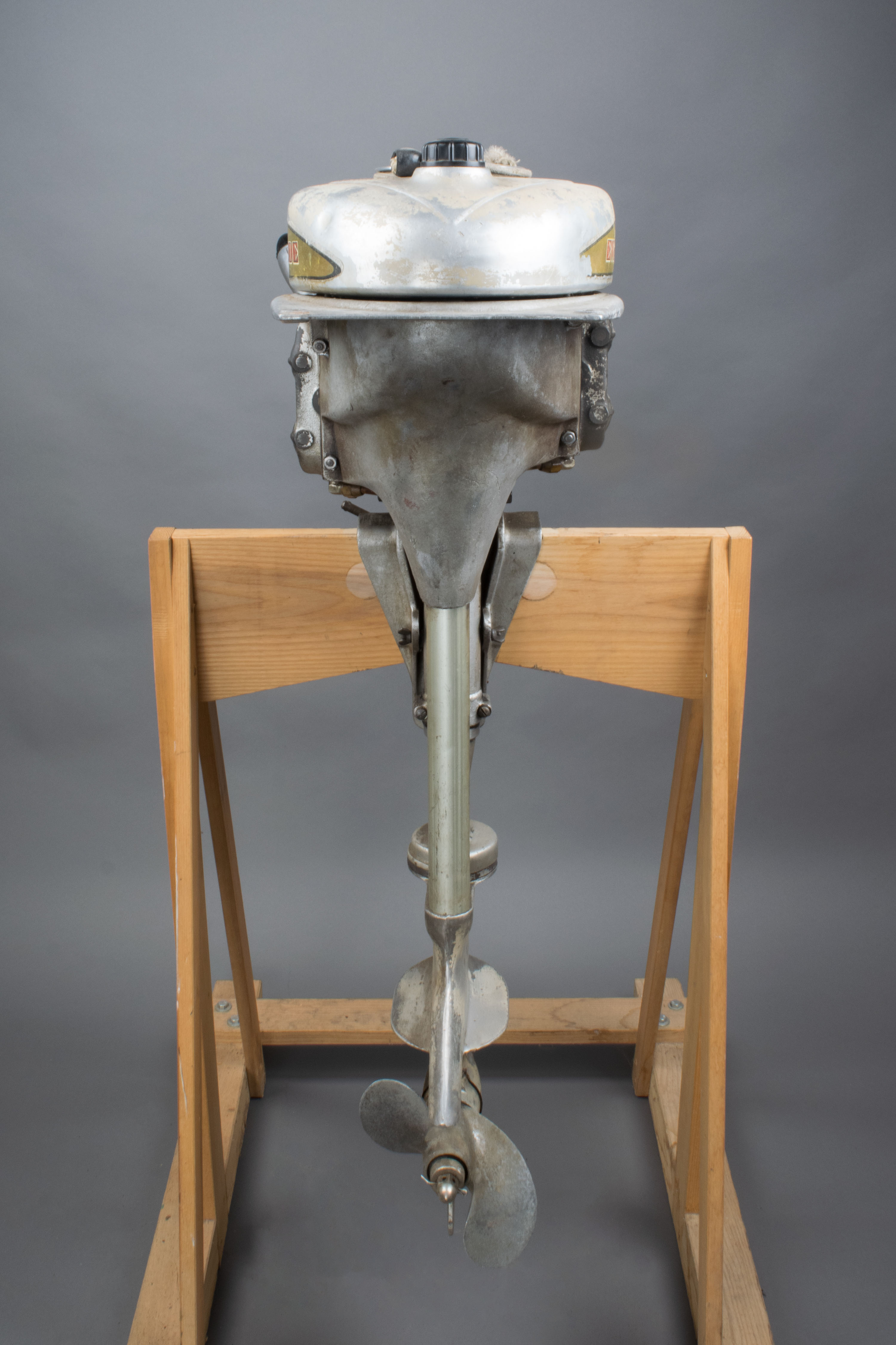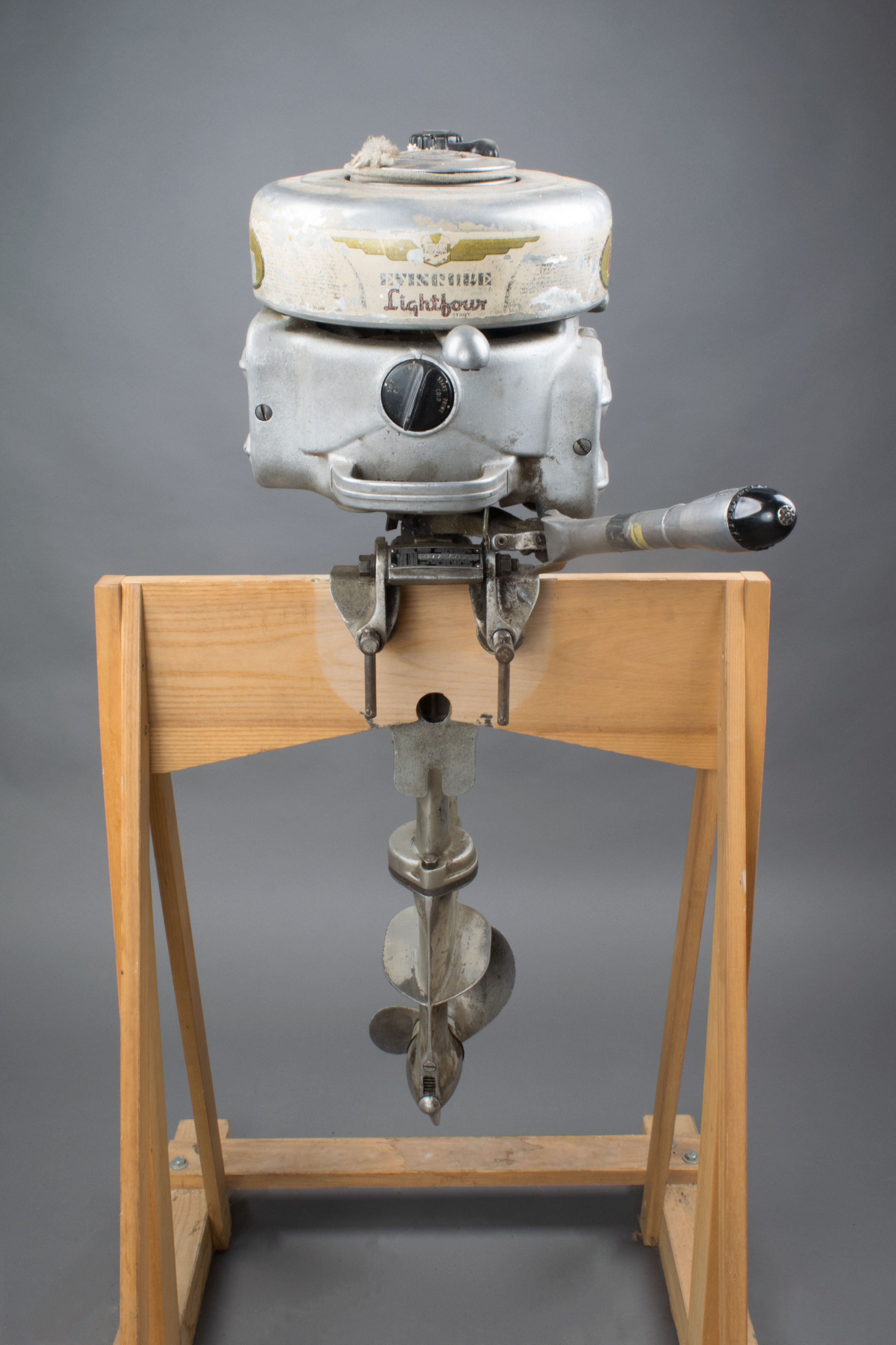Le moteur hors-bord Evinrude Lightfour est un équipement de transport nautique fabriqué vers 1945. Mesurant 106,5 cm de hauteur, l'objet en métal compte trois sections : le moteur, la transmission et l'hélice. La section du moteur comprend un capot avec poignée contenant le réservoir, dont le bouchon est attaché à une corde, et le moteur à combustion. Ce dernier est mis en marche par deux pièces, soit l'étrangleur et le lanceur, visibles au-dessus de la poignée. Le bras de commande en métal est doté d'un embout en plastique noir et sert d'accélérateur.
