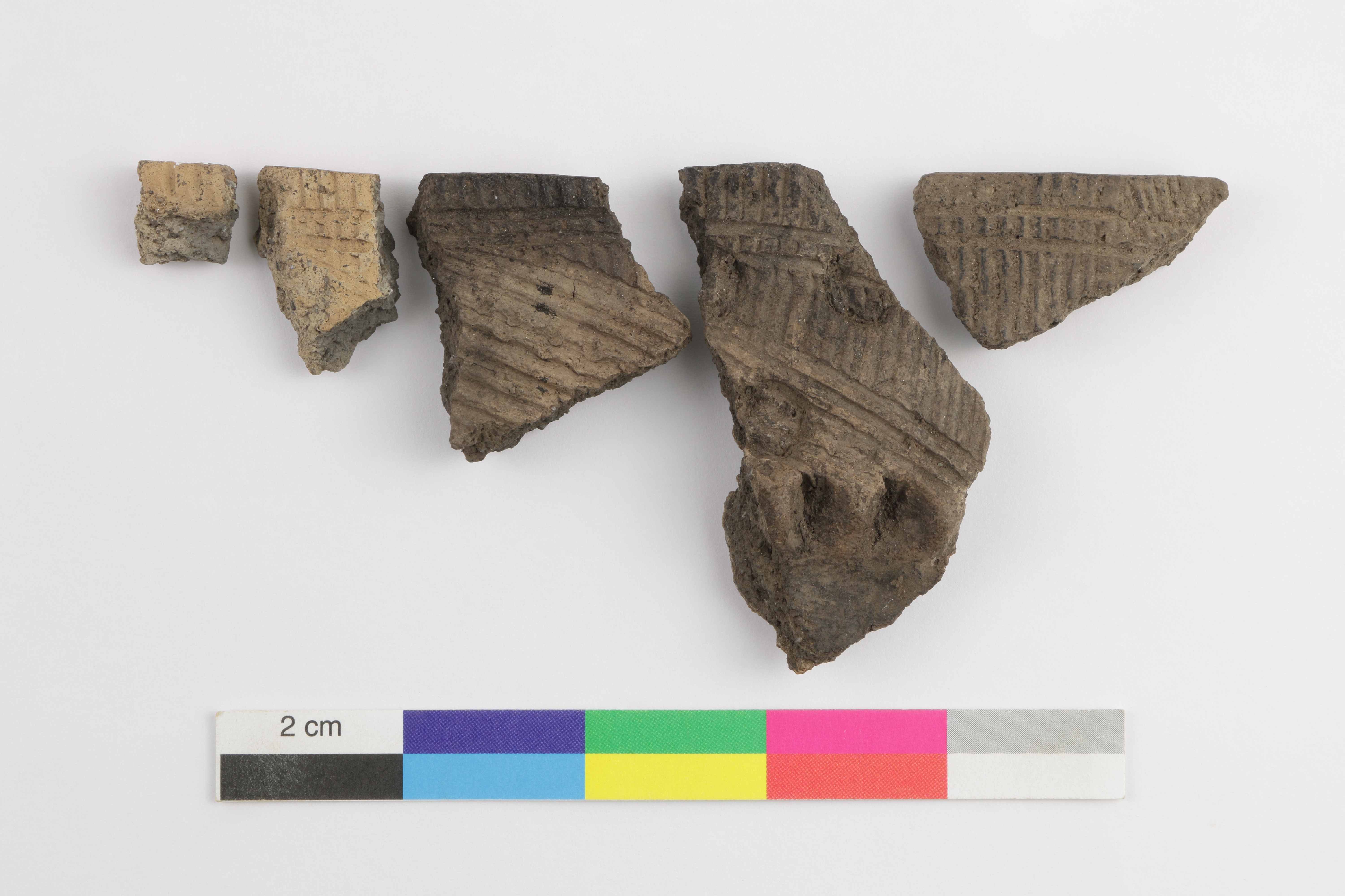 Les fragments de vase à parement et à crestellations sont associés à un récipient fabriqué au cours du Sylvicole supérieur (1 000 à 450 ans avant aujourd'hui). Le vase incomplet, en céramique de type autochtone, est composé de cinq fragments correspondant à une portion du rebord et du col du vase. Celui-ci comprend un parement et présente l'amorce d'une crestellation. L'objet modelé au battoir et à l'enclume est marqué d'une décoration caractéristique de cette période, soit un parement décoré et encadré ainsi qu'un ensemble de motifs complexes exécutés par incisions. Il comporte également des encoches au niveau du col ainsi qu'une application triangulaire de marque de roseau. Ce dernier motif est souvent interprété comme étant une figuration humaine. Il est fréquemment représenté sur les céramiques produites par les groupes iroquoiens du Saint-Laurent, à l'instar des autres motifs présents sur l'objet.