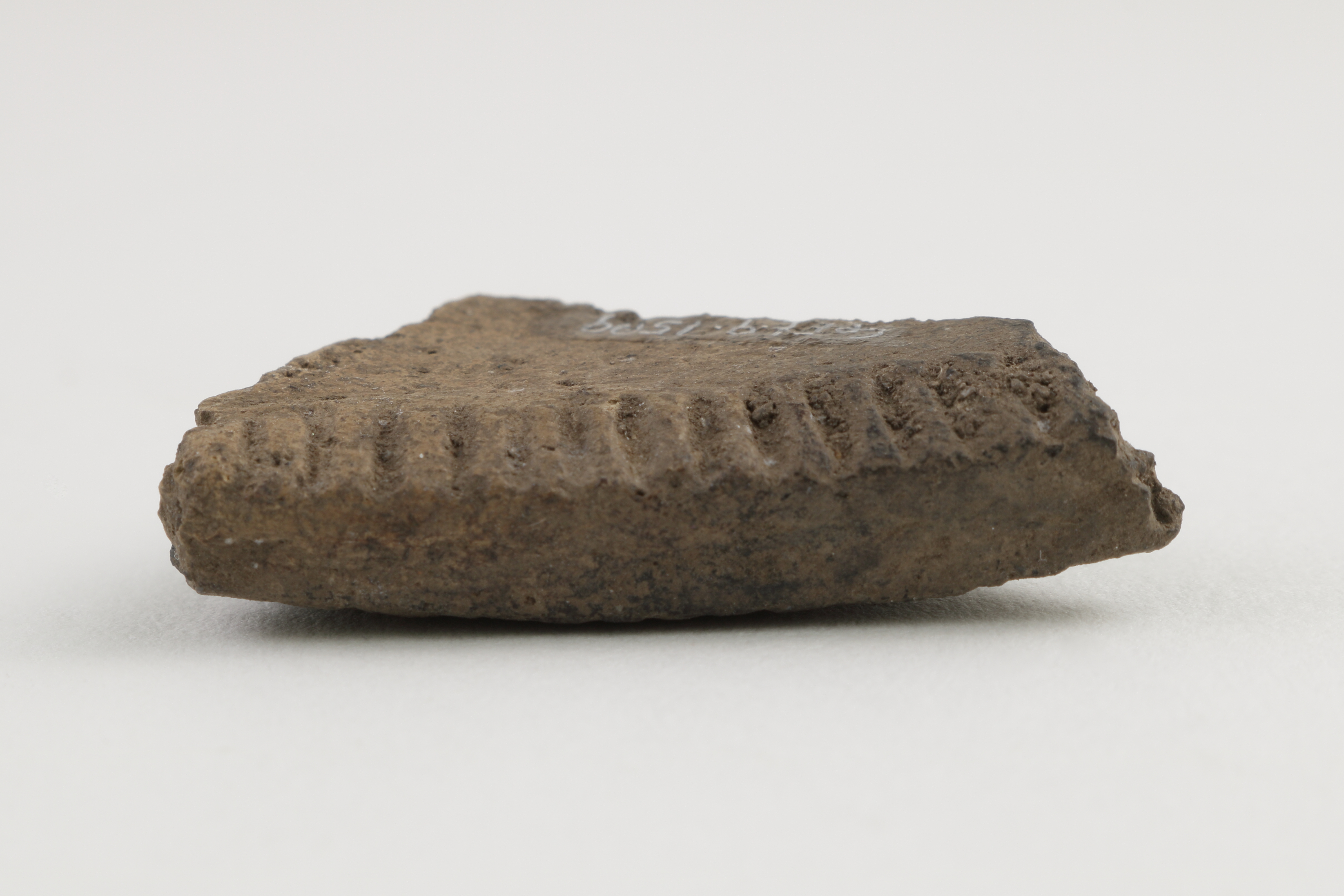 Les fragments de vase à parement et à crestellations sont associés à un récipient servant principalement à la conservation et à l'entreposage des aliments fabriqué au cours du Sylvicole supérieur (1 000 à 450 ans avant aujourd'hui). Le vase incomplet, en céramique de type autochtone, est composé de cinq fragments correspondant à une portion du rebord et du col du vase. Ce dernier comprend un parement et l'amorce d'une crestellation. Le plus gros fragment mesure 5,5 cm de hauteur, 2,3 cm de largeur et a une épaisseur de 0,7 cm au niveau de la paroi. Le parement a une hauteur de 4,1 cm.