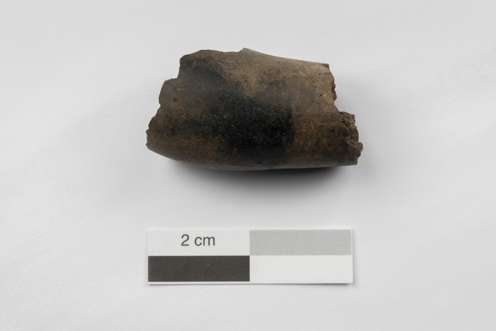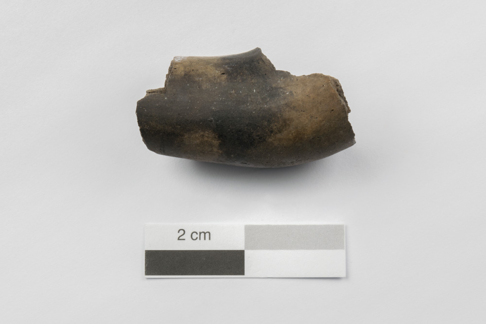 Ce fragment correspond à une partie du coude d'une pipe datant du Sylvicole supérieur (1 000 à 450 ans avant aujourd'hui). L'objet a été produit à partir d'argile qui a été modelée puis lissée. Après séchage, il a été lustré puis cuit.