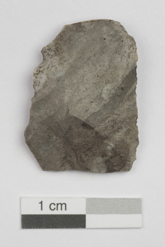 Cet éclat retouché en chert Onondaga, une matière dont les sources sont localisées dans la région du Niagara, date de la Préhistoire. Il a été débité d'un biface, puis taillé suivant la méthode unifaciale.