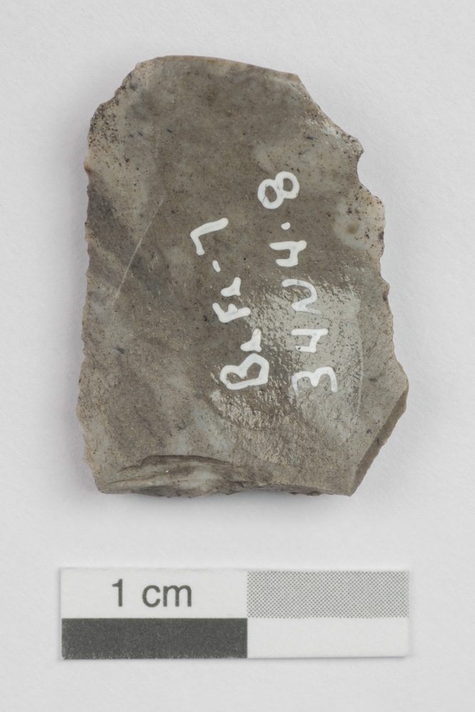 L'éclat retouché, outil à fonction indéterminée, date de la Préhistoire. Taillé dans du chert Onondaga de couleur grise marbrée, il mesure 1,72 cm de large sur 2,35 cm de long et 0,34 cm d'épaisseur.