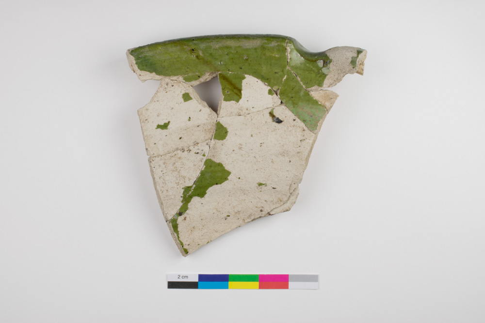 Ces fragments appartiennent à une terrine en terre cuite glaçurée dite « verte de France » qui aurait été produite entre le début du XVIIe siècle et le milieu du XVIIIe siècle, en France. L'objet a été fabriqué à partir d'argile qui a été modelée au tour et à la main, cuite, enduite de glaçure puis cuite à nouveau.