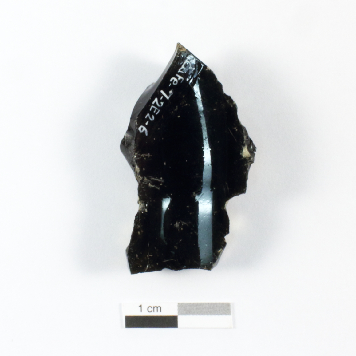 L'outil taillé peut être utilisé comme perçoir ou grattoir pour travailler divers matériaux souples. Cet objet, entier, est fabriqué à partir d'un fragment de bouteille à boisson alcoolisée en verre de couleur vert foncé. L'outil mesure 4,3 cm de longueur, 2,5 cm de largeur et a une épaisseur de 0,9 cm.