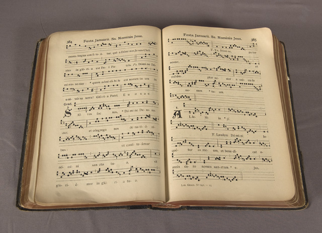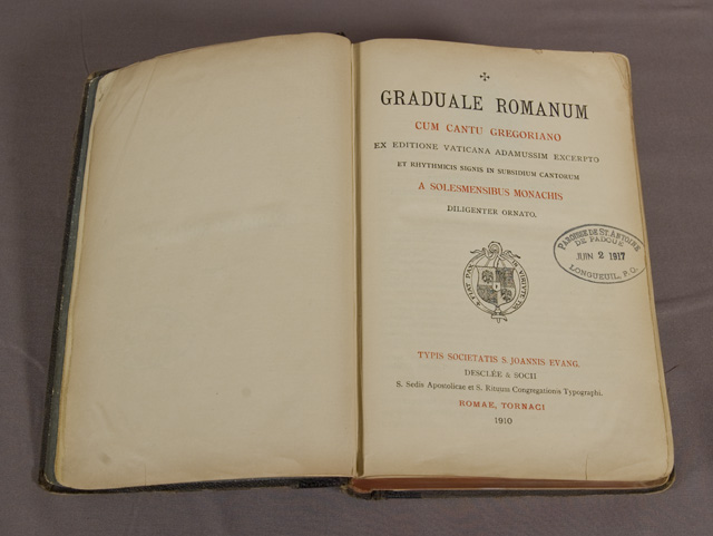 Sur une page, h. : GRADUALE ROMANUM / CUM CANTU GREGORIANO / EX EDITIONE VATICANA ADAMUSSIM EXCERPTO / ET RHYTMICIS SIGNIS IN SUBSIDIUM CANTORUM / A SOLESMENSIBUS MONACHIS / DILIGENTER ORNATO.; sur une page, c., dans les armoiries : FIAT PAX IN VIRTUTE TUA; sur une page, c.d. : [Présence]; sur une page, b.c. : TYPIS SOCIETATIS S. JOANNIS EVANG. / DESCLÉE 7 SOCII / S. Sedis Apostolicae et S. Rituum Congregationis Typographi. / ROMAE, TORNACI / 1910