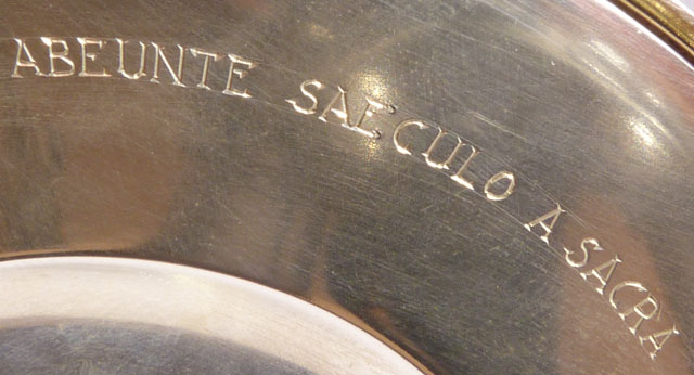 Sous le pied : IOANNES XXIII P.M. TEMPLO PRINCIPI ET BASILICAE NOSTRAE DOMINAE QUEBECENSI TERTIO ABEUNTE SAECULO A SACRA HIERARCHIA IN CANADA INCOHATA D.D. / ANNO MCMLIX