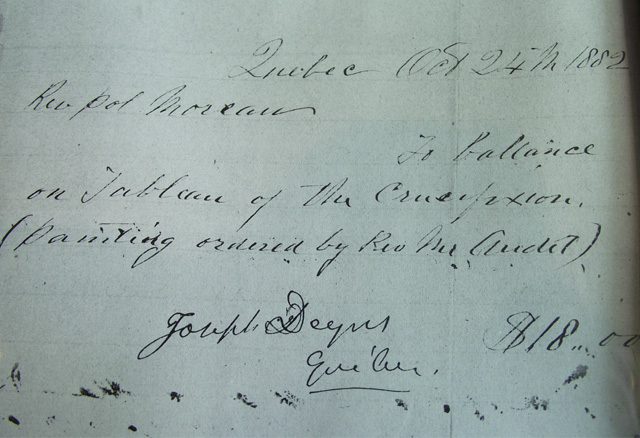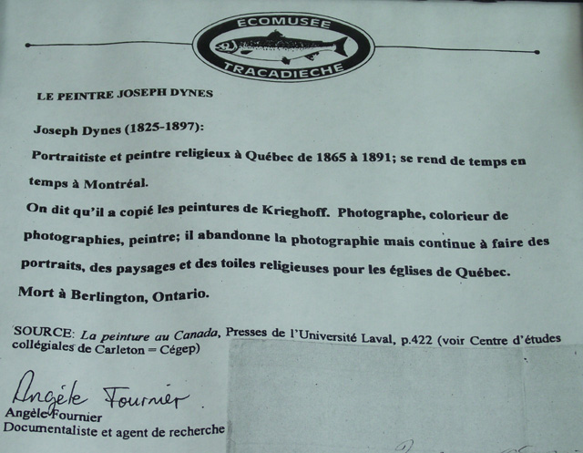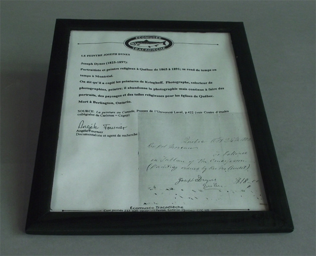 Sur le document, h. : ECOMUSEE / TRACADIECHE / LE PEINTRE JOSEPH DYNES / Joseph Dynes (1825-1897): / Portraitiste et peintre religieux à Québec de 1865 à 1891; se rend de temps en / temps à Montréal. / On dit qu'il a copié les peintures de Krieghoff. Photographe, colorieur de / photographies, peintre; il abandonne la photographie mais continue à faire des / portraits, des paysages et des toiles religieuses pour les églises de Québec. / Mort à Berlington, Ontario. / SOURCE: La peinture au Canada, Presses de l'Université Laval, p.422 (voir Centre d'études / collégiales de Carleton = Cégep) / Angèle Fournier / Angèle Fournier / Documentaliste et agent de recherche; sur le document, b.d. : Quebec Oct 24 th 1882 / Rev Pol Moreau / To ballance / on Tableau of the Crucifixion. / (painting ordered by Rev [...] Audet) / Joseph Dynes $18.00 / Québec.; sur le document, b. : Écomusée Tracadièche / Case postale 237, 629, boulevard Perron, Carleton (Quebec) G0C 1J0 / Téléphone : (418) 364-7073 Télécopieur : (418) 364-7314