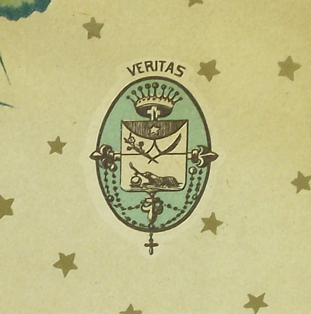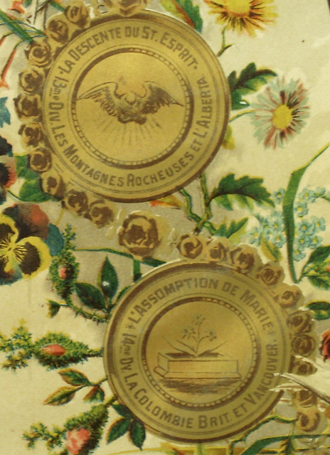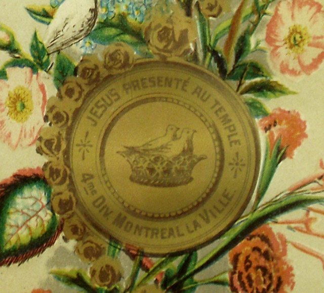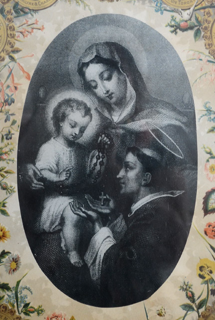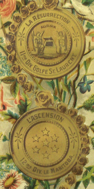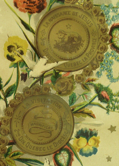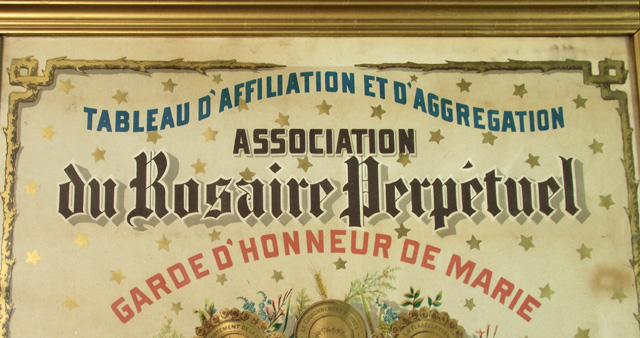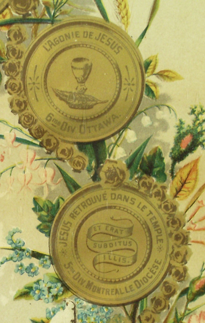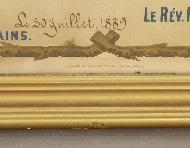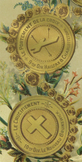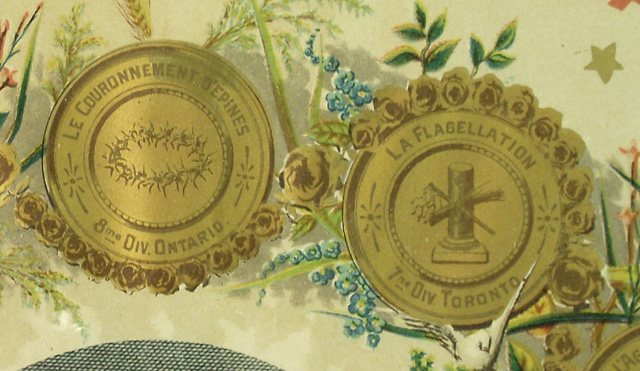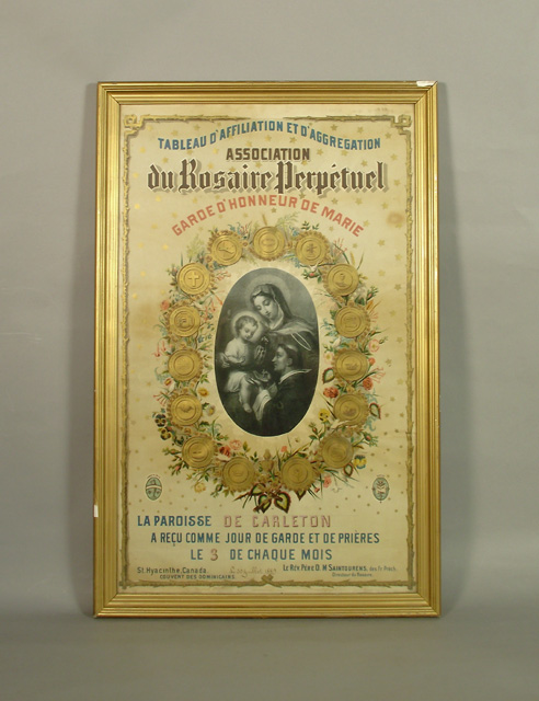 H. : TABLEAU D'AFFILIATION ET D'AGGREGATION / ASSOCIATION / du Rosaire Perpétuel / GARDE D'HONNEUR DE MARIE; c., dans un médaillon : LE COURONNEMENT D'EPINES / 8me DIV. ONTARIO.; c., dans un médaillon : LA FLAGELLATION / 7me DIV. TORONTO; c., dans un médaillon : L'AGONIE DE JESUS / 6me DIV. OTTAWA.; c., dans un médaillon : JESUS RETROUVÉ DANS LE TEMPLE / ET ERAT / SUBDITUS / ILLIS. / 5me DIV. MONTREAL LE DIOCÈSE.; c., dans un médaillon : JESUS PRESENTÉ AU TEMPLE / 4me DIV. MONTREAL LA VILLE.; c., dans un médaillon : LA NAISSANCE DE JESUS / 3me DIVISION QUEBEC LA PROVINCE; c., dans un médaillon : LA VISITATION / MAGNIFICAT / 2me DIV. QUEBEC LE DIOCÈSE; c., dans un médaillon : L'ANNONCIATION / 1ere DIV. ST. HYACINTHE.; c., dans un médaillon : LE COURONNEMENT DE MARIE / 15me DIV. LA BAIE D'HUDSON.; c., dans un médaillon : L'ASSOMPTION DE MARIE / 14me DV. LA COLOMBIE BRIT. ET VANCOUVER.; c., dans un médaillon : LA DESCENTE DU ST. ESPRIT / 13me DIV. LES MONTAGNES ROCHEUSES ET L'ALBERTA.; c., dans un médaillon : L'ASCENSION / 12me DIV. LE MANITOBA.; c., dans un médaillon : LA RÉSURRECTION / ALLELUIA / 11me DIV. GOLFE ST. LAURENT.; c., dans un médaillon : LE CRUCIFIEMENT / 10me DIV. LE NOUVEAU BRUNSWICK.; c., dans un médaillon : LE PORTEMENT DE LA CROIX / 9me DIV. HALIFAX & CHARLOTTETOWN.; b.g. : LUMEN IN COELO; b.d. : VERITAS; b.g. : 1994; b. : LA PAROISSE DE CARLETON / A REÇU COMME JOUR DE GARDE ET DE PRIÈRES / LE 3 DE CHAQUE MOIS / St.Hyacinthe, Canada. Le 30 juillet, 1889 / COUVENT DES DOMINICAINS. / LE RÉV. PÈRE D. M SAINTOURENS, des Fr. Prêch. / Directeur du Rosaire. / CANADA BANK NOTE CO. LIM. LITH. MONTREAL