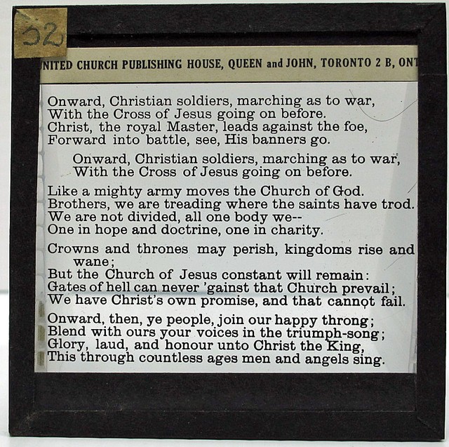 H.g., étiquette : 32; h.g. : UNITED CHURCH PUBLISHING HOUSE, QUEEN and JOHN, TORONTO 2 B, ONT / Onward, Christian soldiers, marching as to war, / With the Cross of Jesus going on before. / Christ, the royal Master, leads against the foe, / Forward into battle, see, His banners go. / Onward, Christian soldiers, marching as to war, / With the Cross of Jesus going on before. / Like a mighty army moves the Church of God. / Brothers, we are treading where the saints have trod. / We are not divided, all one body we-- / One in hope and doctrine, one in charity. / Crowns and thrones may perish, kingdoms rise and wane ; / But the Church of Jesus constant will remain ; / We have Christ's own promise, and that cannot fail. / Onward, then, ye people, join our happy throng ; / Blend with ours your voices in the triumph-song ; / Glory, laud, and honour unto Christ the King, / This through countless ages men and angels sing.