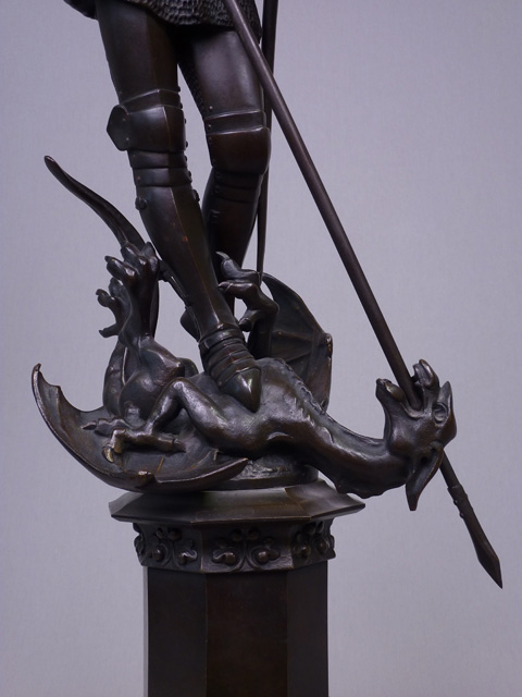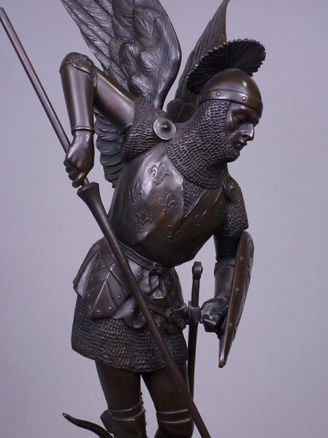 Cette statuette de saint Michel Archange est le cadeau qu'ont offert les Soeurs du Bon-Pasteur de Chicoutimi à Mgr Michel-Thomas Labrecque (1849-1932) à l'occasion de son jubilé d'or sacerdotal le 28 mai 1926. C'est Mgr Léon Maurice, V.G. (1889-1973) qui suggéra l'achat d'une sculpture de saint Michel aux religieuses du Bon-Pasteur. Il accepta d'être leur agent et s'adressa à mademoiselle Rosa Michu, une parisienne distinguée, qui commanda et fit expédier ce saint Michel de bronze par Pilet. Le bronze fut acheté à un monsieur de Paris, sûrement monsieur Guillemard, pour être chargé par un bateau à vapeur, probablement le Baisford.