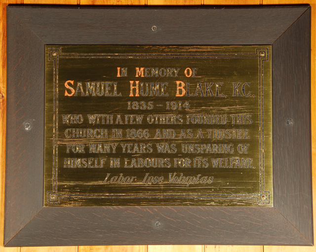 H.c. : IN MEMORY OF / SAMUEL HUME BLAKE. K.C.. / 1835-1914 / WHO WITH A FEW OTHERS FOUNDED THIS / CHURCH IN 1866 ANS AS A TRUSTEE / FOR MANY YEARS WAS UNSPARING OF / HIMSELF IN LABOURS FOR ITS WELFARE. / Labor Ipse Volutas