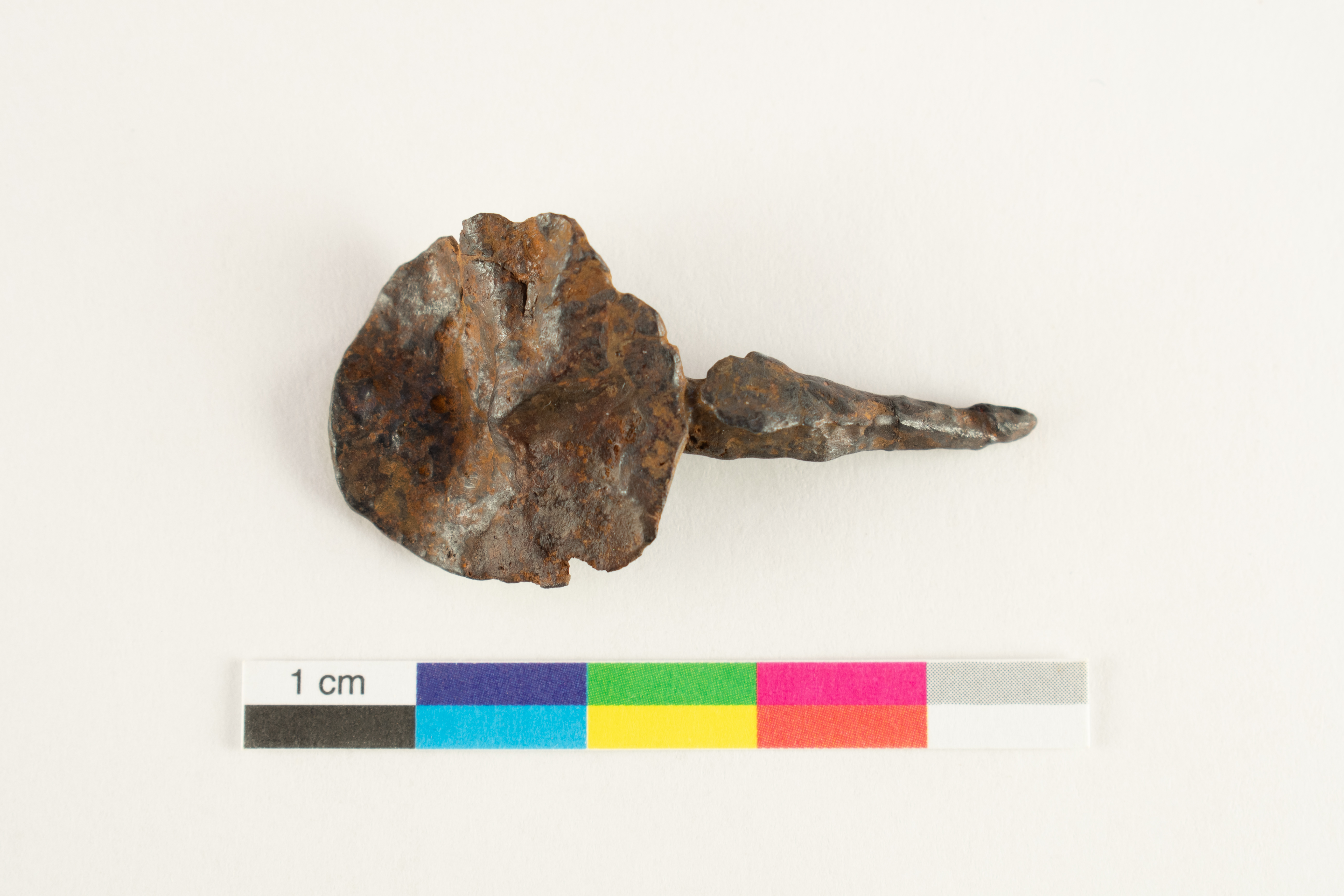 La broquette, provenant d'un site occupé entre 1541 à 1543, est un petit clou utilisé pour fixer divers objets et matériaux. La broquette en fer forgé, incomplète, comprend une large tête circulaire, concave et irrégulière, et une tige carrée à pointe effilée légèrement recourbée. L'objet mesure 4,0 cm de longueur et la tête possède un diamètre de 2,34 cm.