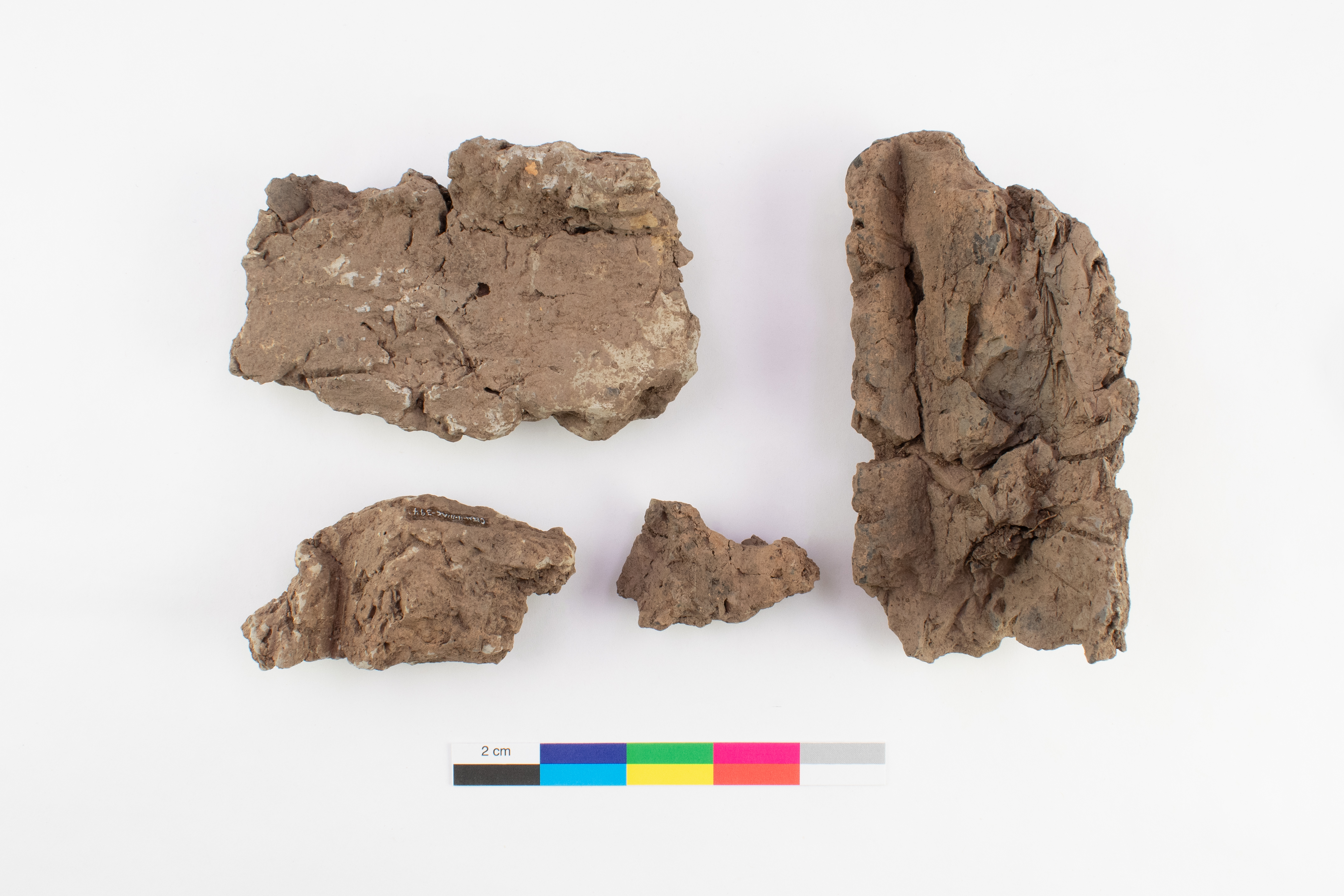Gros fragments d'argile grisâtre avec empreintes de bois dont deux possèdent une surface extérieure convexe.