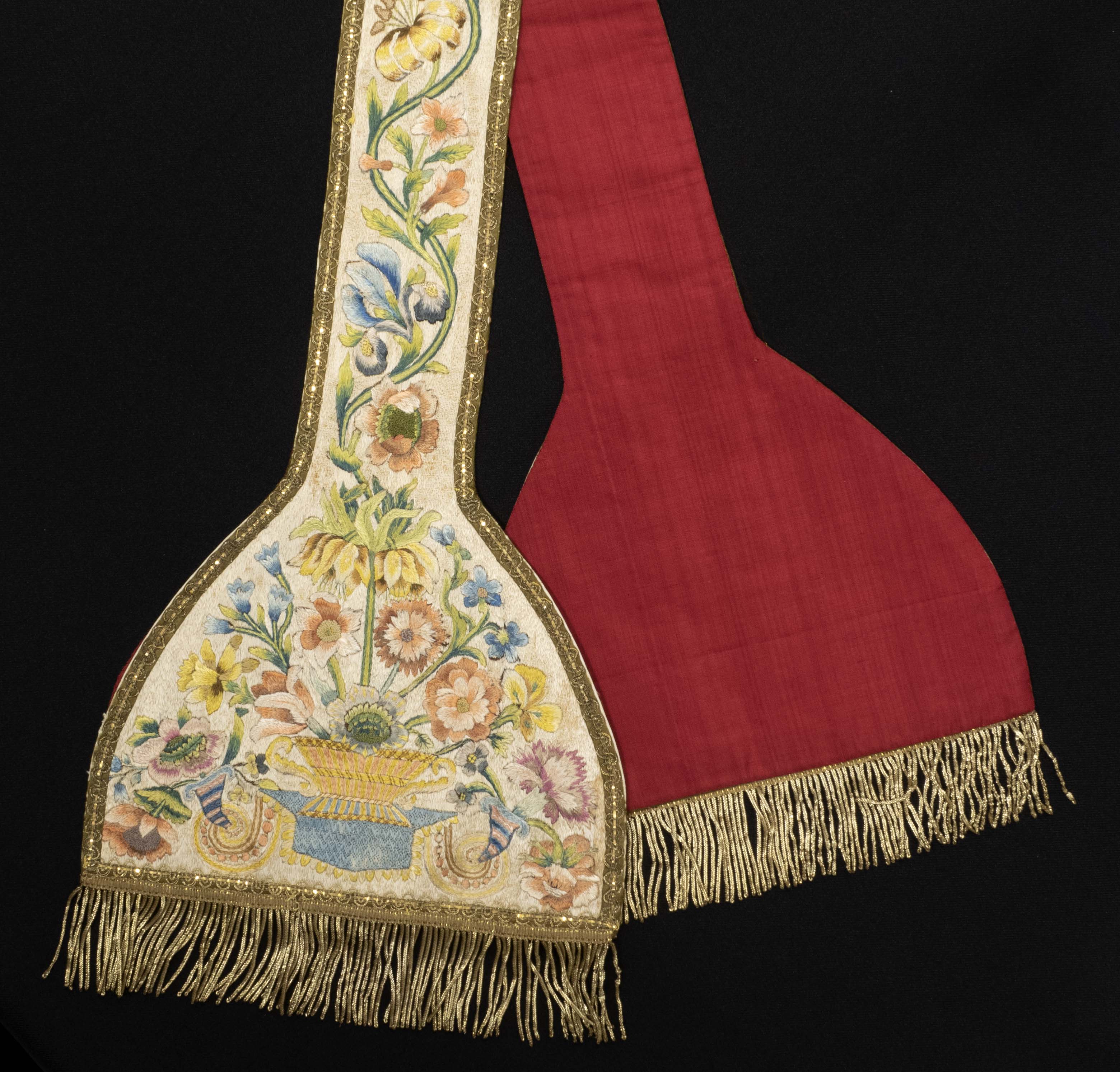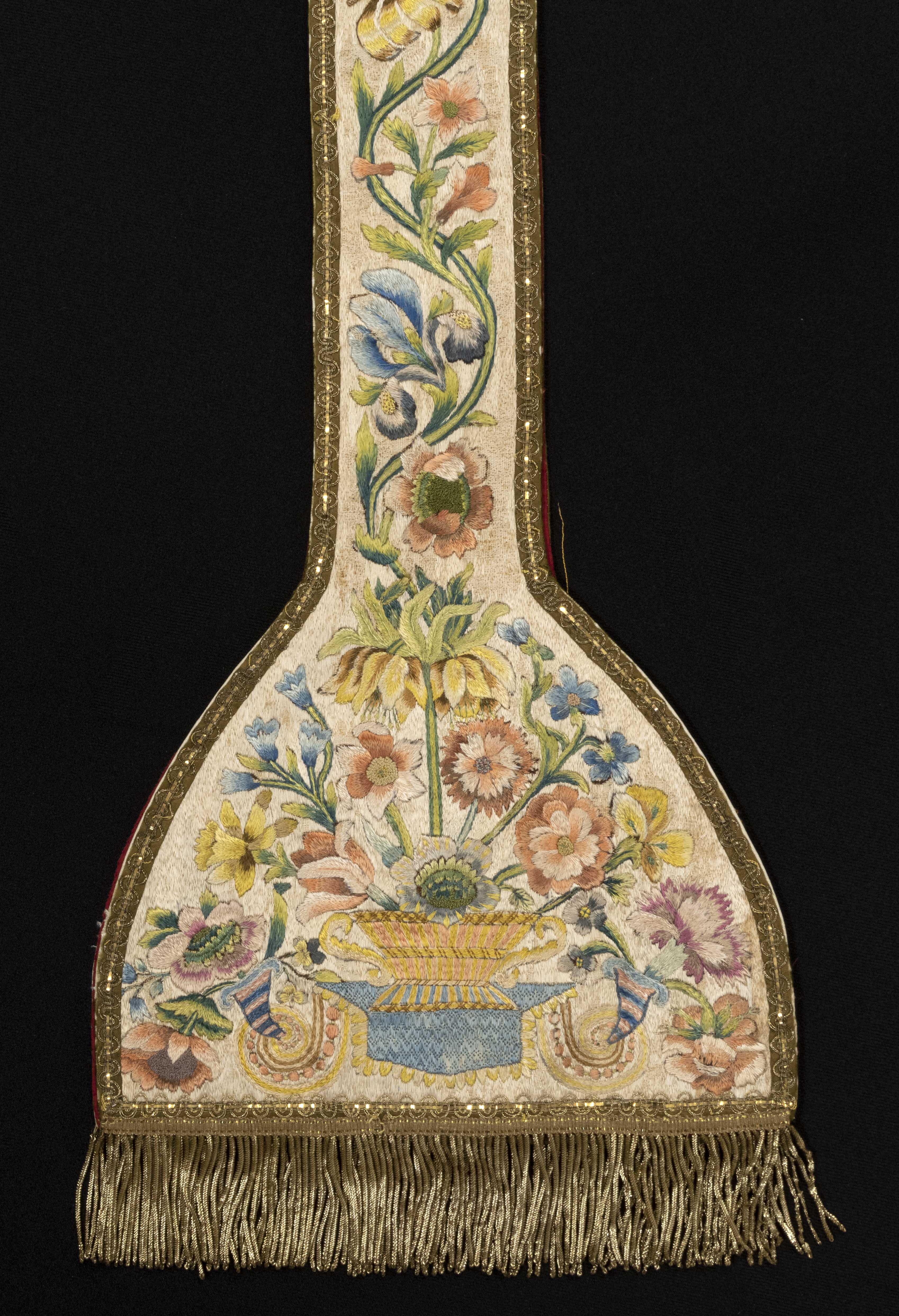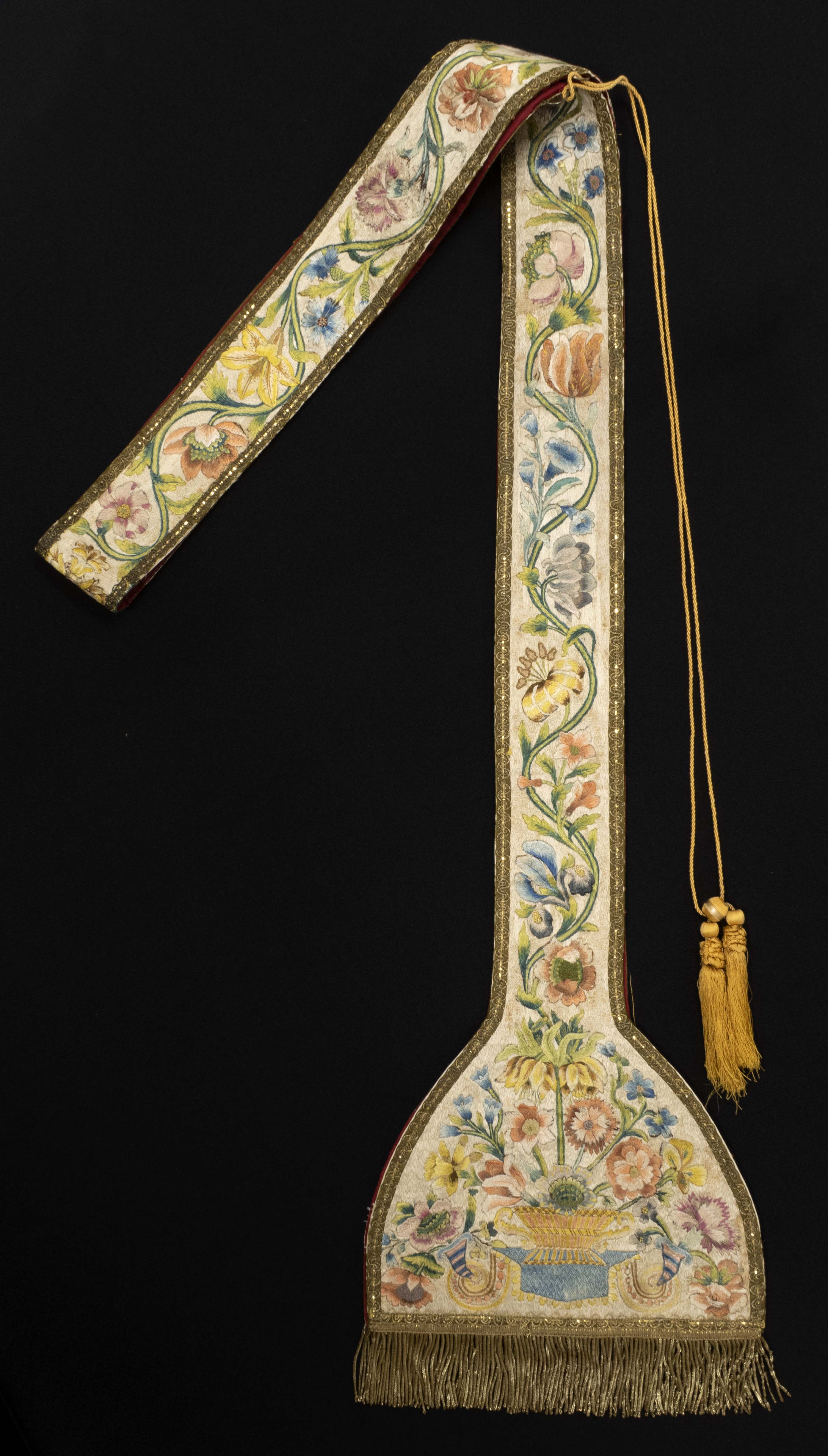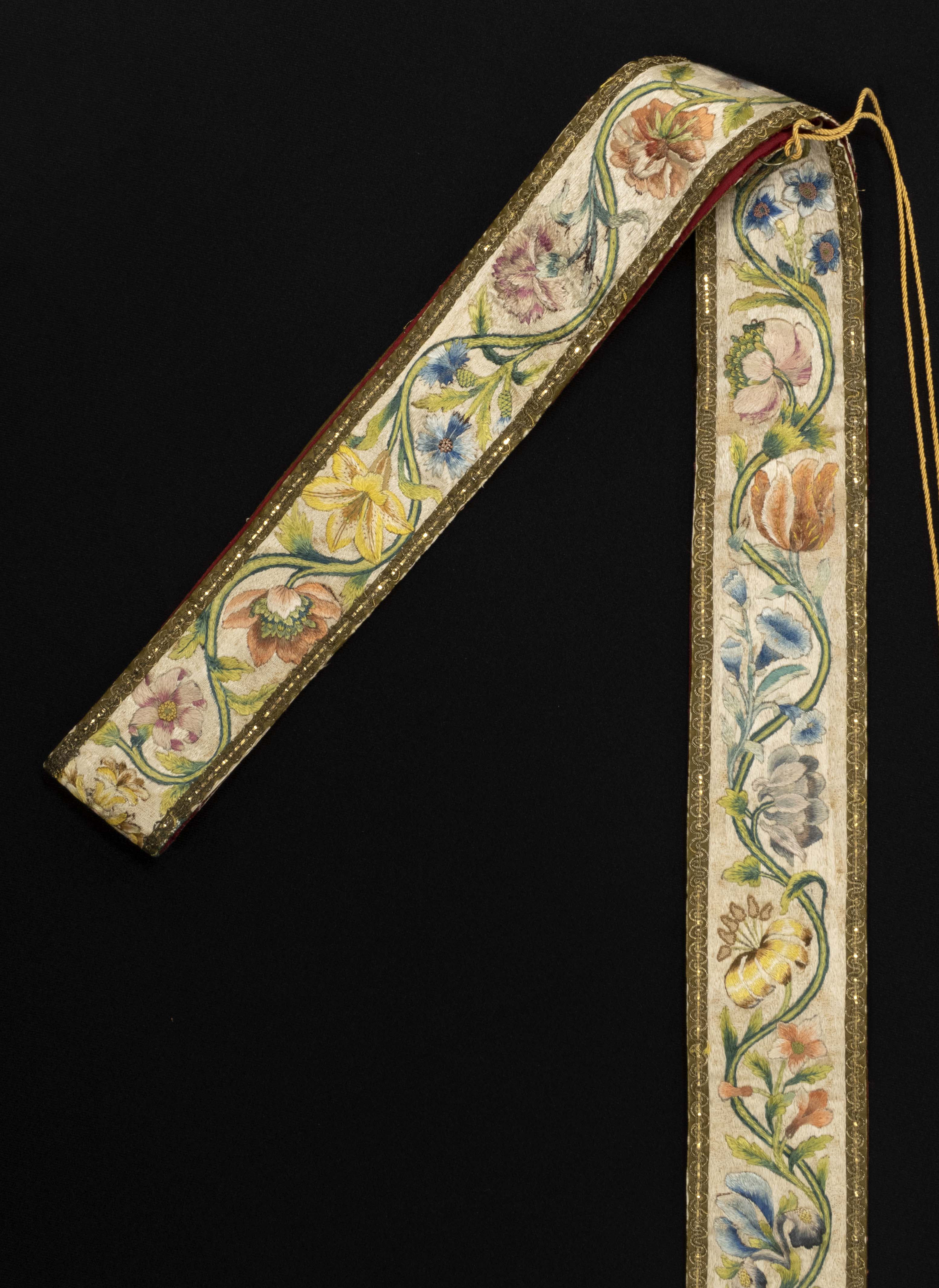 Longue bande de tissu, brodée de motifs floraux, pliée en deux moitiés; doublure de tissu bourgogne; frange de cannetille dorée; cordon de fils dorés terminé par deux glands dorés.