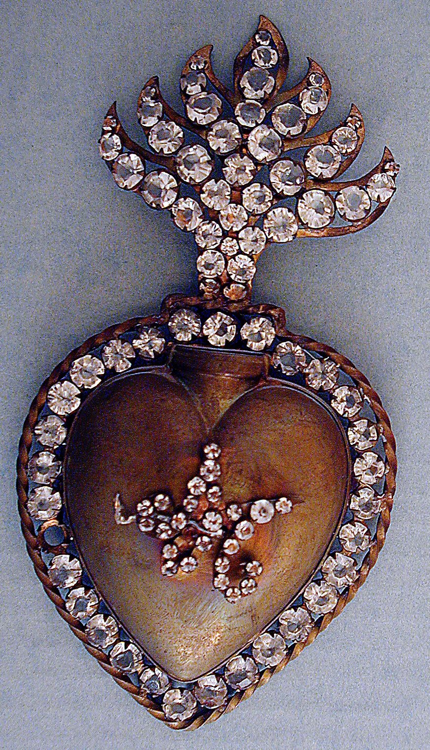 Ce coeur de dévotion en métal cuivreux mesure 11 cm de hauteur, 5,2 cm de largeur et 1,3 cm de profondeur. Produit durant la seconde moitié du XIXe siècle ou au début du XXe siècle, le coeur votif, aussi appelé coeur ex-voto, prend la forme du Sacré-Coeur. Une lettre « M » ornée de pierres translucides est apposée au centre du coeur. Le contour de l'objet est incrusté de pierres translucides de plus grande taille. Le même type de pierre couvre également la flamme qui se déploie en sept branches. Le coeur est constitué de deux parties, liées par une charnière, révélant à l'ouverture un réceptacle où ont pu être insérés des lettres contenant des voeux, des prières, le nom des donateurs, ou encore, de menus objets.