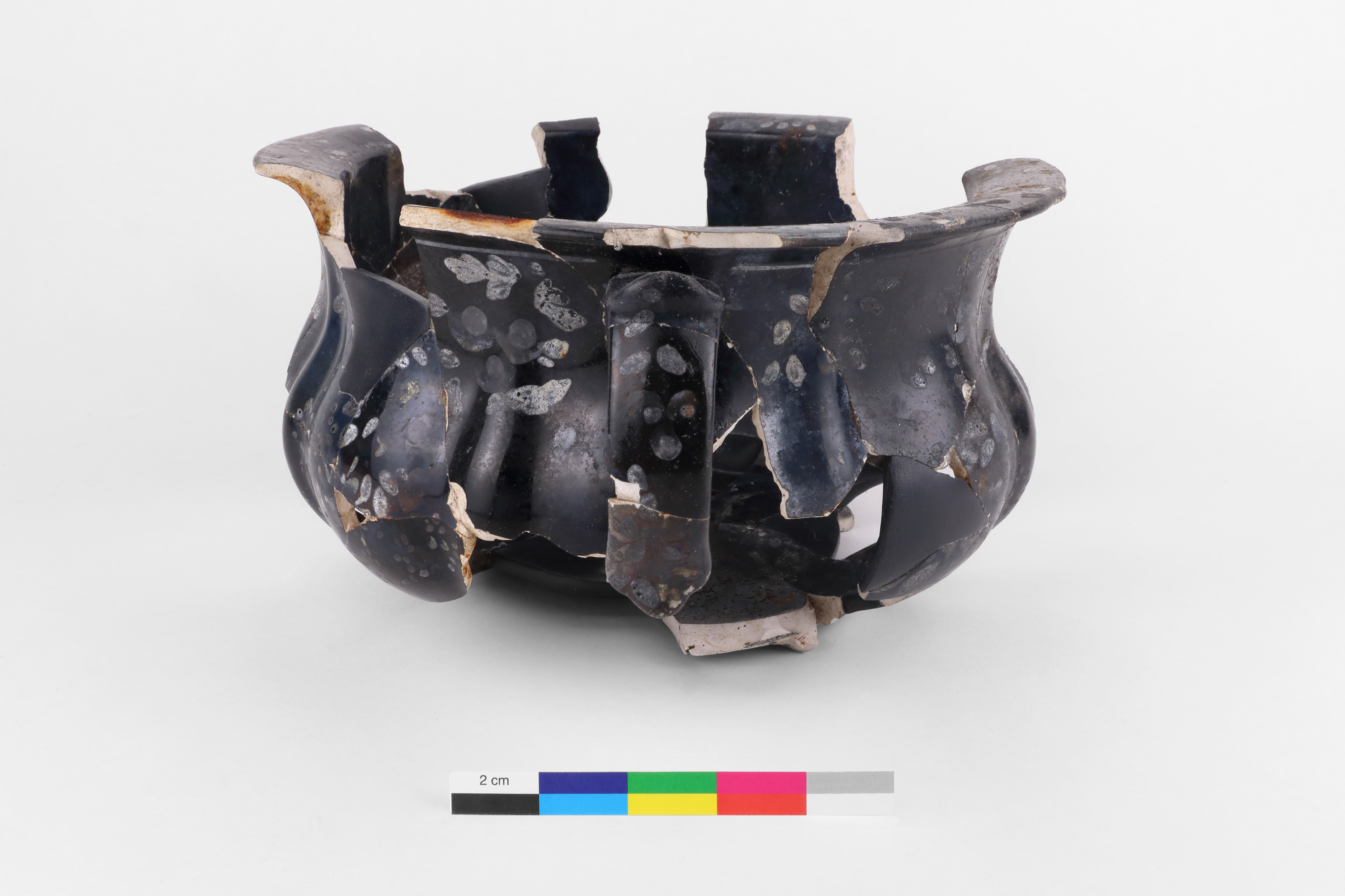 Glaçure complètement noircie sur le pot mais partiellement sur le couvercle.
