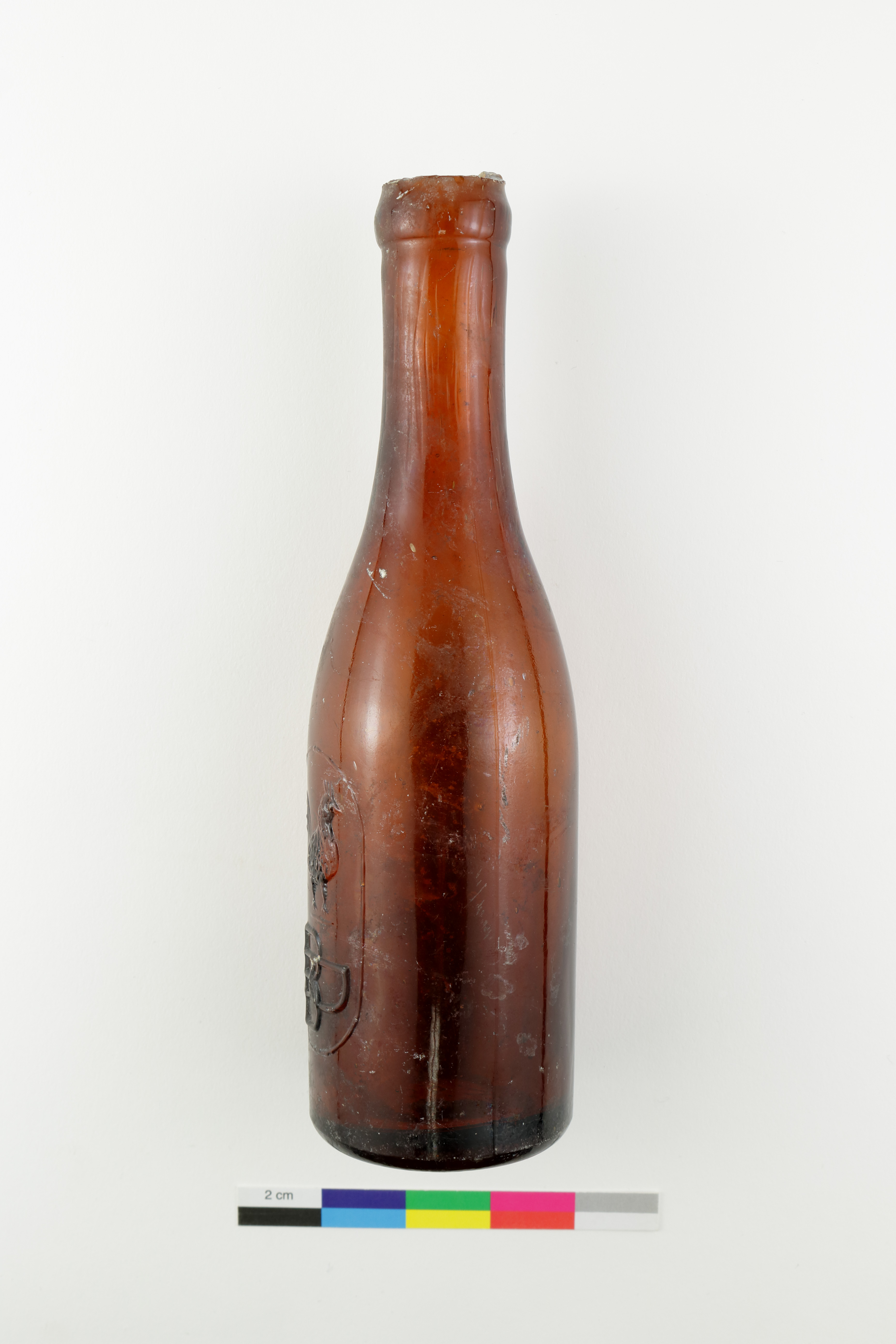 La bouteille à bière en verre coloré transparent brun est fabriquée dans un moule en deux parties avec base séparée entre 1892 et 1910, d'après son système de fermeture et le contexte de sa découverte. En effet, la bouteille est dotée d'un système de fermeture à capsule, ou de type Crown, breveté aux États-Unis en 1892 et encore utilisé de nos jours. Avec l'utilisation de la capsule en métal, la bouteille devient à usage unique. À l'origine, un disque de liège est disposé à l'intérieur. Par la suite, la capsule porte la marque du commerçant et le liège est remplacé par le linoléum, puis par le plastique. Ce système de fermeture nécessite un goulot à dessus aplati et à lèvre arrondie sur laquelle s'accroche la collerette de la capsule. À l'origine, il est fabriqué à la main, à la pince de finition. La capsule est de grandeur unique et s'adapte au goulot lors du capsulage.