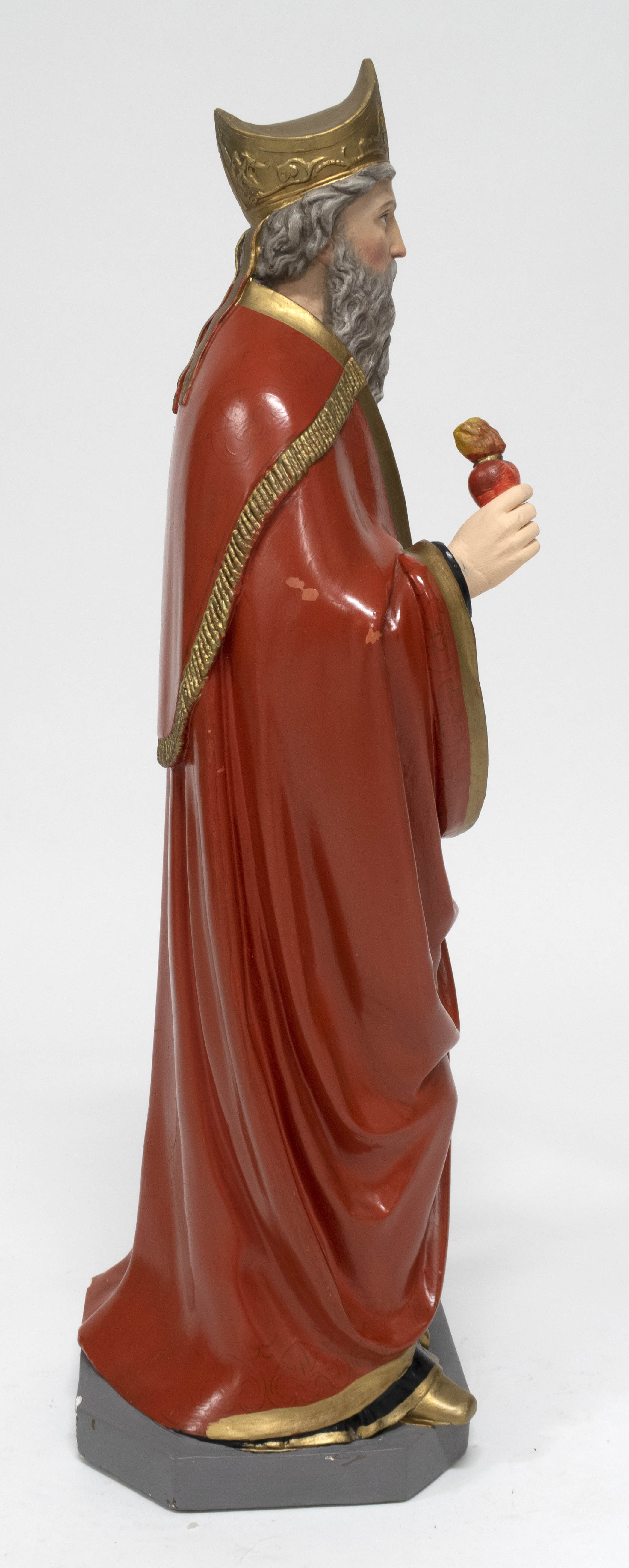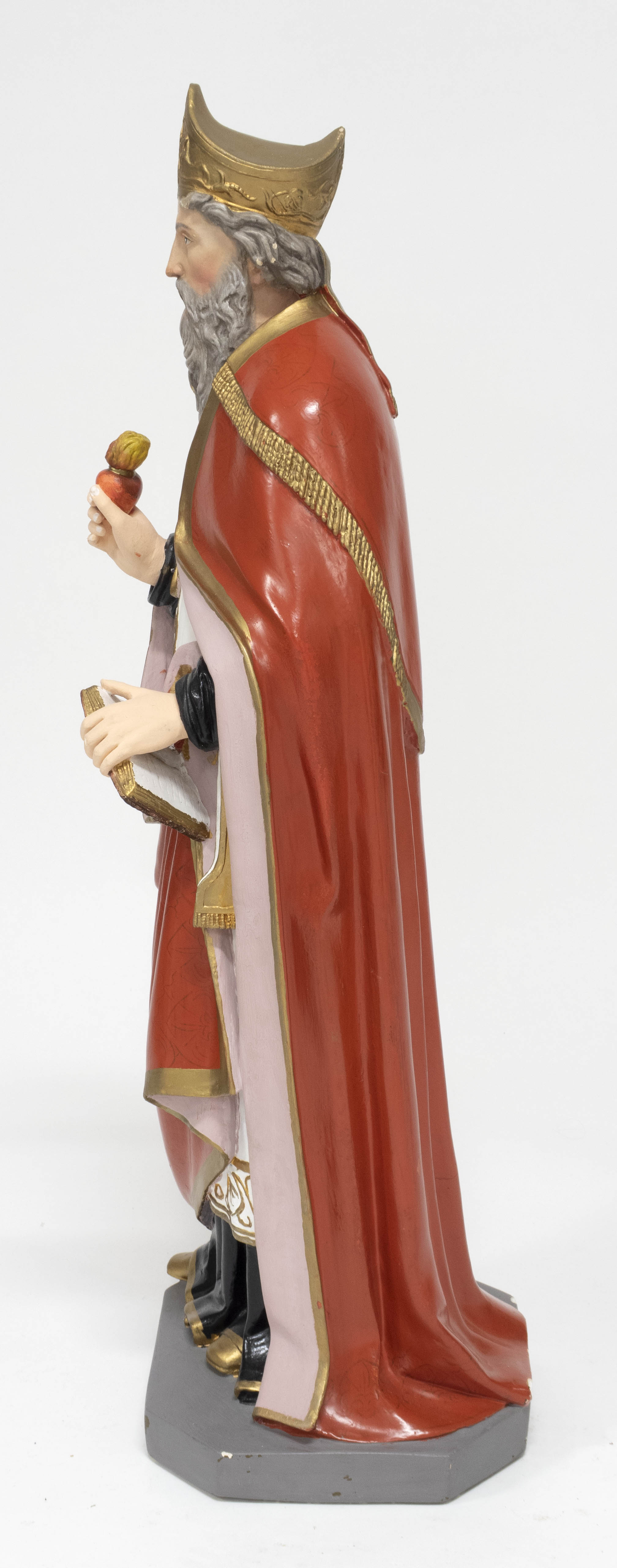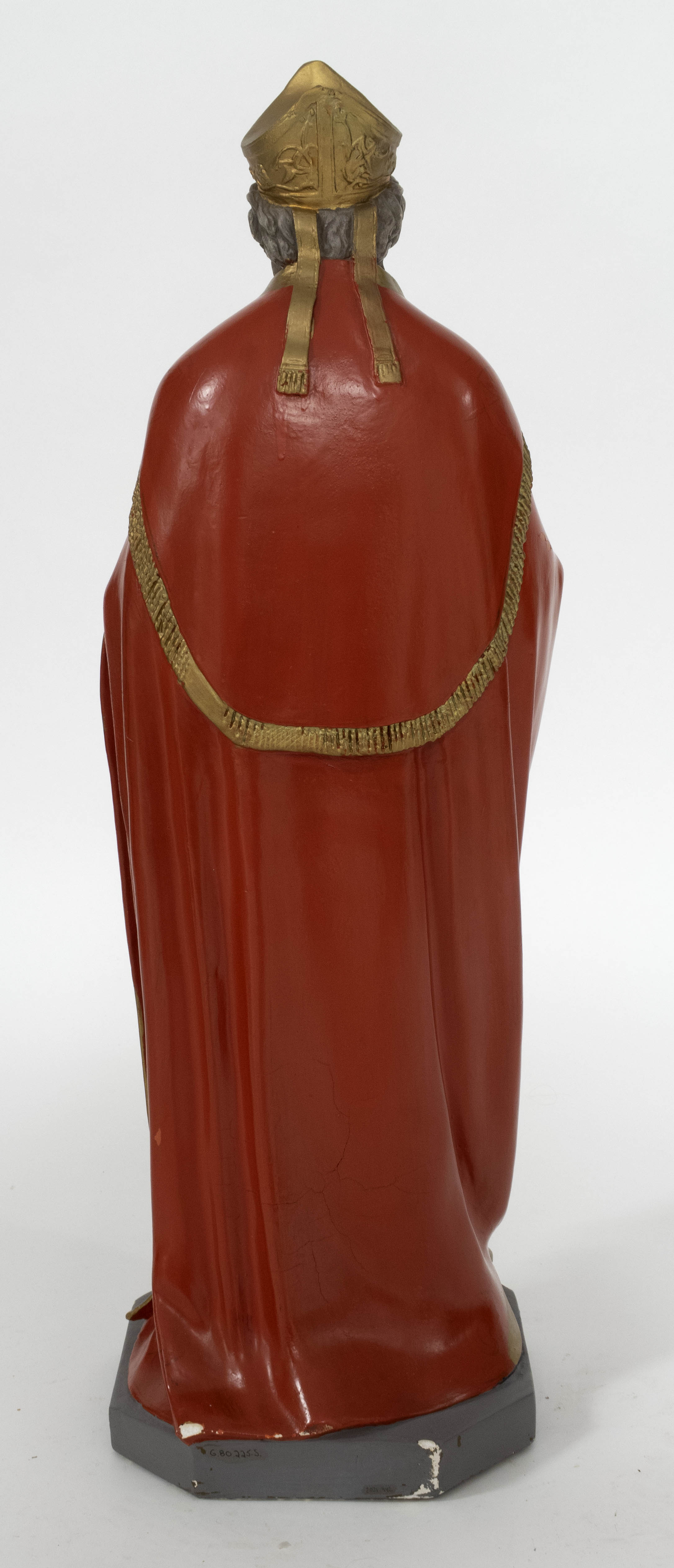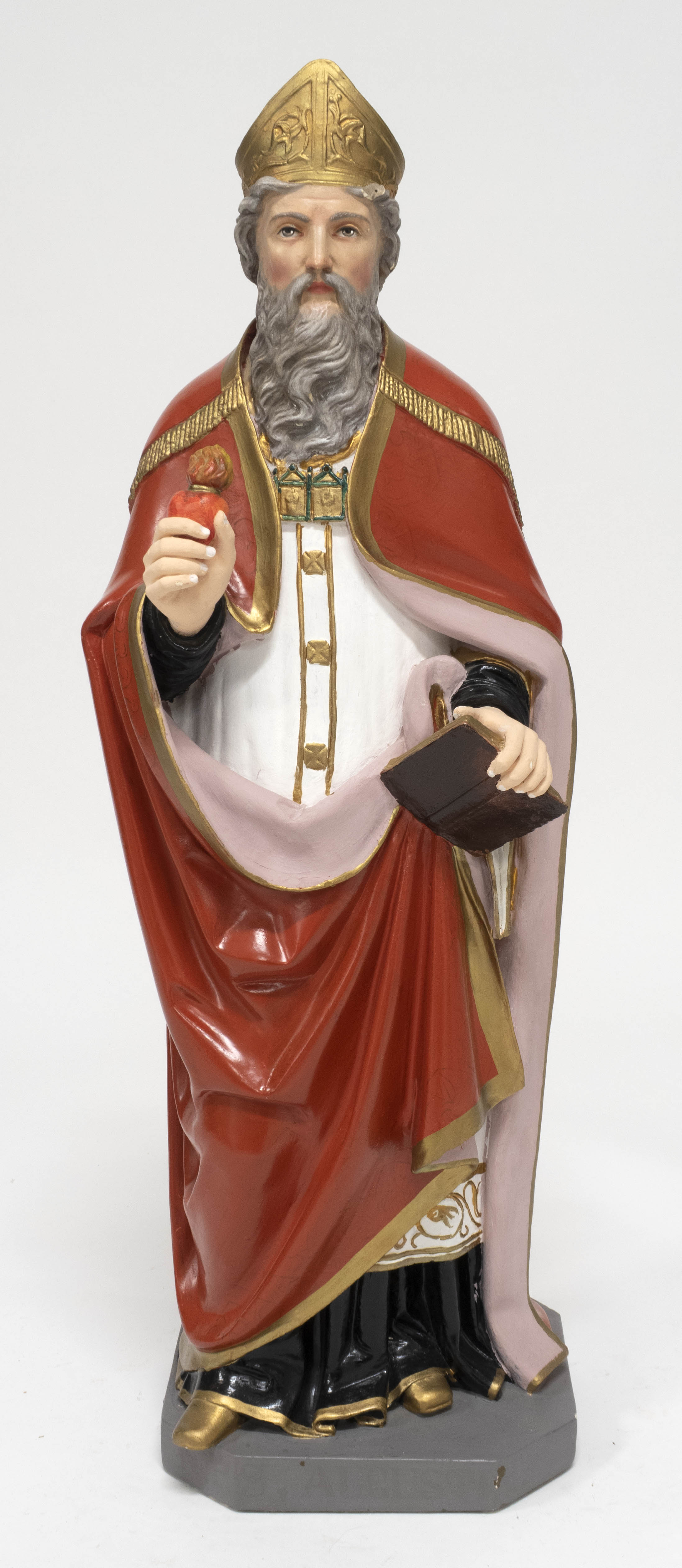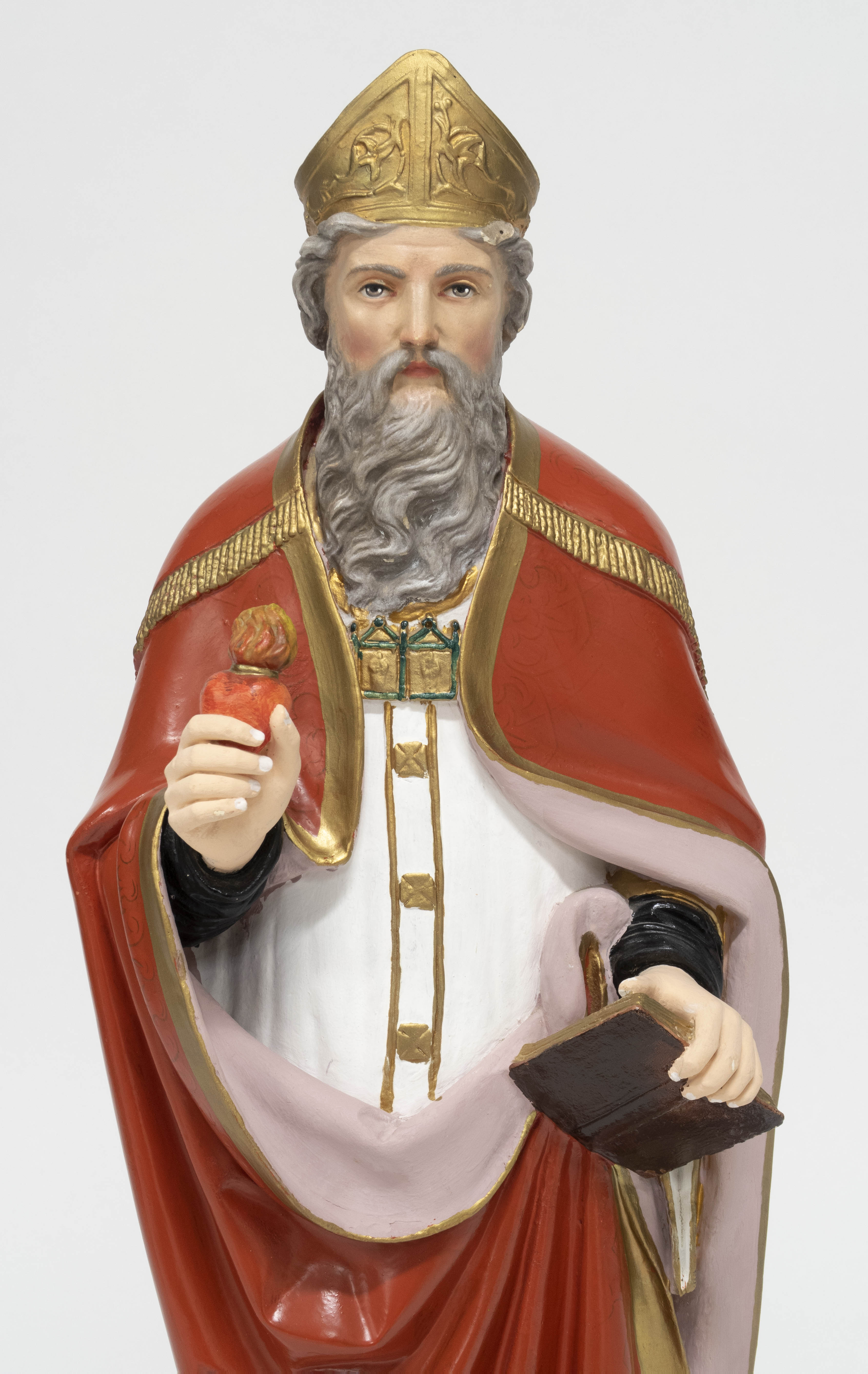 Statue de plâtre polychrome, montée sur un socle gris de forme carrée à pans coupés, représentant saint Augustin. Il est vêtu d'une soutane noire bordée d'une ligne dorée dans le bas, avec par-dessus, un rochet blanc et doré et une chape rouge au revers rose bordée de doré et ornée de franges dans le dos. Sa barbe et ses cheveux sont de couleur grise et il est coiffé d'une mitre dorée. Dans sa main droite, il tient un coeur enflammé et, dans sa main gauche, un livre ouvert à la couverture noire et à la tranche dorée.