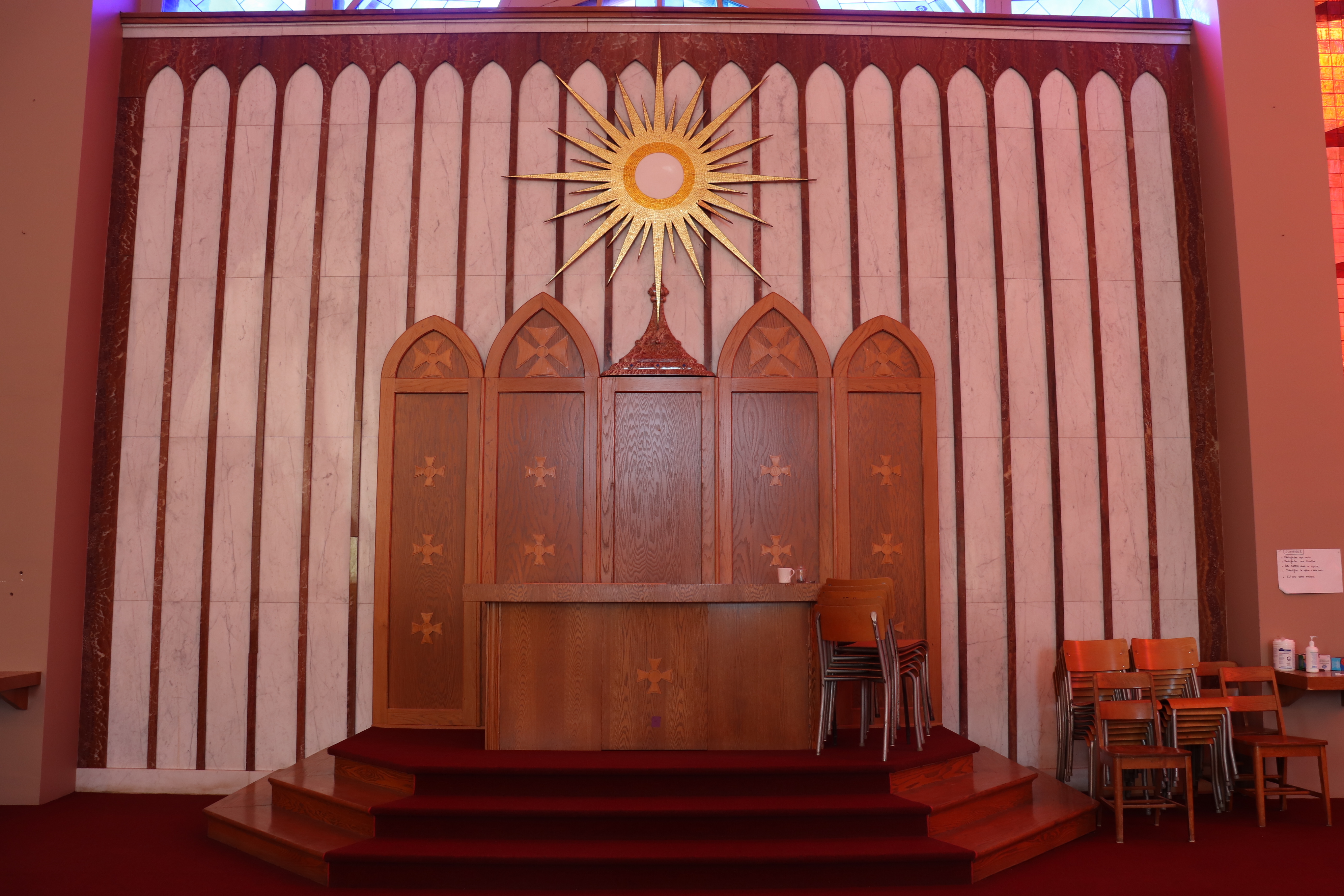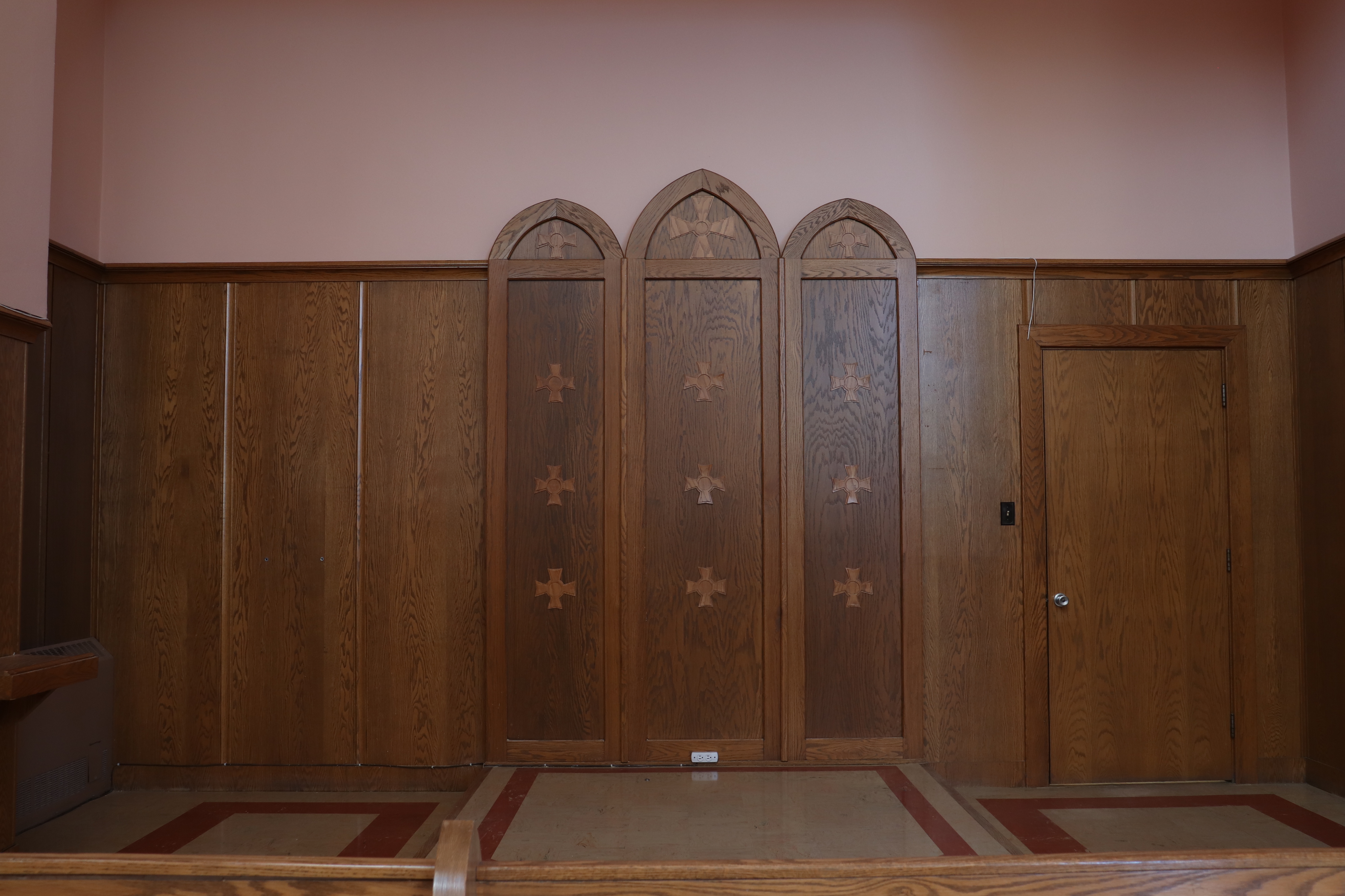 L'ensemble comprend le maître-autel et les deux autels latéraux en chêne, constitués d'une table et de panneaux muraux formant une arcade ogivale ornée de motifs de croix-ostensoirs. La table d'autel de l'autel latéral gauche est manquante.