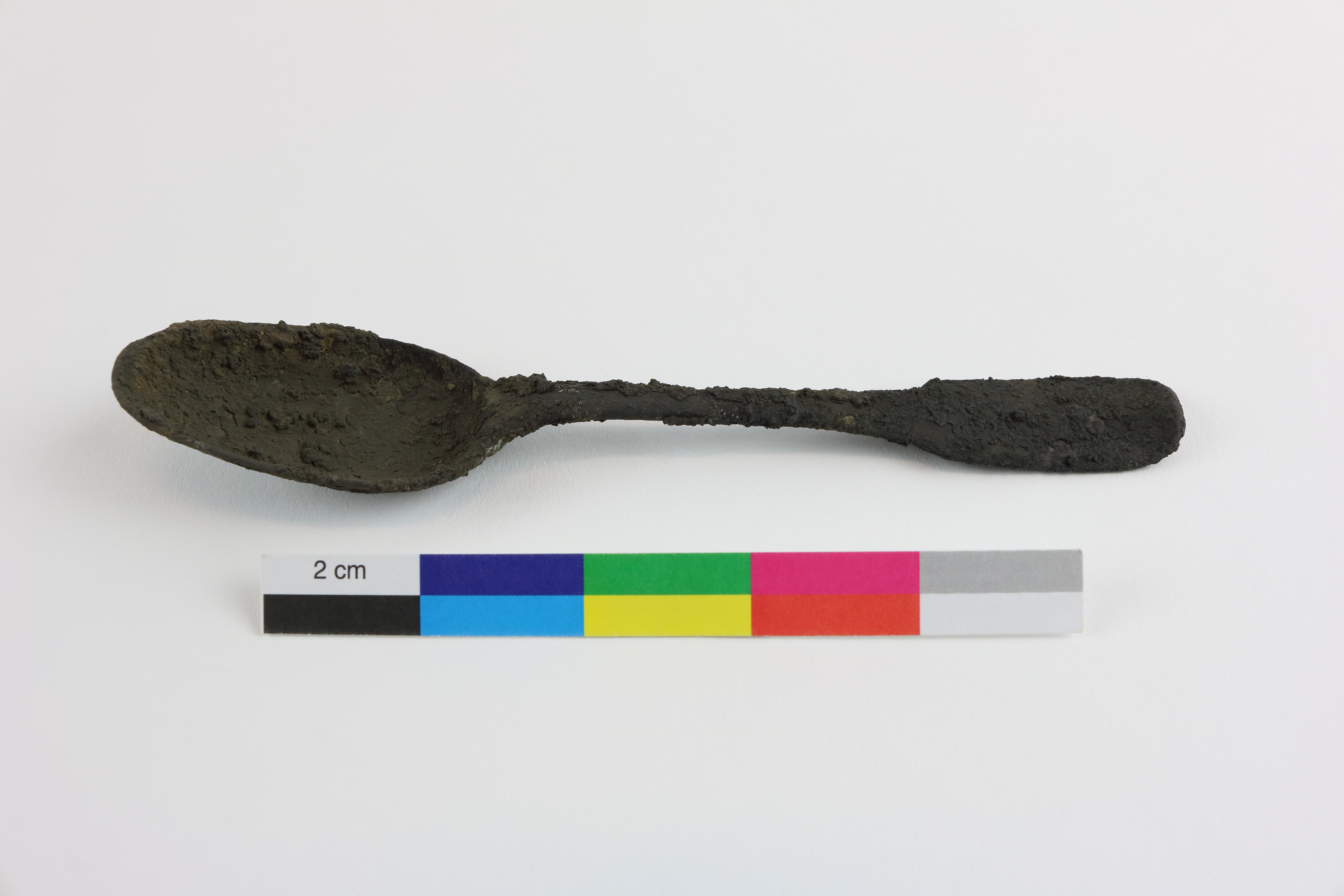 La cuillère est un ustensile de table datant de la fin du XVIIIe ou du début du XIXe siècle. La cuillère en métal argentifère est dotée d'un cuilleron ovale peu profond et d'un manche de forme rectangulaire. L'extrémité de ce dernier forme une spatule légèrement recourbée vers le haut. L'objet est recouvert de corrosion. L'artéfact mesure 14,6 cm de longueur, a une largeur maximale de 2,9 cm au niveau du cuilleron et une profondeur de 0,8 cm. La corrosion empêche d'observer une marque, un poinçon ou un décor. La tige est sans éperon.