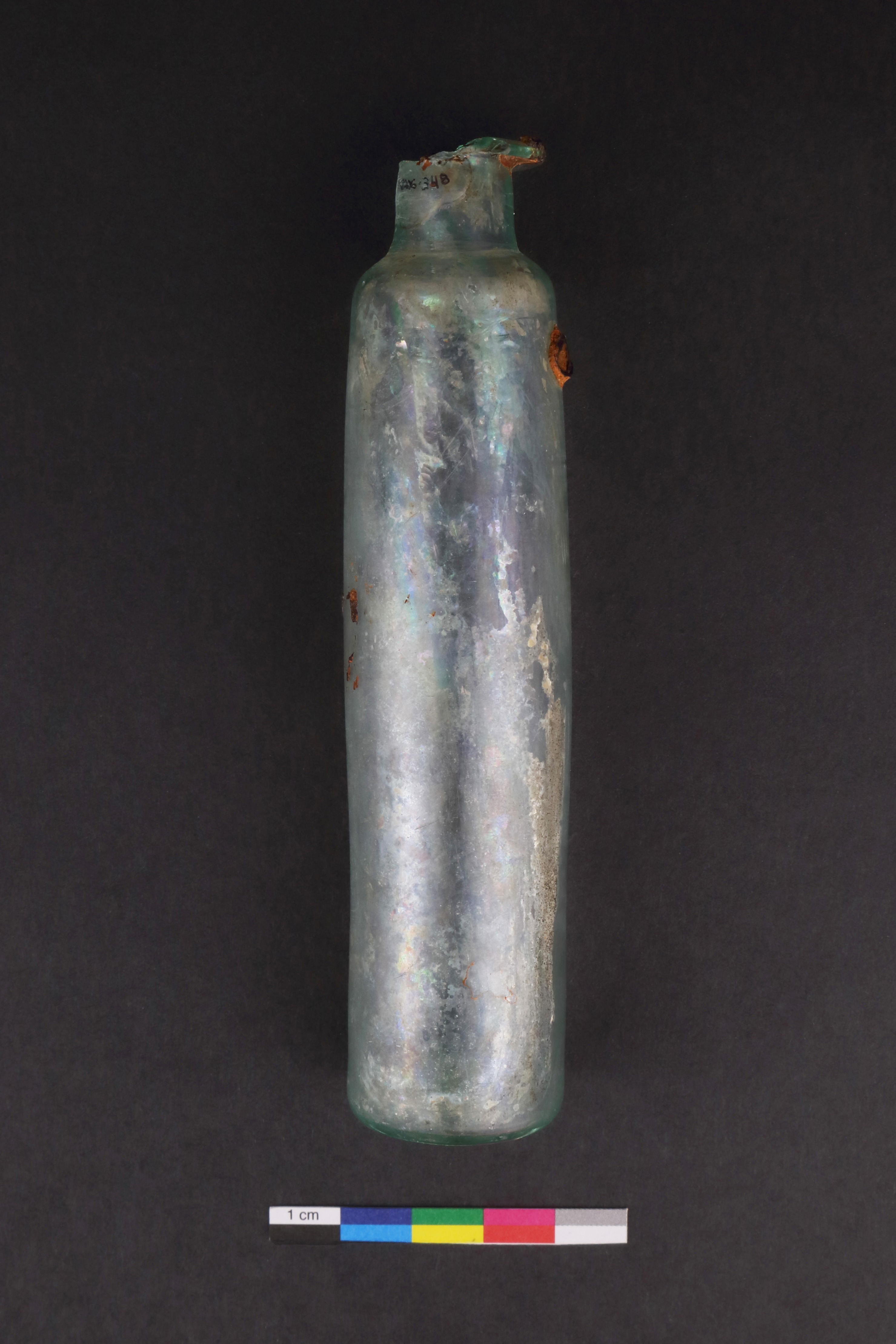 La fiole en verre teinté de couleur verte serait possiblement fabriquée au cours de la première moitié du XIXe siècle par soufflage. En effet, une trace de pontil, visible sous la base, suggère ce mode de fabrication. Ce récipient à usage pharmaceutique de petit format contient probablement un médicament à l'origine. Il est cependant impossible d'en déterminer la nature exacte, puisqu'aucune marque ou étiquette n'est présente sur l'objet. Une cassure au niveau de la lèvre pourrait résulter de son utilisation, ou de son rejet et de son séjour sous terre.