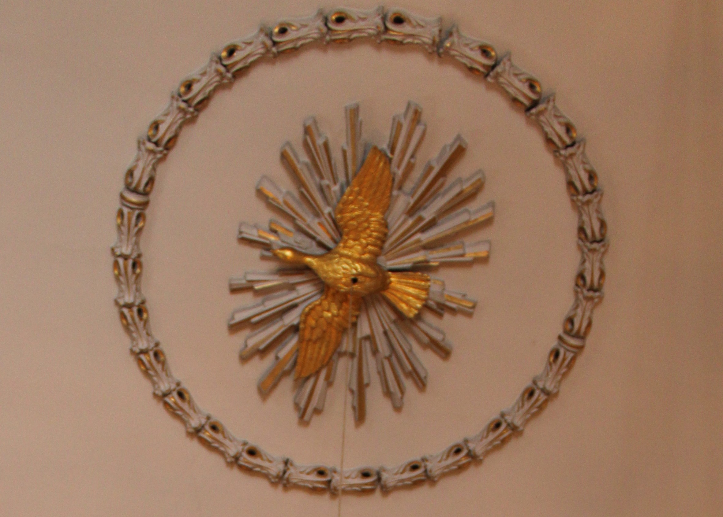 Une colombe dorée aux ailes déployées, représentant le Saint-Esprit, est représentée sur des rayons blancs et ors. Elle est entourée d'un motif circulaire. Elle est située au plafond du choeur. La lampe du sanctuaire y est accrochée.