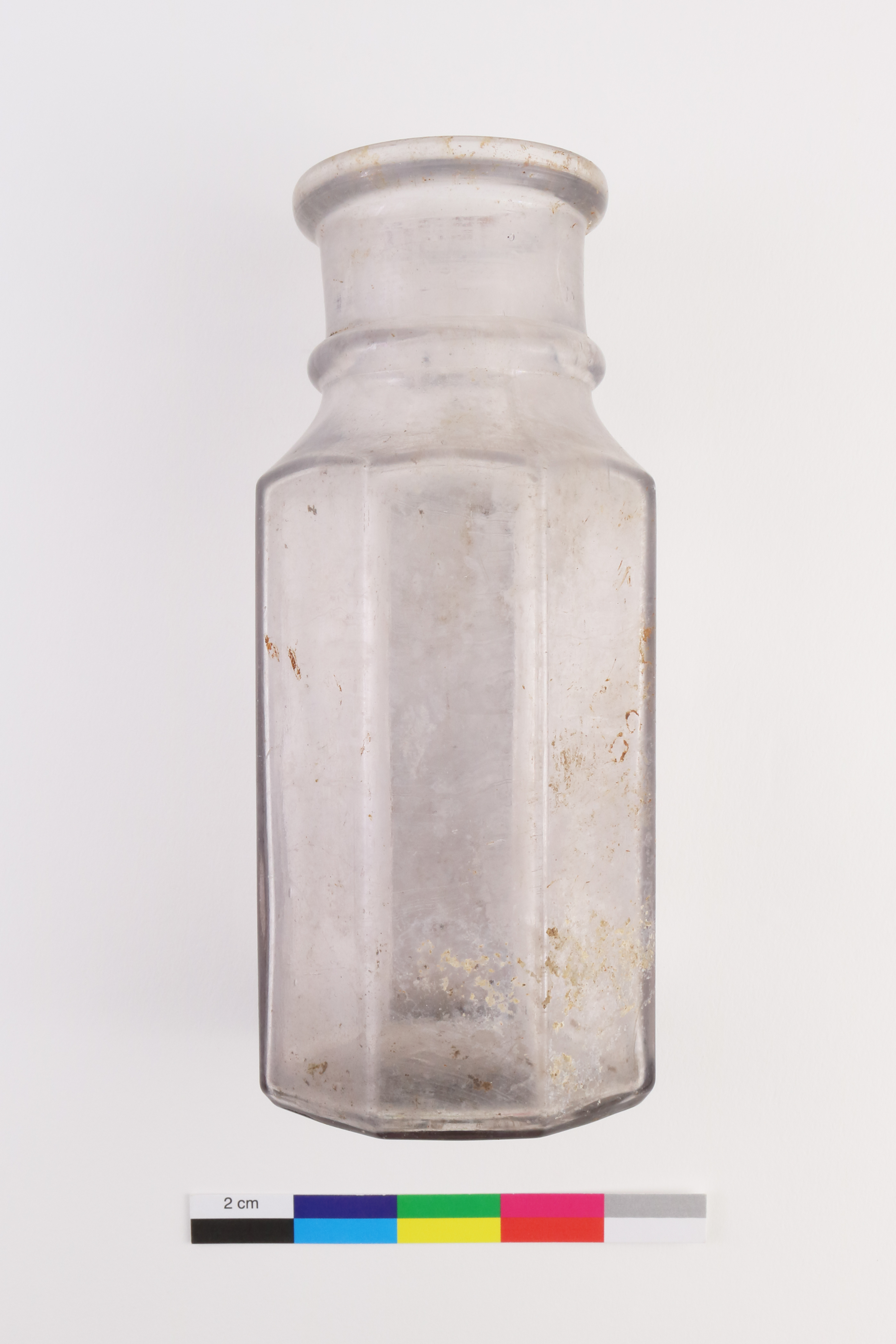 La bouteille alimentaire est un contenant lié à l'alimentation datant d'entre 1850 et 1920. Entière, la bouteille en verre incolore est dotée d'un corps de forme octogonale, à huit pans plats. L'épaule est tombante et le col est cylindrique et plutôt large avec un gros anneau à sa base. La lèvre est arrondie à assise intérieure et a une ouverture plutôt large. Le cul est plat, et le chiffre « 5 » est moulé en relief sous le fond. Des résidus visibles sur le corps pourraient correspondre à une étiquette. L'objet mesure 15,4 cm de hauteur et présente un diamètre maximal de 6,5 cm au niveau du corps.
