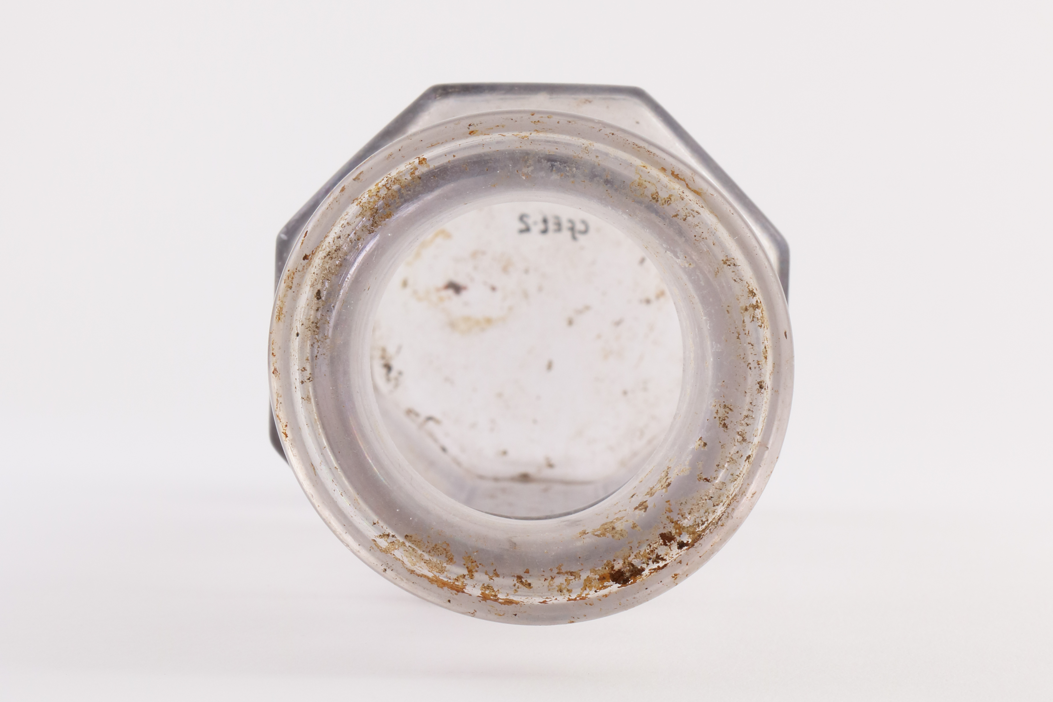 Le moule vertical en deux parties avec plaque de base séparée est celui le plus utilisé pour la fabrication des contenants en verre à la fin du XIXe et au début du XXe siècle. Son utilisation est généralement située entre 1850 et la période de fabrication mécanisée des années 1920. Vers le milieu du XIXe siècle, il remplace principalement le moule en deux parties, le moule en creux et le moule de type Ricketts. L'utilisation d'un moule à charnières en deux parties et d'une plaque de fond laisse des marques de moules sur le corps qui partent du bord du cul et remontent de chaque côté de la bouteille jusqu'à l'autre extrémité, ainsi que sur la base. Le corps et le cul peuvent porter des inscriptions en relief. Bien que le bouchon soit manquant, cette bouteille est peut-être dotée d'un système de fermeture « Capseat », un capuchon en papier principalement associé aux bouteilles de lait. Le disque est appliqué et scellé sur un renflement situé à l'intérieur du goulot, renflement visible sur cette bouteille. Ce système est breveté par la Thatcher Manufacturing Company en septembre 1889 afin de remplacer les bouchons de métal et de verre et faciliter ainsi le nettoyage et la réutilisation des contenants. Ce type de fermeture est également utilisé sur certaines bouteilles alimentaires au cours du premier tiers du XXe siècle, comme des bouteilles de cornichons sucrés. Il pourrait également s'agir d'un système de fermeture Spring Top (Kearns-Gorsuch Bottle Co.), breveté en 1899, où le capuchon est en verre et maintenu en place par un ressort. Toutefois, ce type de fermeture ne peut pas toujours être vérifié, à moins qu'il ne soit trouvé avec la fermeture initiale en place, ce qui n'est pas le cas ici.