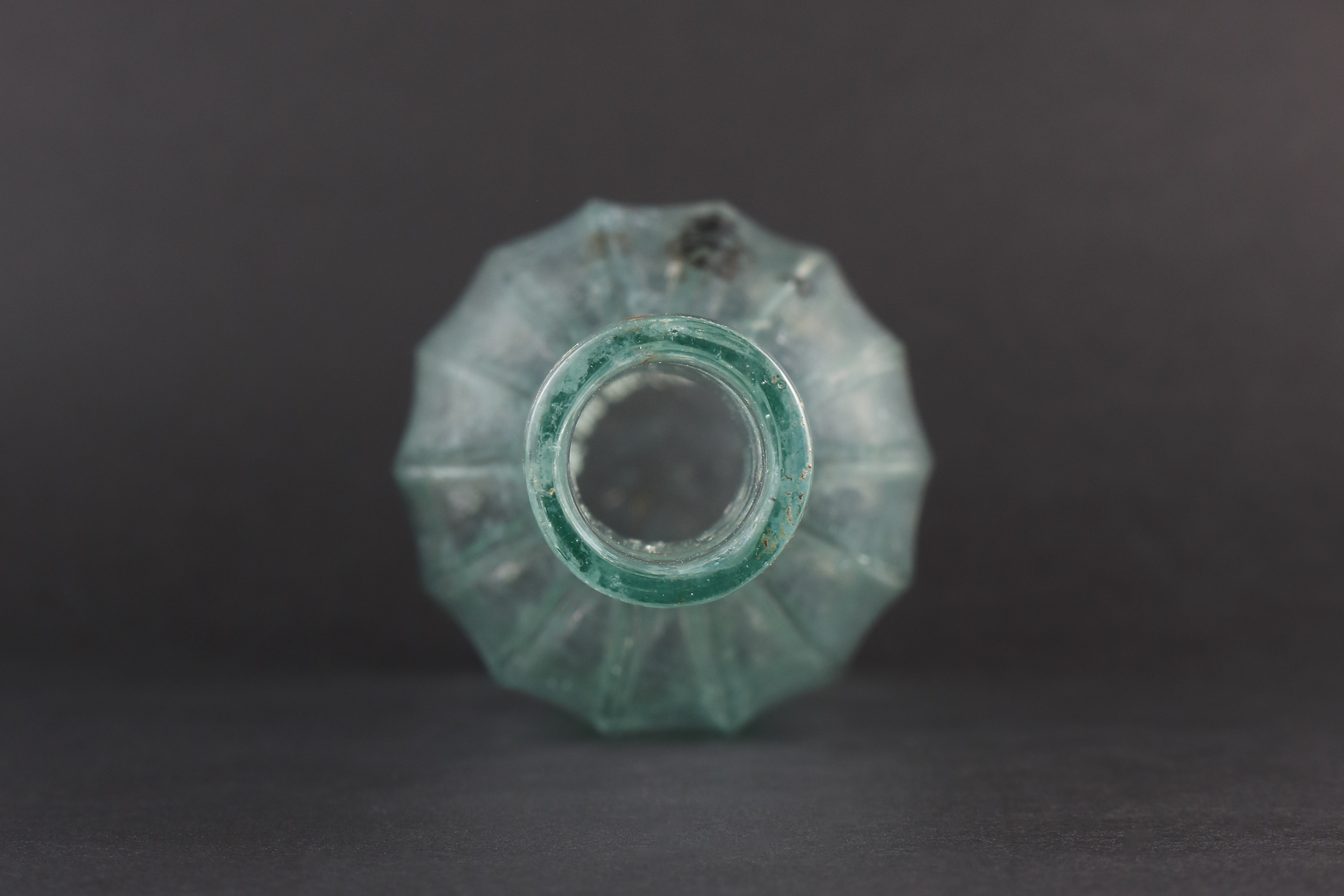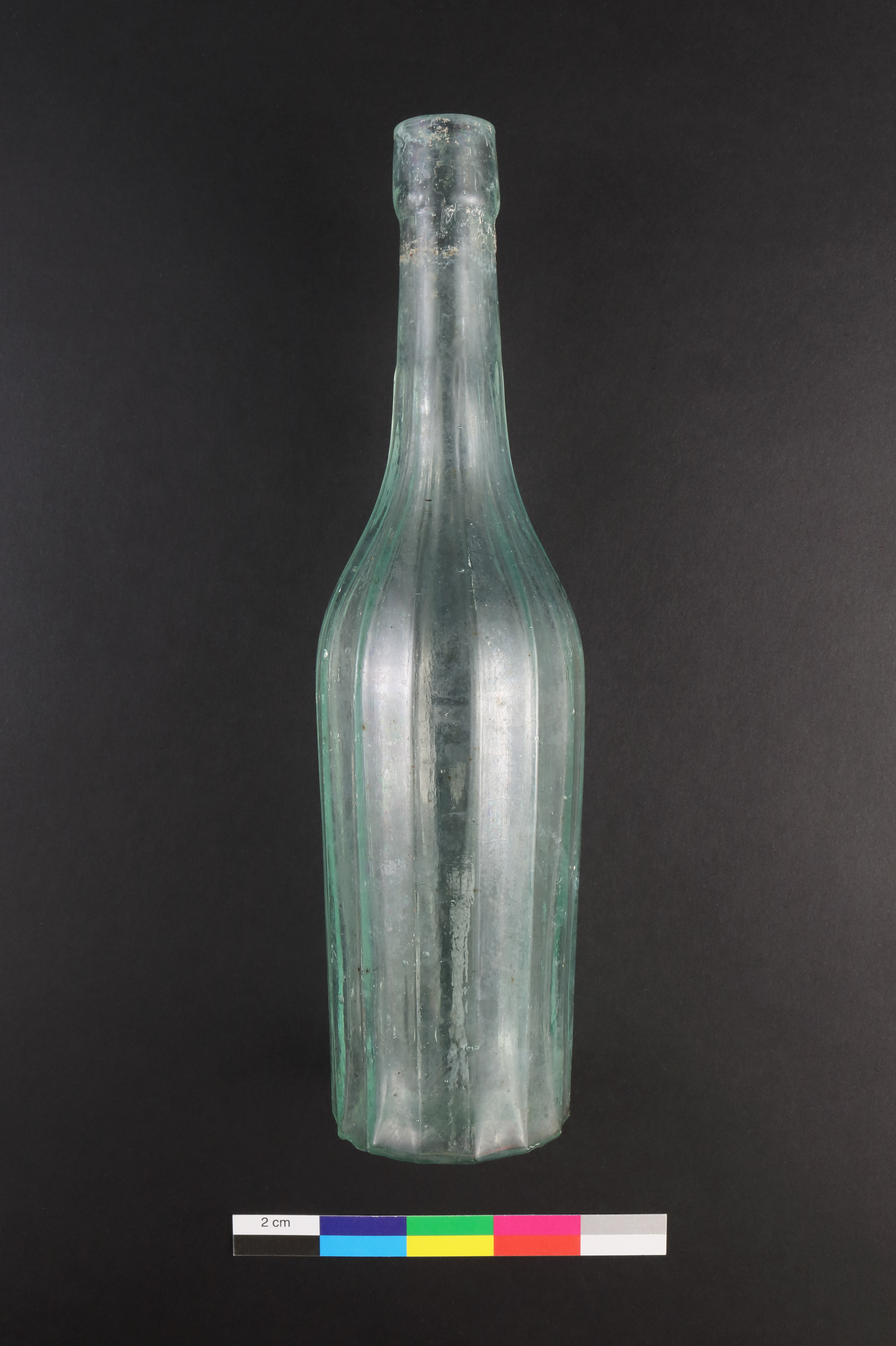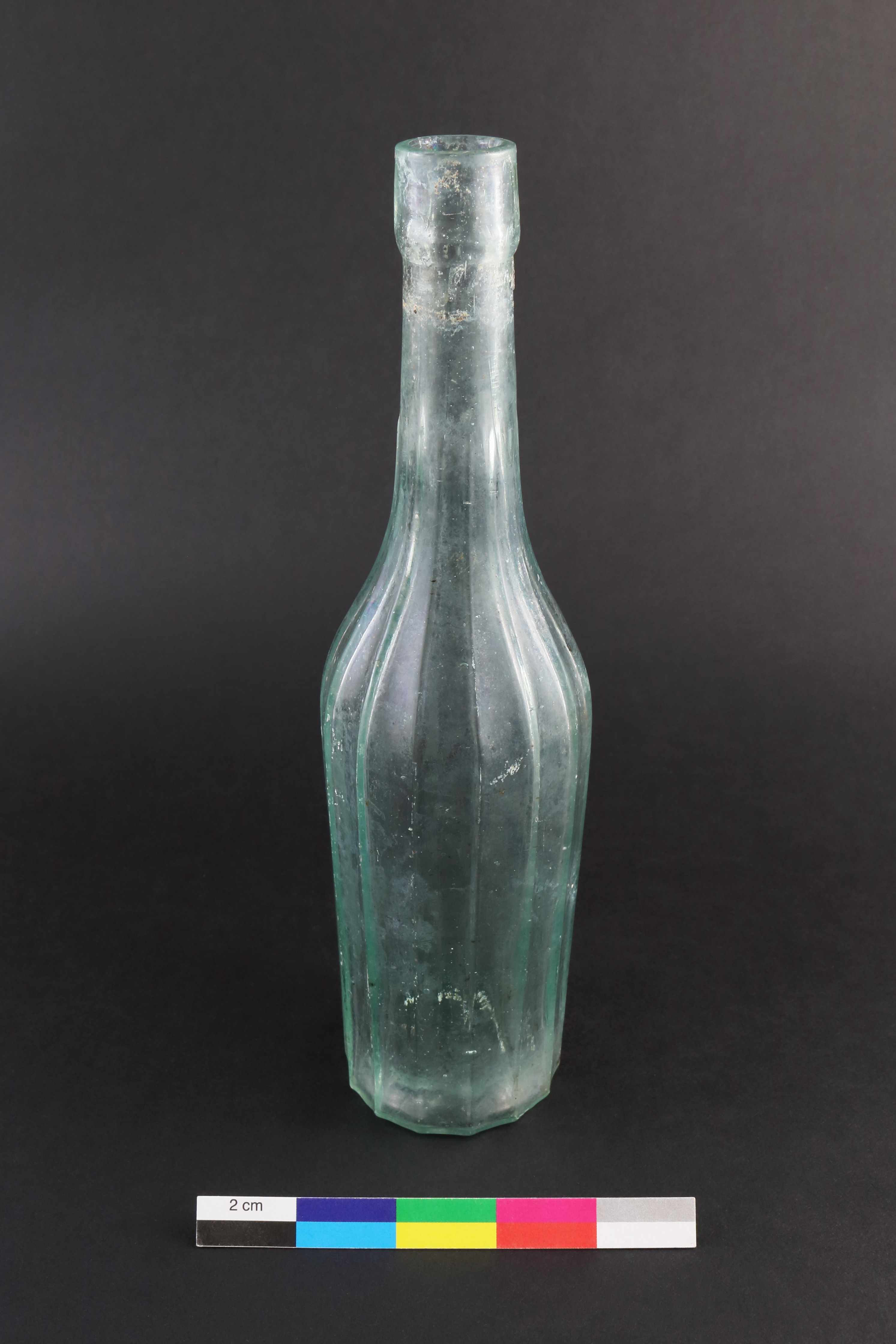 La bouteille à sauce est un contenant lié à l'alimentation datant d'entre le milieu du XIXe siècle et le début du XXe siècle. Entière, la bouteille en verre teinté de couleur turquoise a un corps rond à 14 cannelures qui se terminent sur la partie inférieure du col. L'épaule est tombante et le col est cylindrique et plutôt long. L'extrémité est faite d'une lèvre renversée, et une petite assise est située à mi-chemin à l'intérieur de l'ouverture. Le cul est concave peu profond avec un talon arrondi. L'objet mesure 20,5 cm de hauteur et la base a un diamètre de 4,5 cm.
