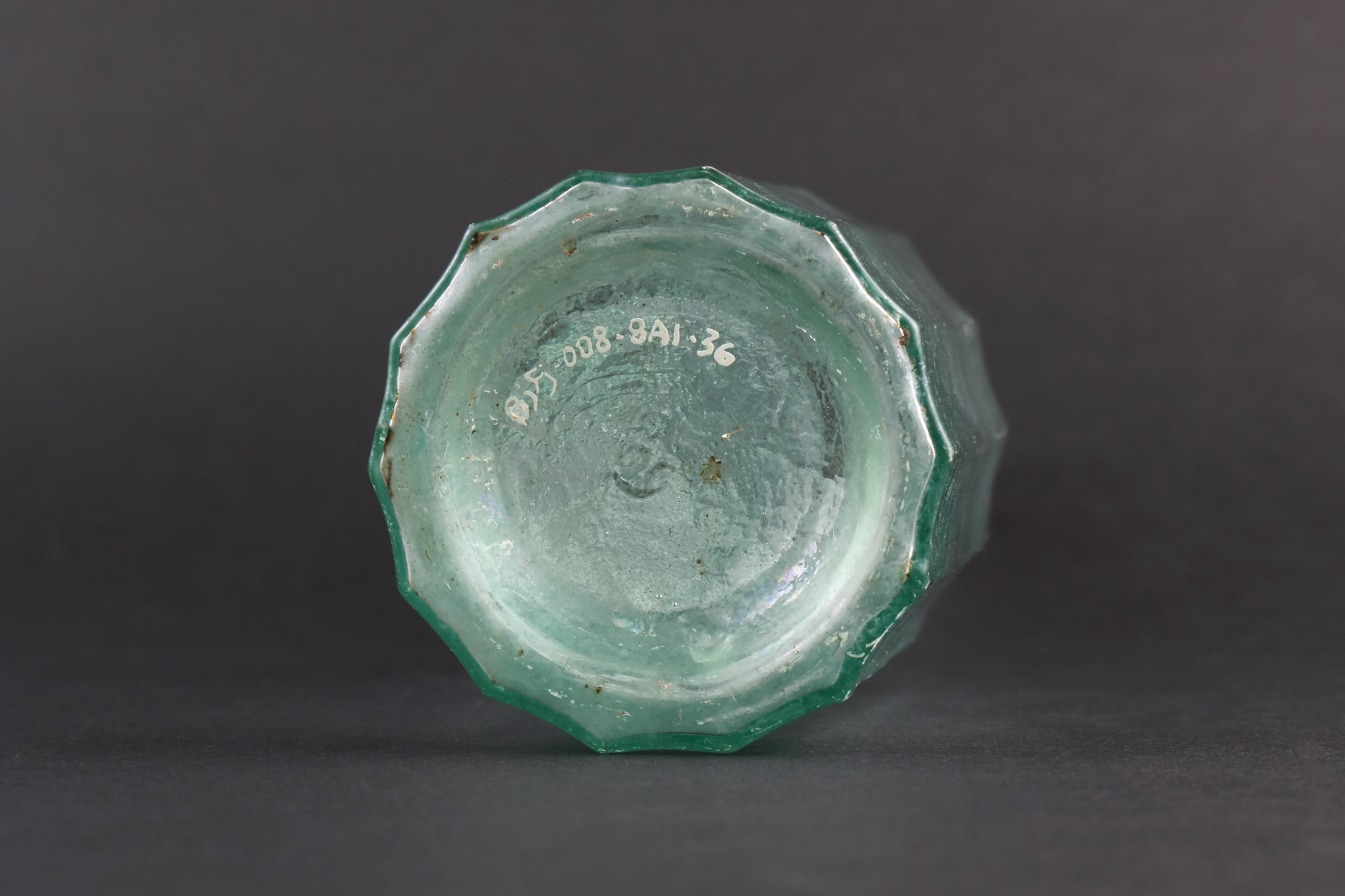 La bouteille à sauce en verre de couleur turquoise est soufflée au moule vertical du corps en deux parties avec base séparée entre 1850 et 1920. Il s'agit du moule le plus utilisé pour la fabrication des contenants de verre à la fin du XIXe et au début du XXe siècle. Son utilisation est généralement située entre 1850 et la période de fabrication mécanisée des années 1920. Vers le milieu du XIXe siècle, il remplace principalement le moule en deux parties, le moule en creux et le moule de type Ricketts. Son utilisation laisse des marques sur le corps qui partent du bord du cul et remontent de chaque côté de la bouteille jusqu'à l'autre extrémité, ainsi que sur la base. Le corps et le cul peuvent porter des inscriptions en relief. La bouteille devait porter à l'origine une étiquette de papier, et bien que le bouchon soit absent, ce dernier serait de type « club sauce », un bouchon en verre aux parois enveloppées de liège. Le rebord présent à l'intérieur de l'ouverture de cette bouteille empêche le liège de tomber dans le récipient lorsque le bouchon est enlevé.