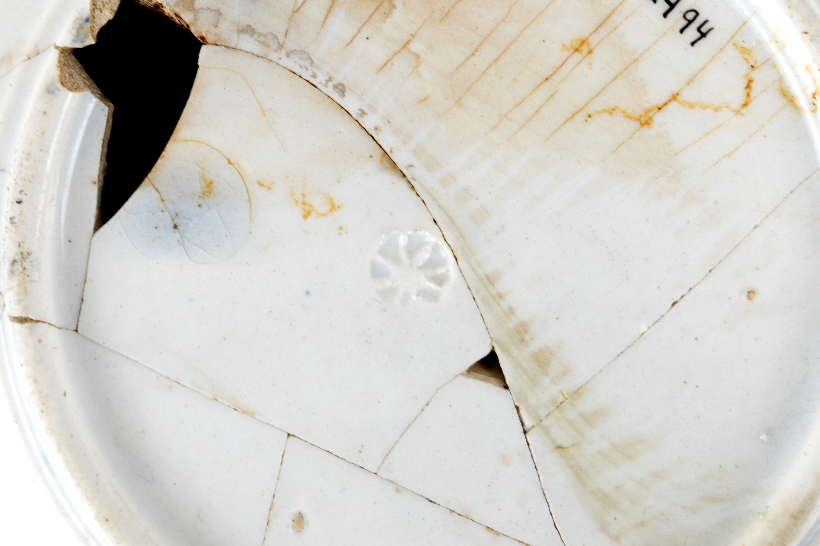 Trace de trépied de type « colifichet » sur le centre et le fond de la soucoupe. Ces traces sont créées lors de la fabrication de l'objet. Présence de trois points espacés au centre de la soucoupe et son fond -
