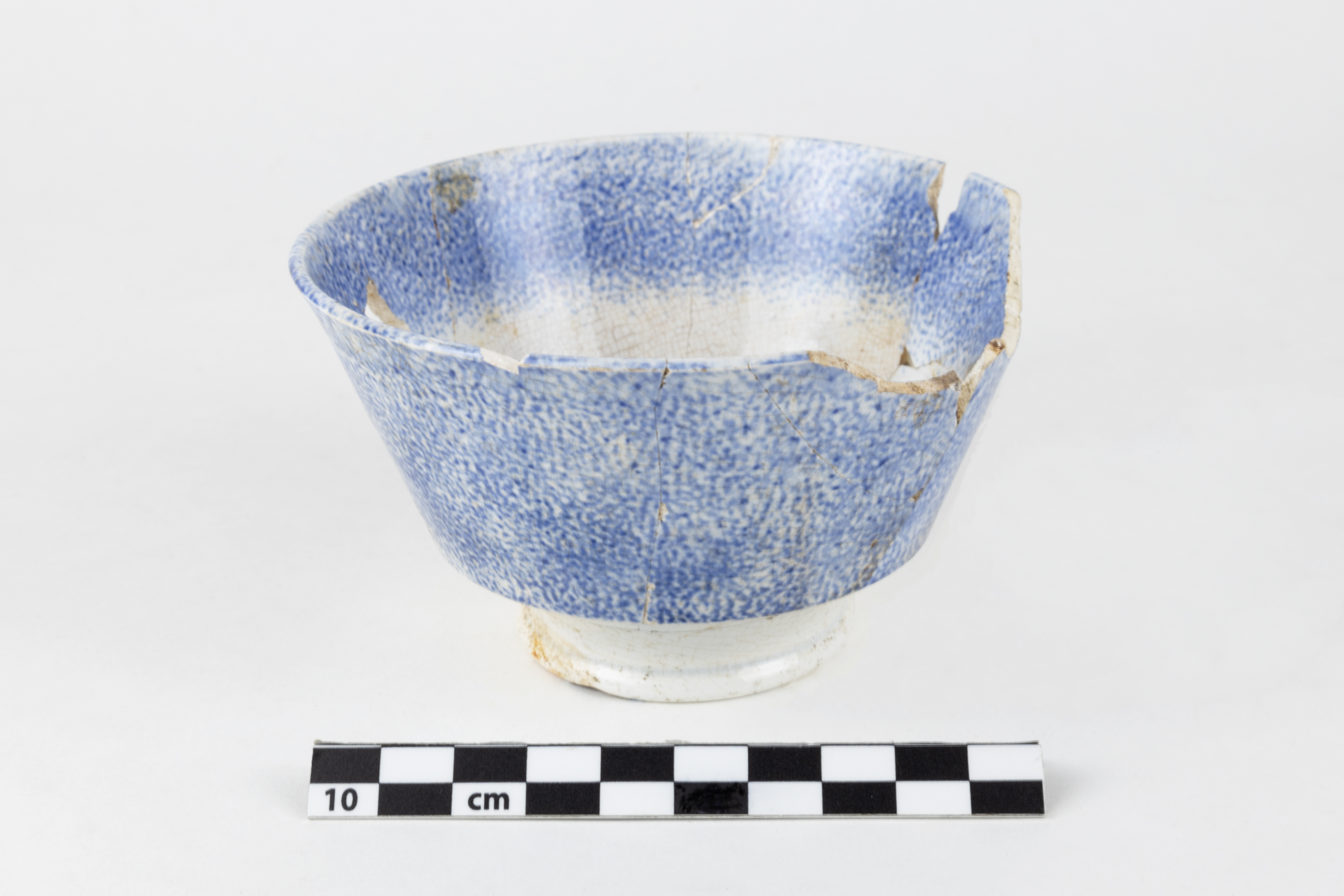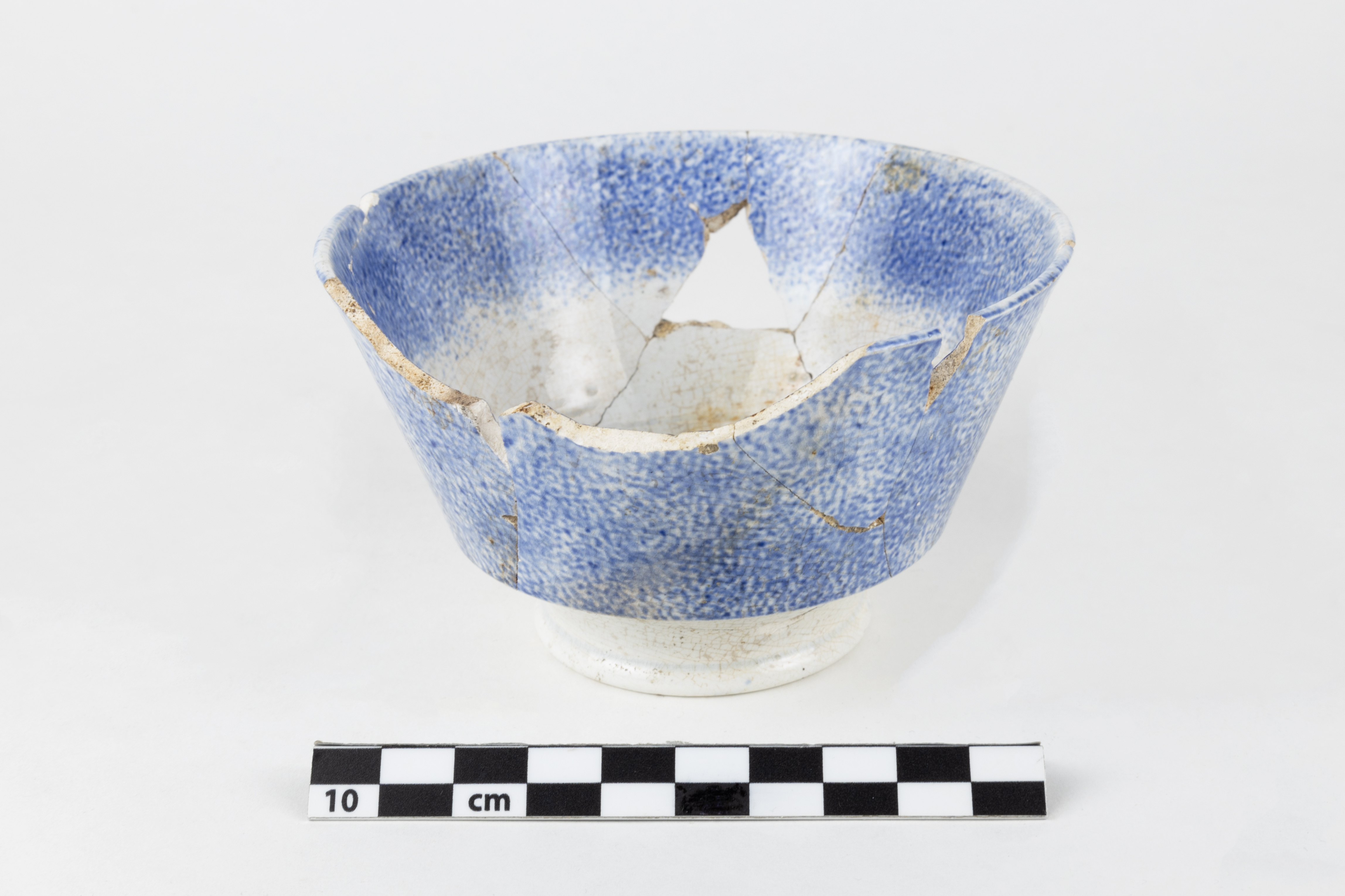 La tasse est un objet lié à l'alimentation datant du deuxième quart du XIXe siècle. Complète, cette tasse en terre cuite fine blanche est constituée de 13 fragments. De forme « London Shape », elle possède un rebord droit à lèvre arrondie, une paroi carénée et un piédouche. L'anse est manquante. Un décor bleu pâle à l'éponge simple orne la paroi extérieure, la bordure intérieure et le centre de la tasse. L'objet mesure 6,7 cm de hauteur et 11,3 cm de diamètre.