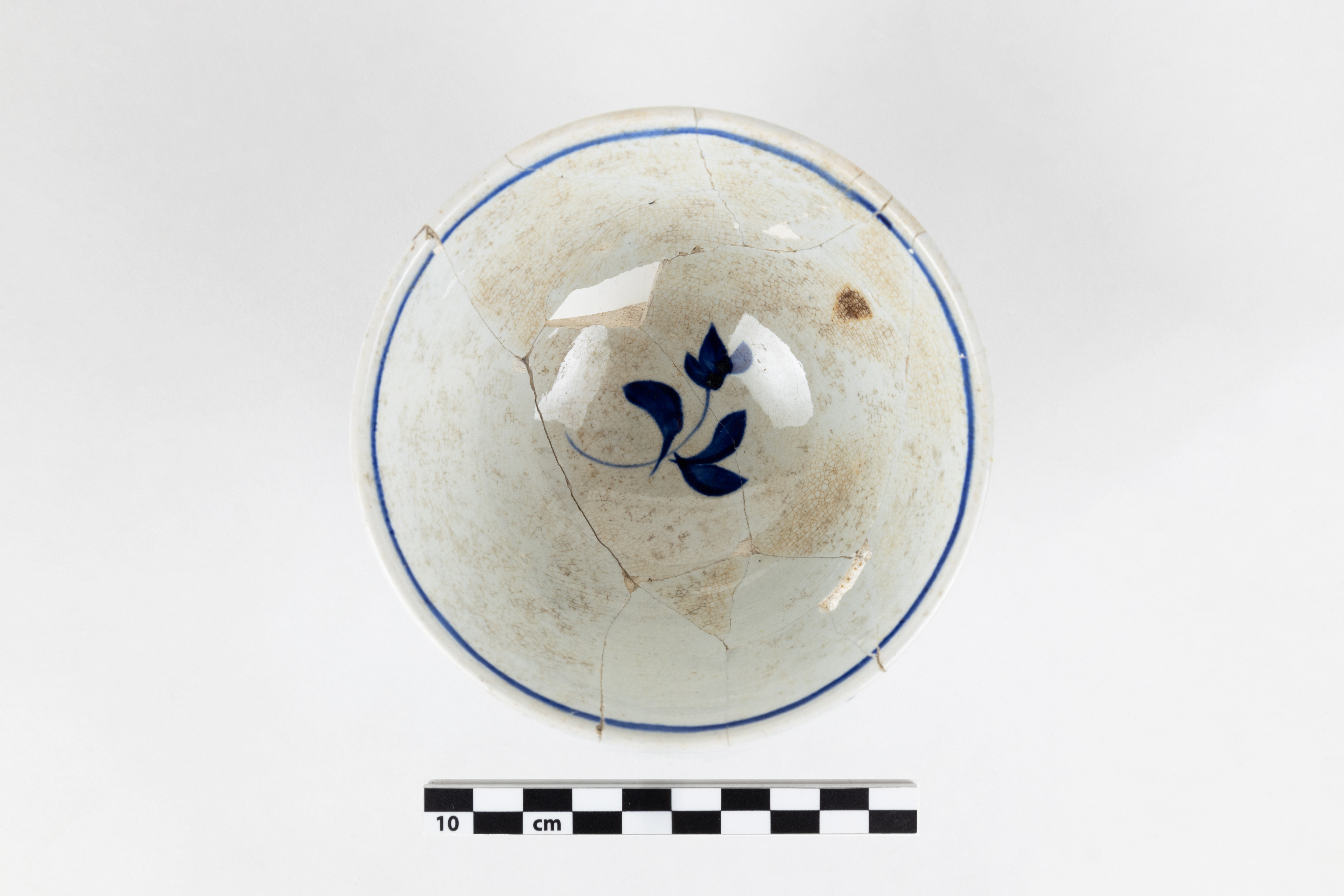 Les décors peints sont principalement associés aux objets liés au thé, aux bols et autres objets creux. Du début du XIXe siècle jusqu'au tournant des années 1860 et surtout avant les années 1840, les objets en terre cuite fine peints représentent près de soixante pour cent des objets liés au thé achetés en Amérique du Nord par rapport à tout autre type de décor. Il s'agit d'une vaisselle décorée peu coûteuse à produire en comparaison avec celles à décors imprimés. Les décors peints de la première moitié du XIXe siècle peuvent être datés selon les couleurs employées et le style du motif. Les décors peints monochromes bleu cobalt à motif floral à larges traits comme celui sur cette tasse sont caractéristiques de la période comprise entre 1815 et les années 1830.