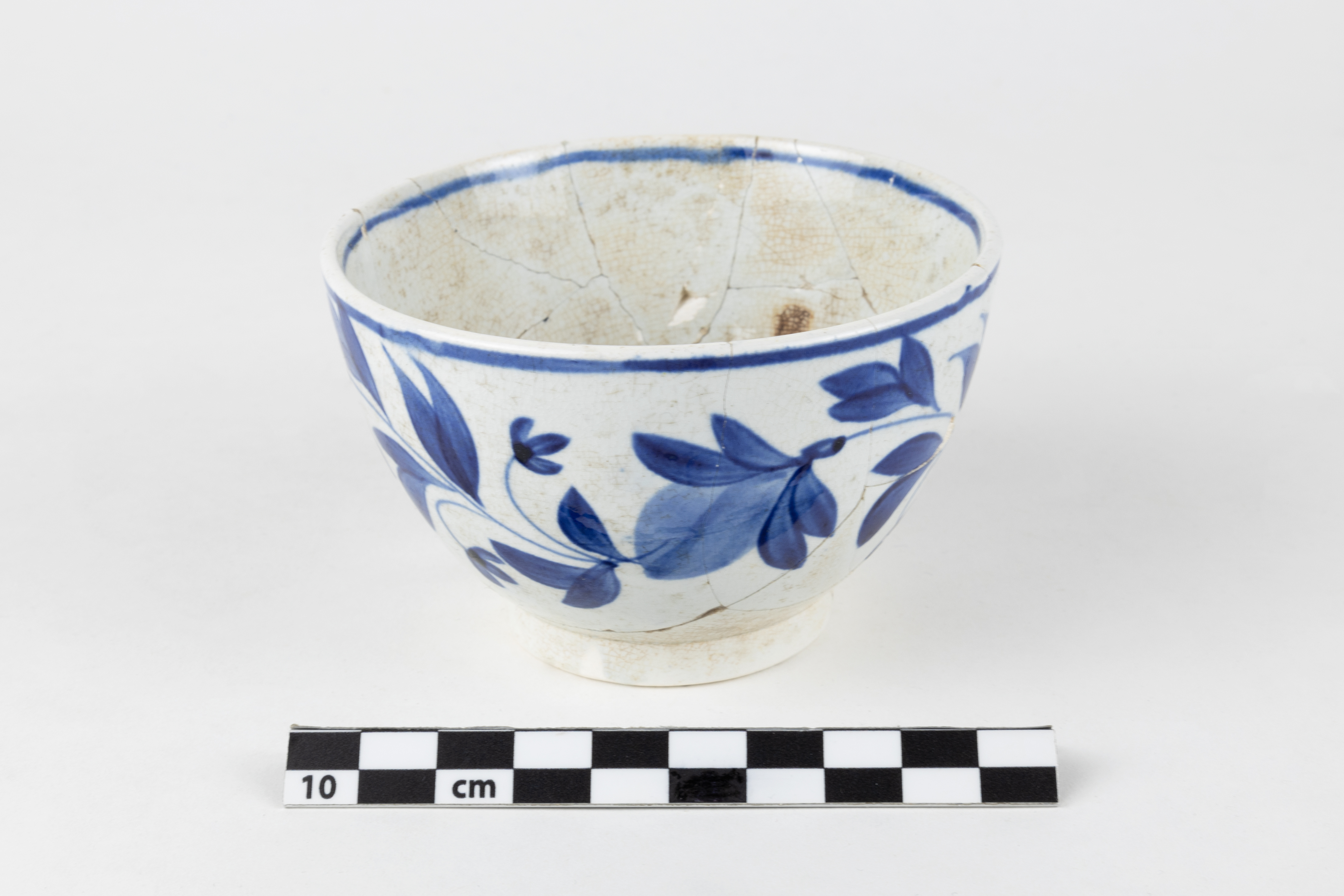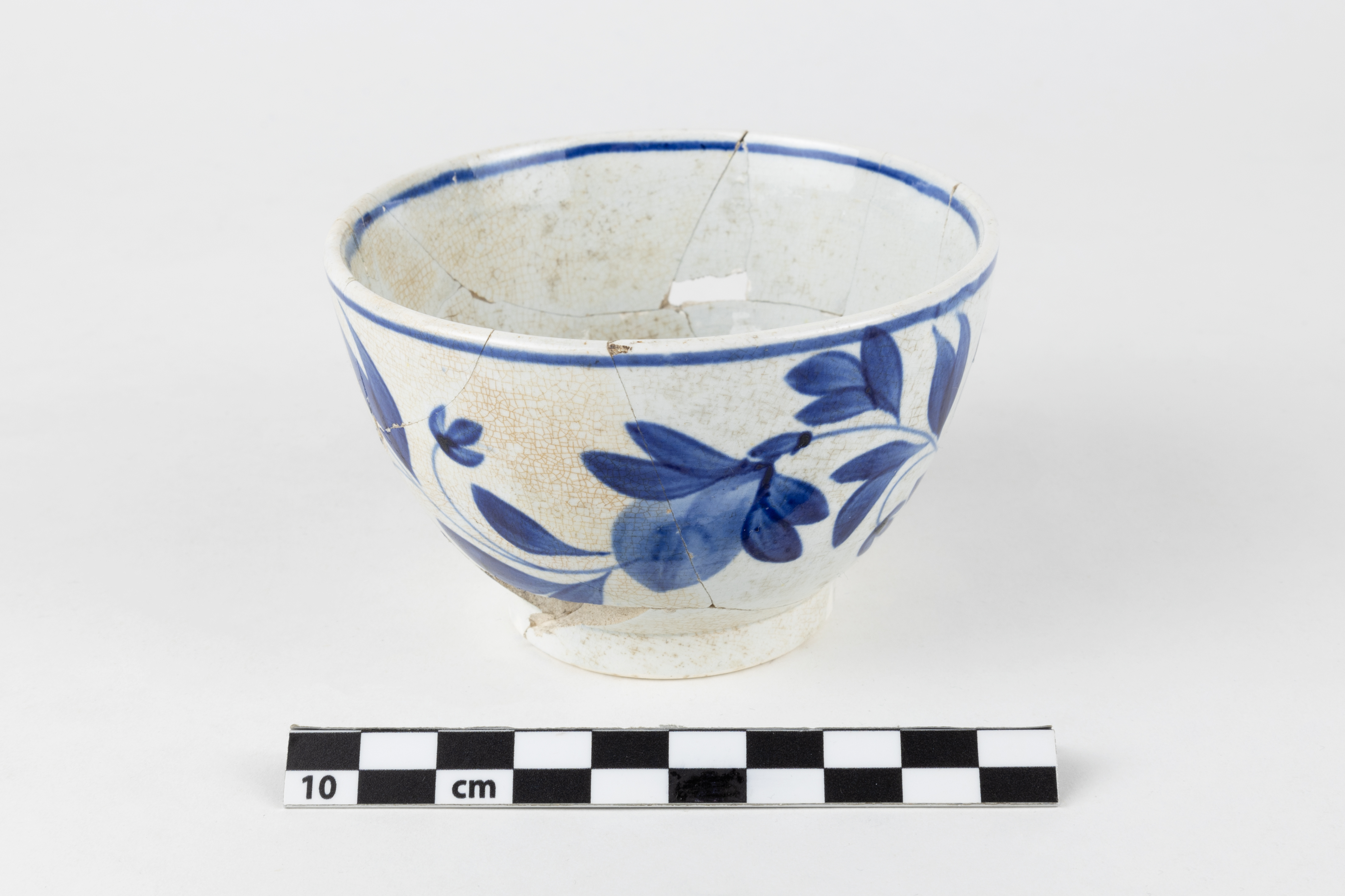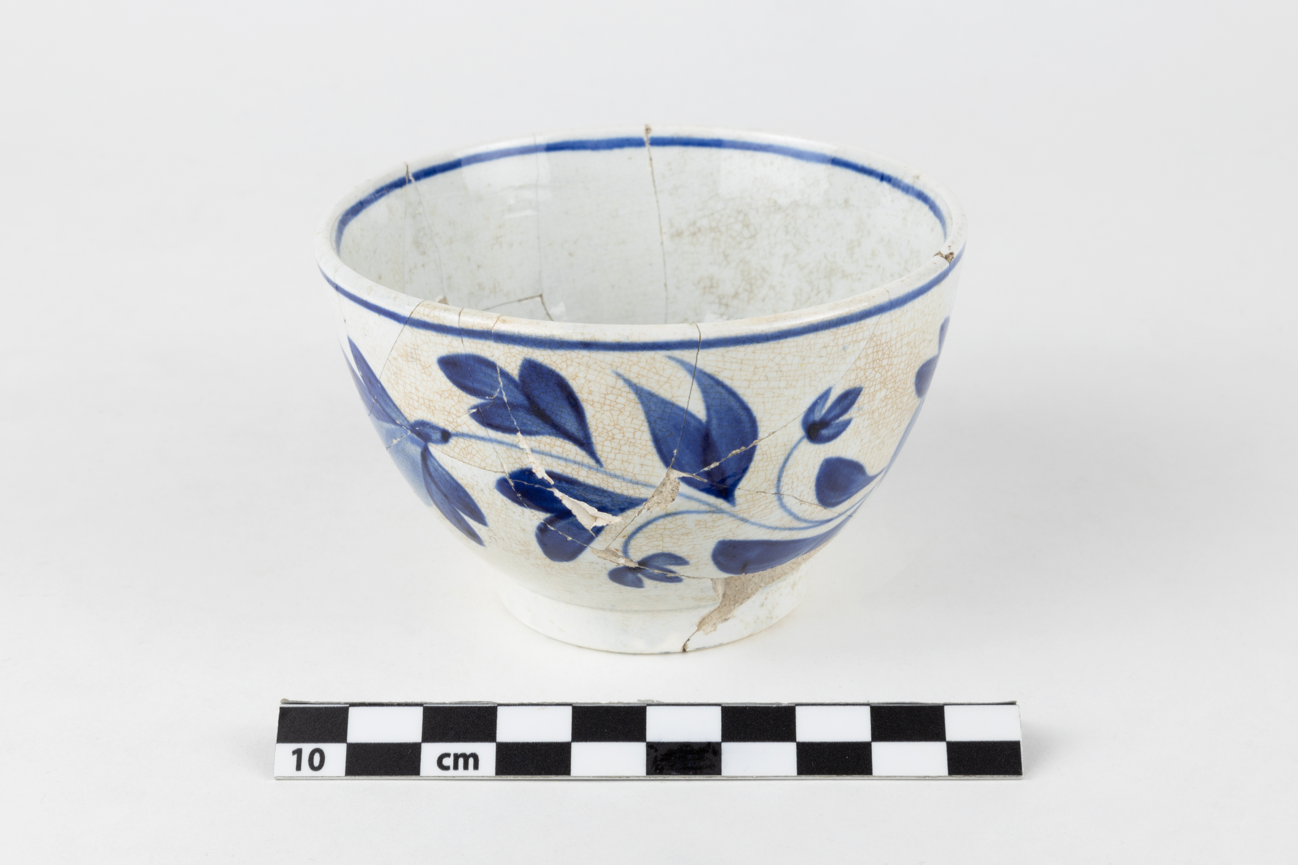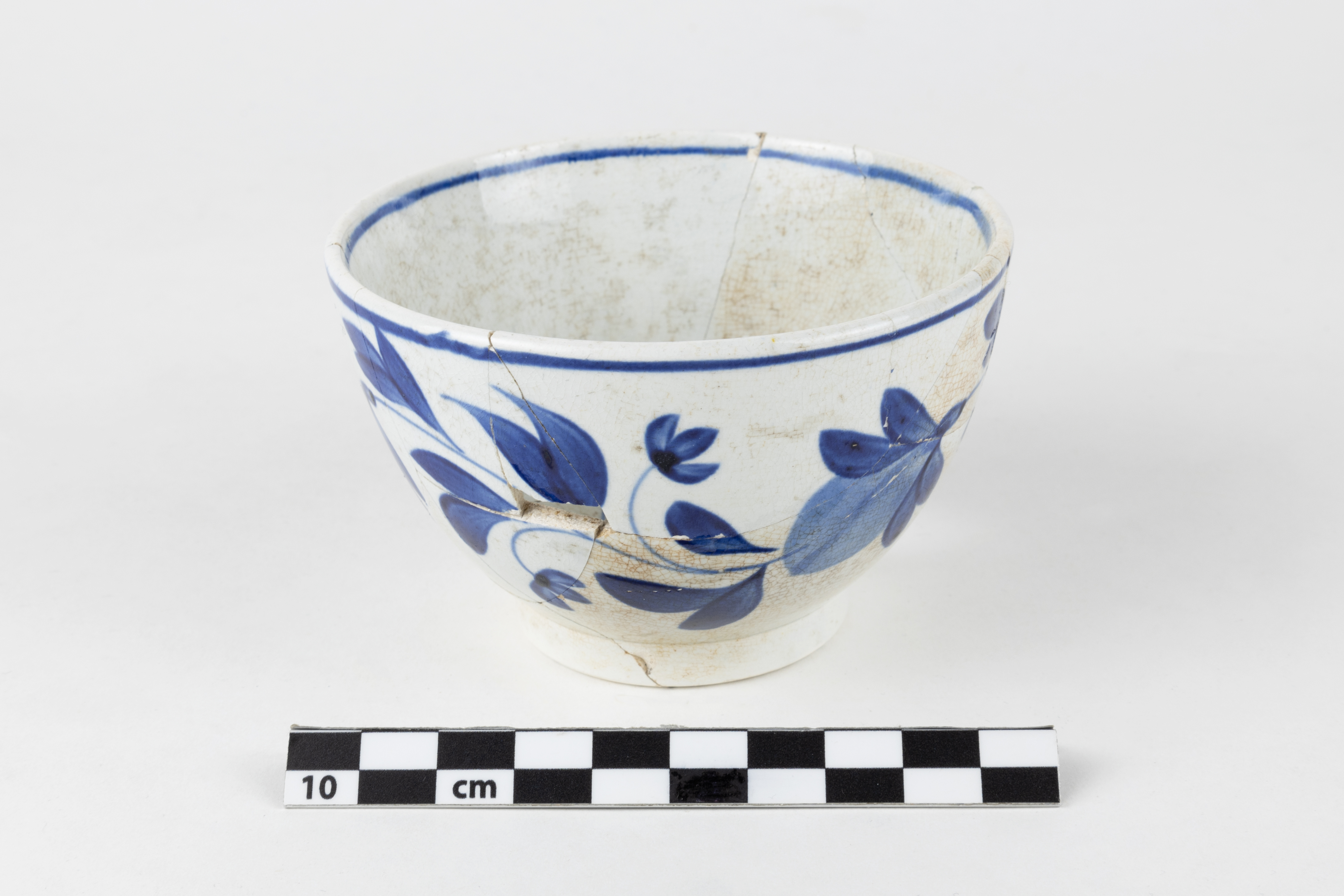 La tasse est un objet lié à l'alimentation datant du premier tiers du XIXe siècle. Complet, l'objet en terre cuite fine de type « pearlware » est constitué de 14 fragments. La tasse sans anse est de forme hémisphérique et repose sur un pied annulaire vertical haut. Elle est ornée d'un décor peint bleu cobalt à motif floral. L'objet mesure 6,15 cm de hauteur et a un diamètre de 9,6 cm.