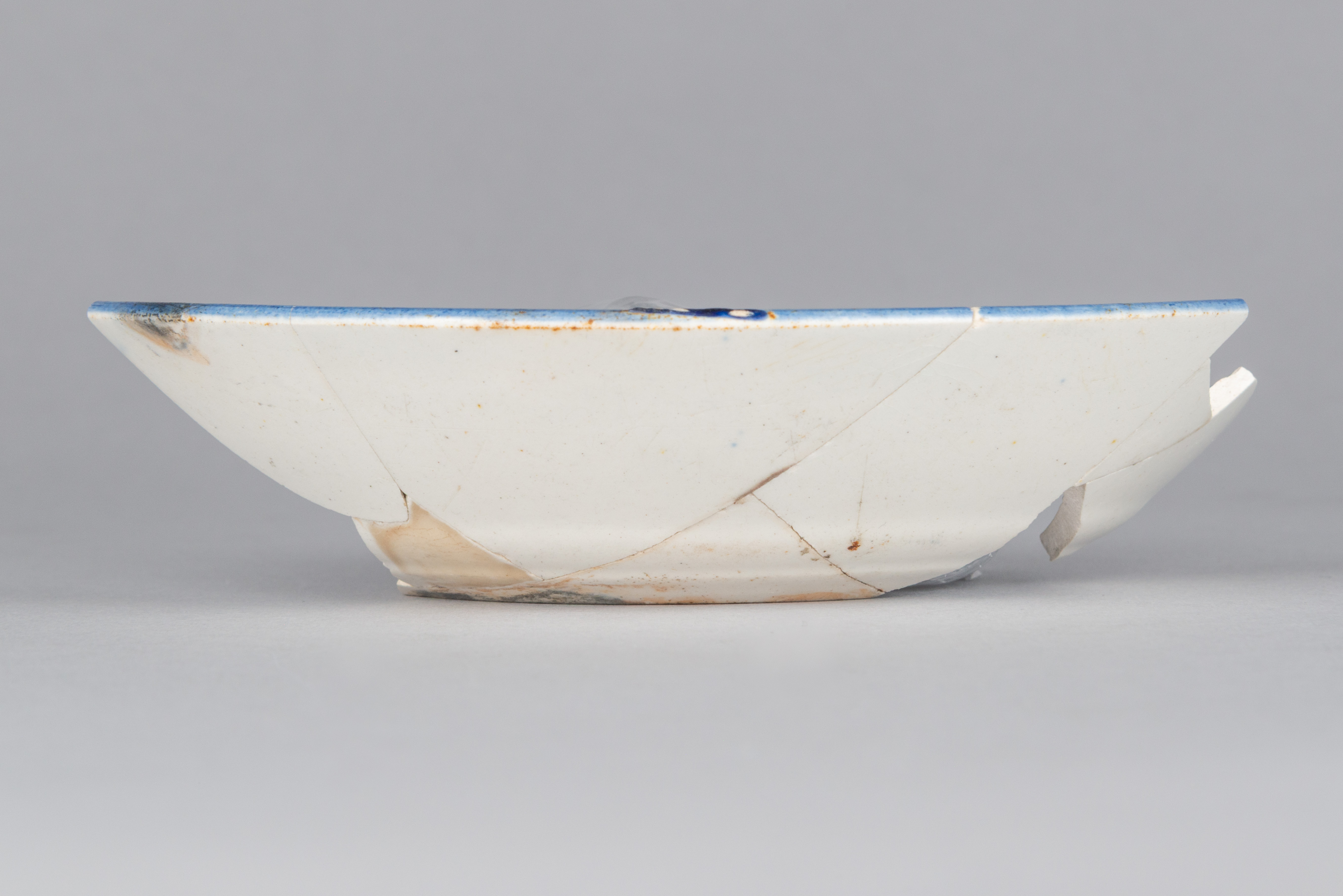 Les décors peints sont principalement associés aux objets liés au thé, aux bols et autres objets creux. Du début du XIXe siècle jusqu'au tournant des années 1860, mais spécialement avant les années 1840, les objets en terre cuite fine peints représentent près de soixante pour cent des objets liés au thé achetés en Amérique du Nord par rapport à tout autre type de décor. Il s'agit d'une vaisselle décorée peu coûteuse en comparaison avec celles à décors imprimés. Les décors peints de la première moitié du XIXe siècle peuvent être datés selon les couleurs employées et le style du motif. Les décors monochromes bleu cobalt à motif floral aux larges traits comme celui ornant cette soucoupe sont caractéristiques de la période comprise entre 1815 et les années 1830.