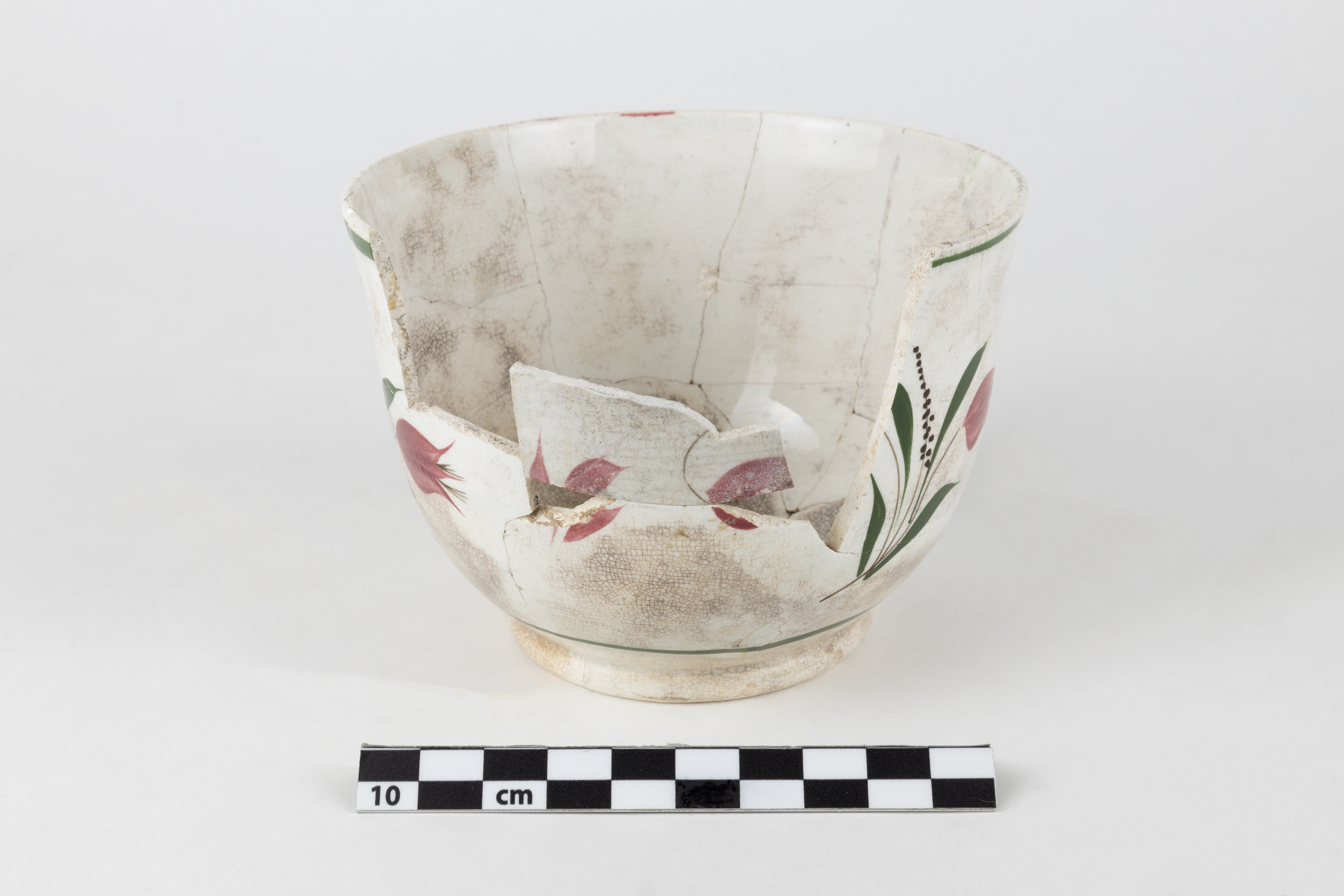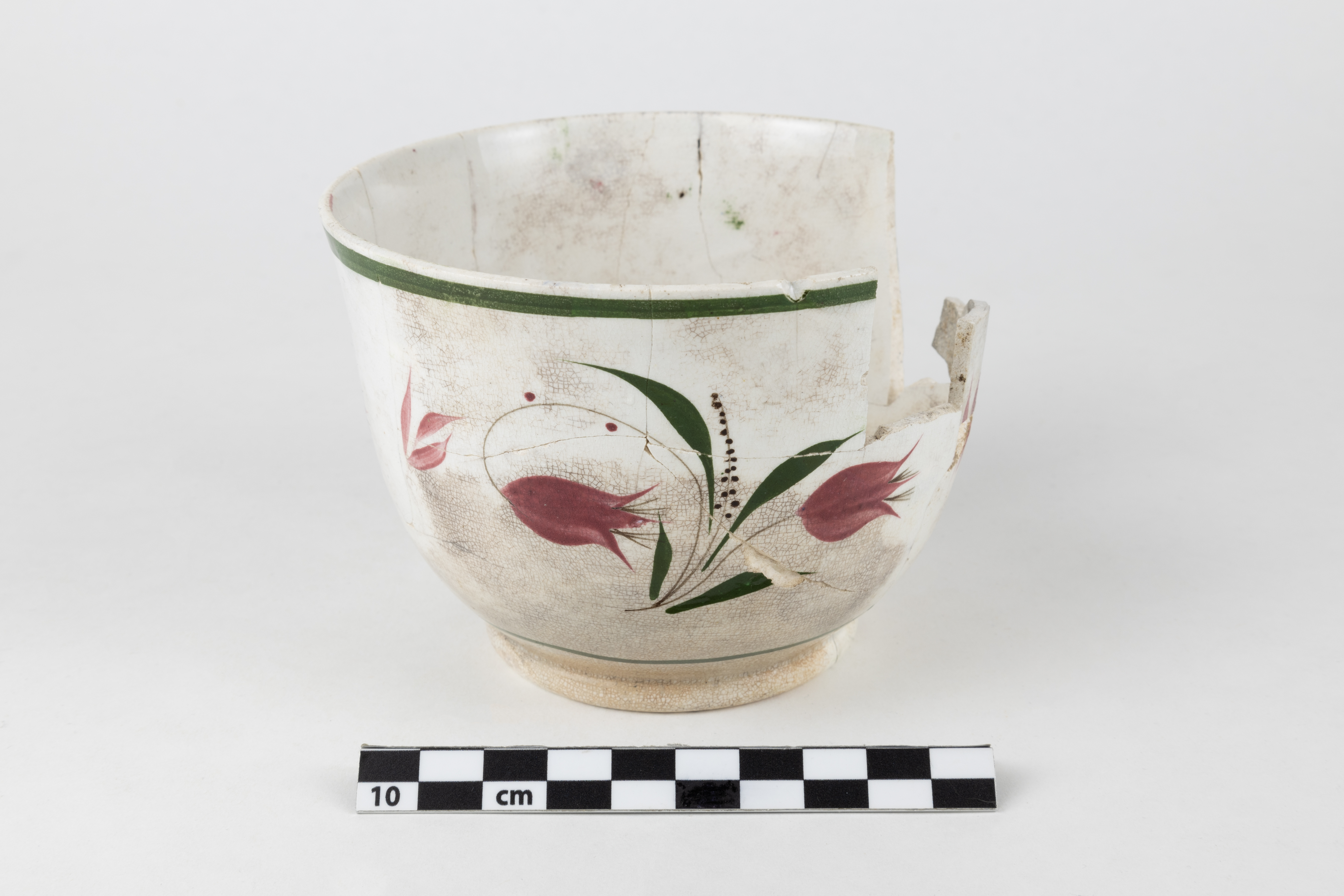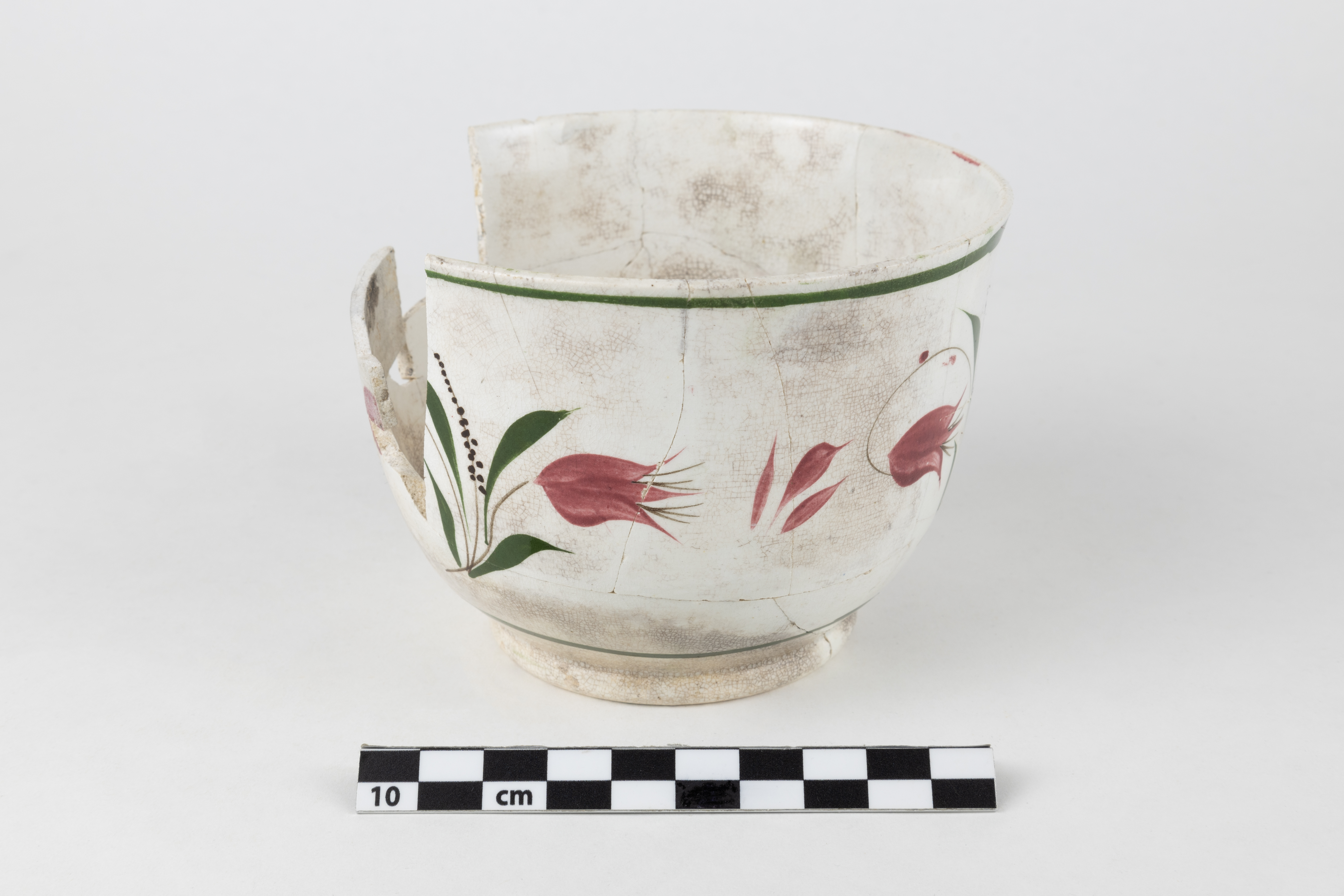 Le sucrier est un objet lié à l'alimentation du deuxième quart du XIXe siècle. Complet, le sucrier en terre cuite fine blanche sans anse est composé de 15 fragments. Il est en forme de bol haut à rebord droit et à lèvre arrondie et repose sur un pied annulaire arrondi. Un décor à motif floral dans les teintes de rouge, de noir et de vert est peint sous la glaçure sur la paroi extérieure. Le couvercle est absent. Le sucrier mesure 8,6 cm de hauteur et 11,7 cm de diamètre.