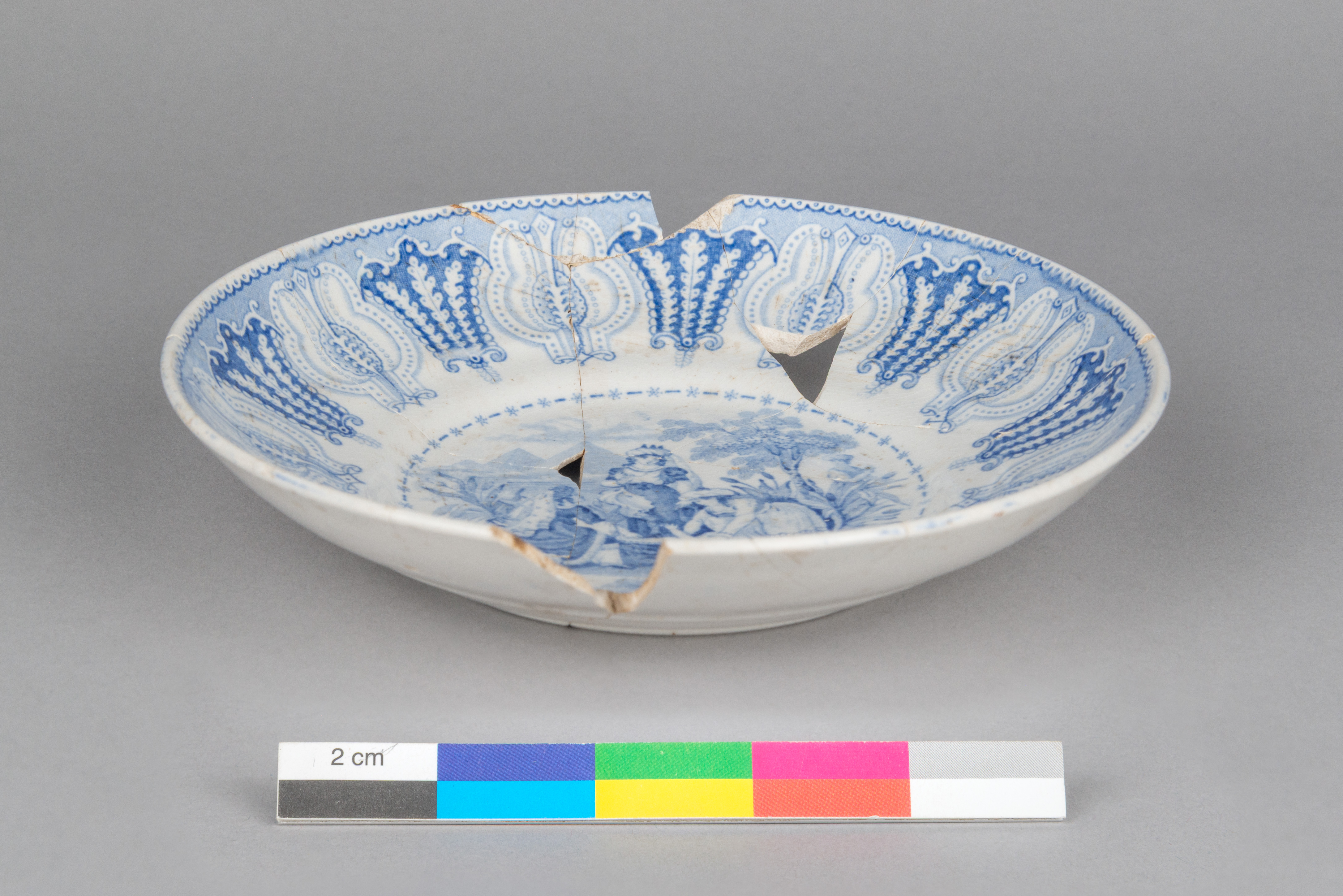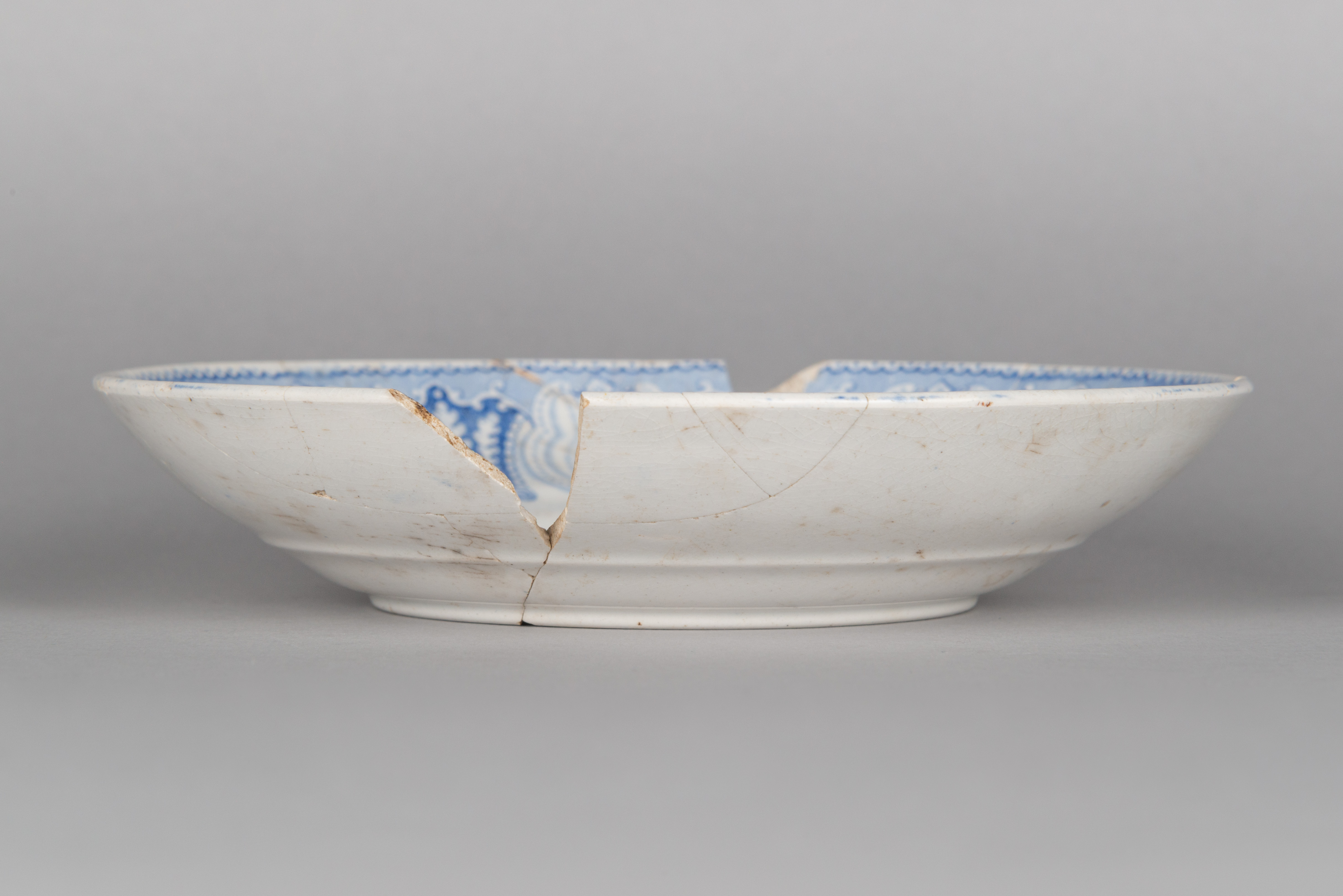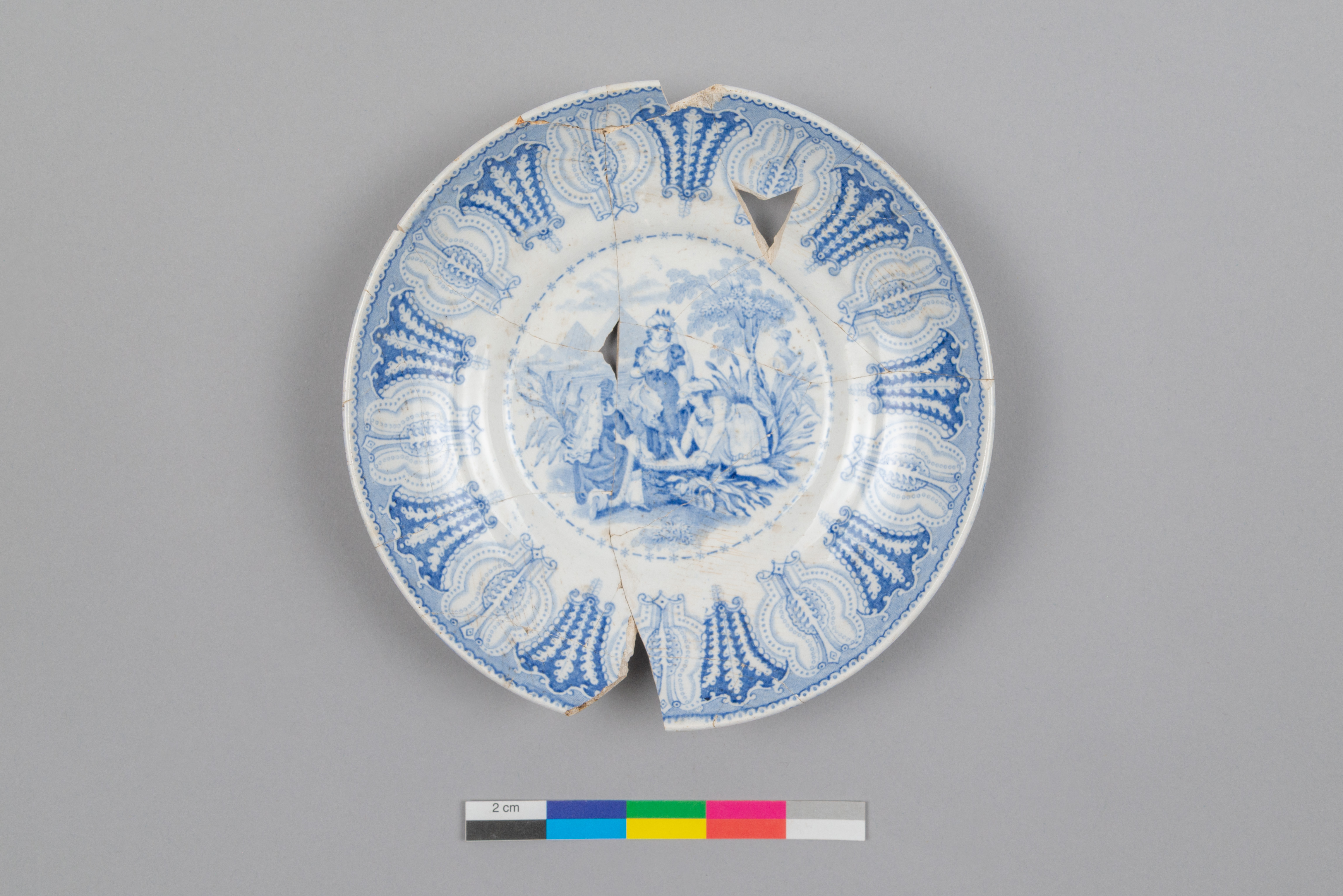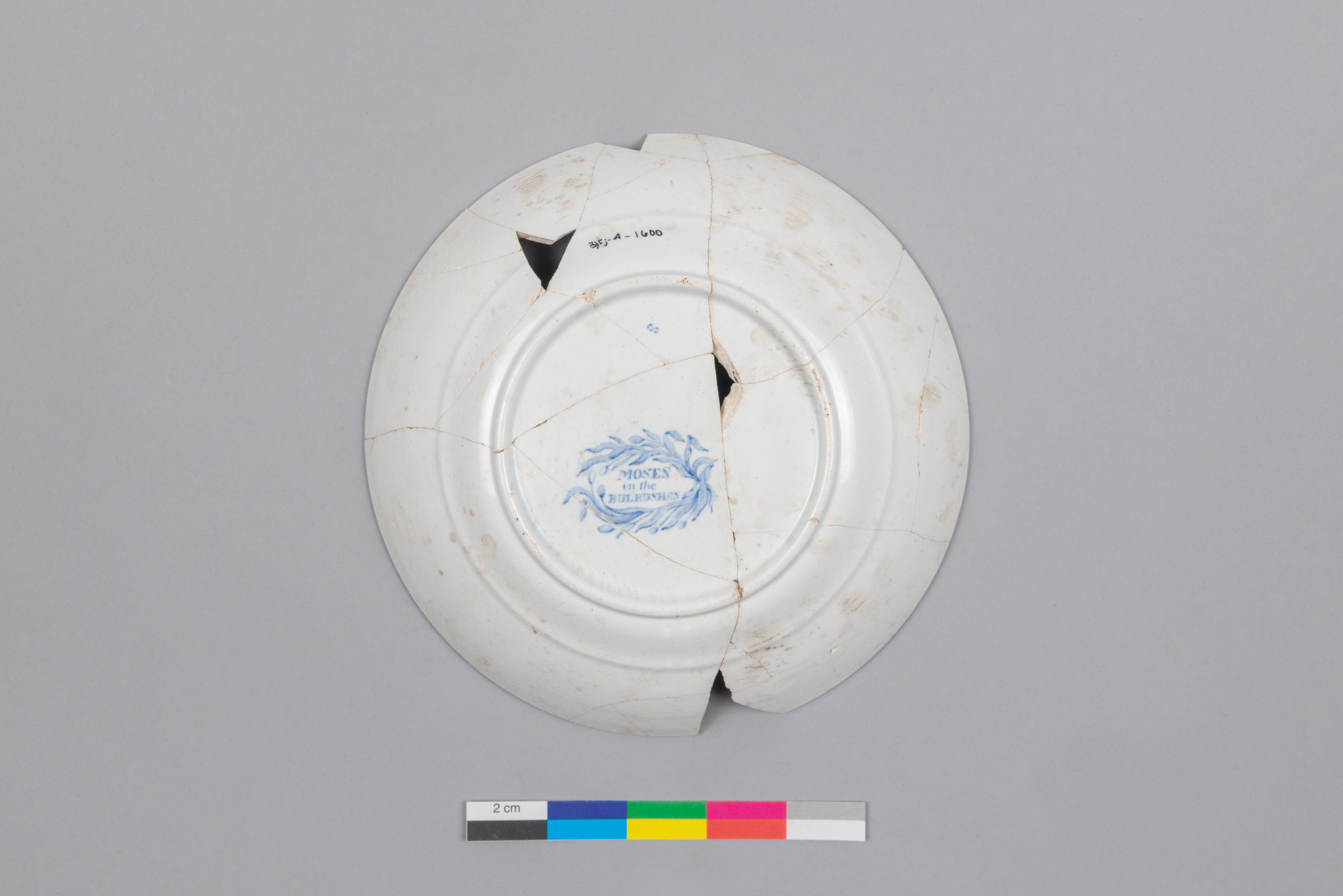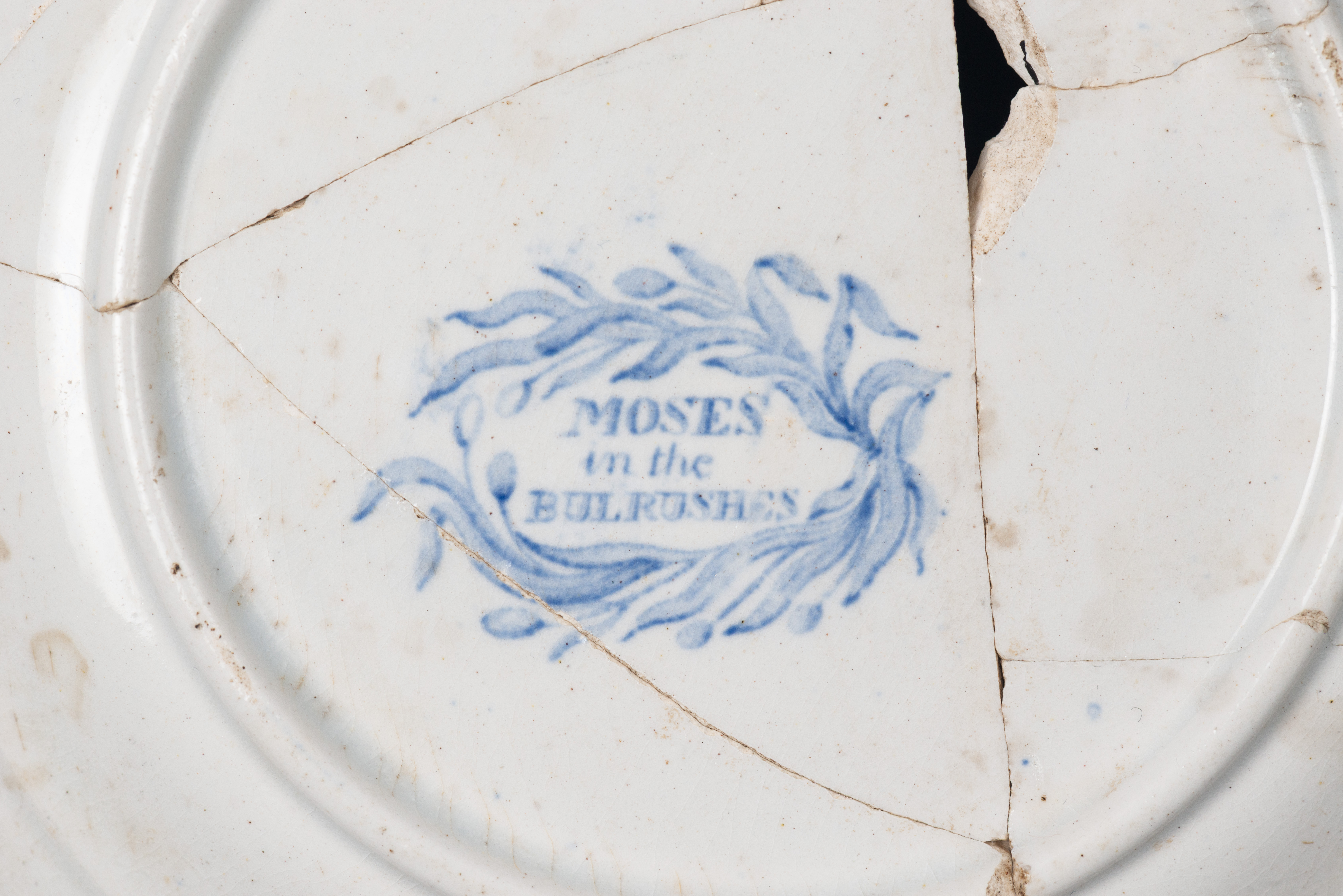 La soucoupe en terre cuite fine blanche est fabriquée au Royaume-Uni entre 1830 et les années 1840. Elle présente un décor imprimé d'inspiration biblique nommé « Moses in the Bulrushes ». La thématique biblique est peu fréquemment rencontrée sur les décors imprimés, bien qu'elle soit présente tout au long du XIXe siècle. Ces décors semblent plus fréquents sur les céramiques au cours du deuxième quart du XIXe siècle. Les potiers anglais s'inspirent d'œuvres littéraires, d'arts de la scène ou de traditions orales pour créer leurs motifs selon la mode du moment. Fables, extraits de pièce de théâtre, mythologie, poèmes et passages de la Bible sont donc copiés ou réinterprétés. Ici, le décor représente « Moïse sauvé des eaux » ou « Moïse dans les joncs » provenant du deuxième chapitre du livre de l'Exode dans l'Ancien Testament. Cet épisode biblique raconte le moment où l'enfant Moïse, couché dans son panier de jonc, est retiré des eaux du Nil par la fille du Pharaon. Plusieurs potiers semblent avoir créé leur propre variante de ce passage. Le présent décor est réalisé en bleu pâle, une teinte de bleu introduite vers 1818, puis majoritairement utilisée sur les décors imprimés au cours des années 1830 et 1840.