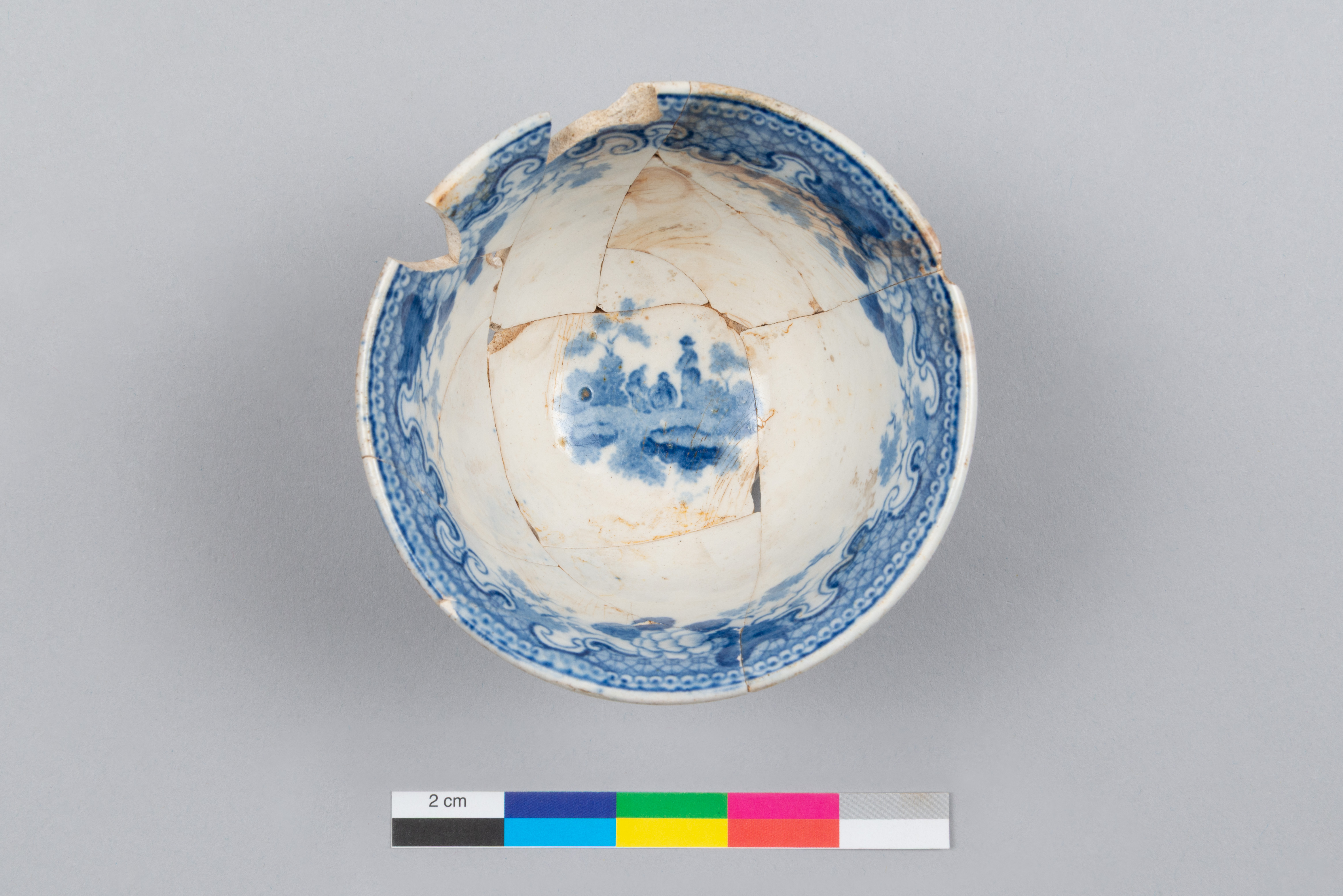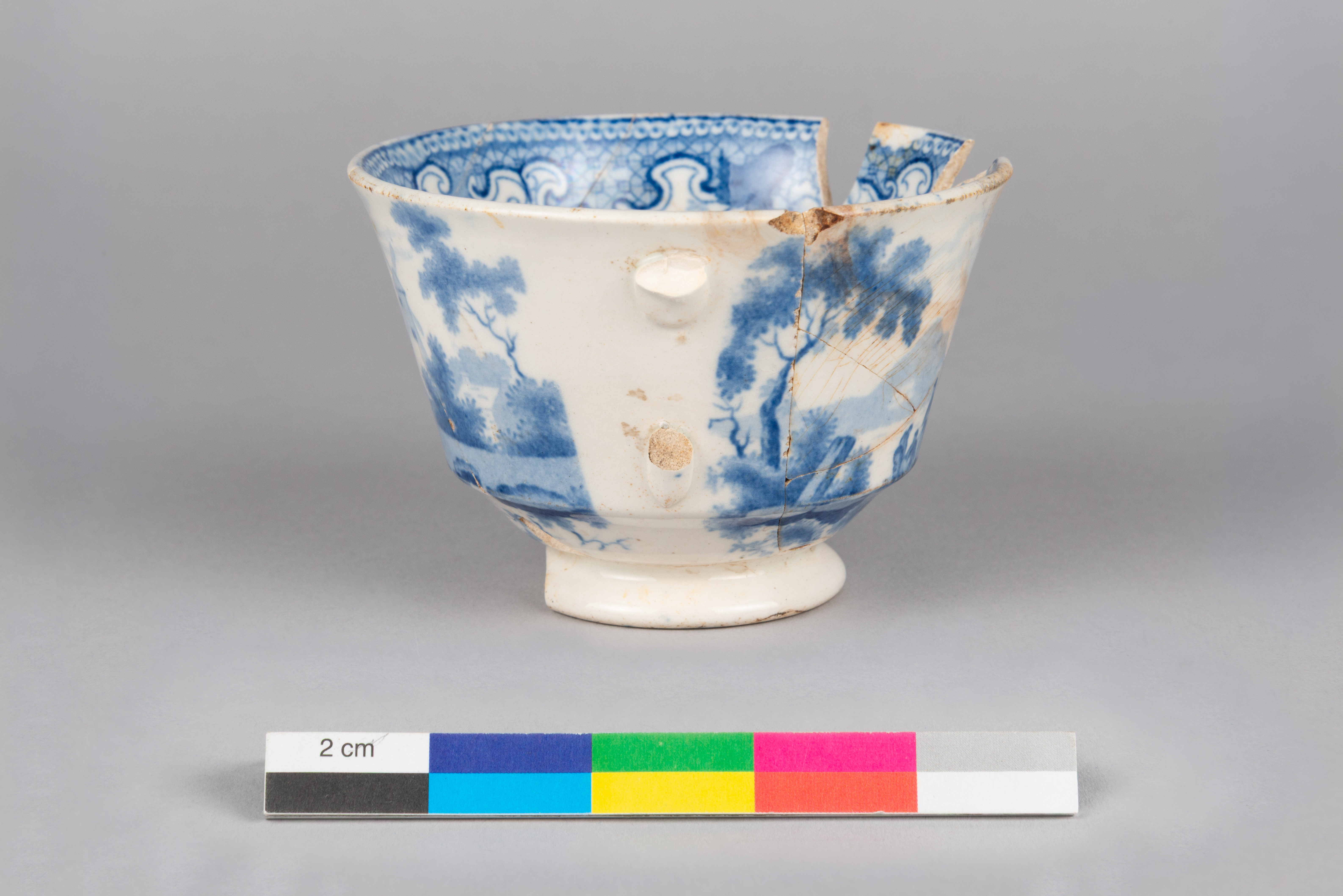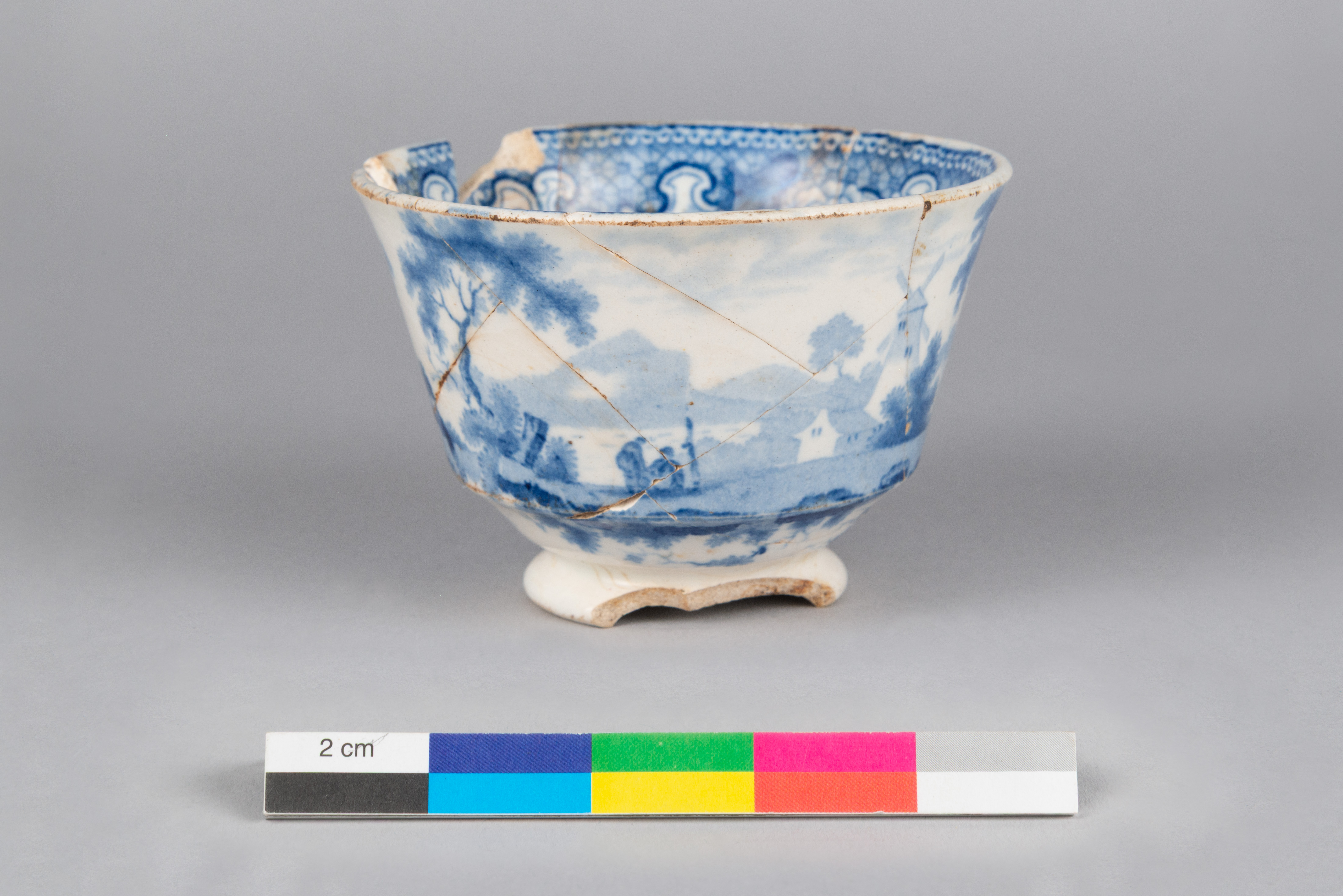 La tasse en terre cuite fine blanche est fabriquée au Royaume-Uni entre 1825 et les années 1840. Cette tasse est de forme « London Shape », ayant un rebord évasé à lèvre arrondie, une paroi carénée et un piédouche. Cette forme semble apparaitre vers 1812 et prédomine entre 1825 et les années 1840. Un décor imprimé en bleu orne la tasse sur sa paroi extérieure, sur sa bordure intérieure et en son centre. Le motif s'inscrit dans la tendance « pastorale » des décors sur céramiques blanches du XIXe siècle. Cette mode est caractérisée par des scènes rurales avec, à l'avant-plan, des animaux ou des personnages au travail. Sur cette tasse, le décor est composé d'un paysage comprenant un moulin à vent attenant à une maison ainsi que trois personnages au travail dans un champ entouré d'arbres. À l'arrière-plan se trouvent une rivière ainsi que plusieurs montagnes et vallons. Le centre de la tasse comprend les mêmes trois personnages dans un champ entouré d'arbres. La bordure intérieure est ornée d'un motif floral et de volutes répétées non continues sur un fond géométrique. Le décor sur la tasse présente quelques superpositions, indiquant que l'apposition a été mal effectuée.