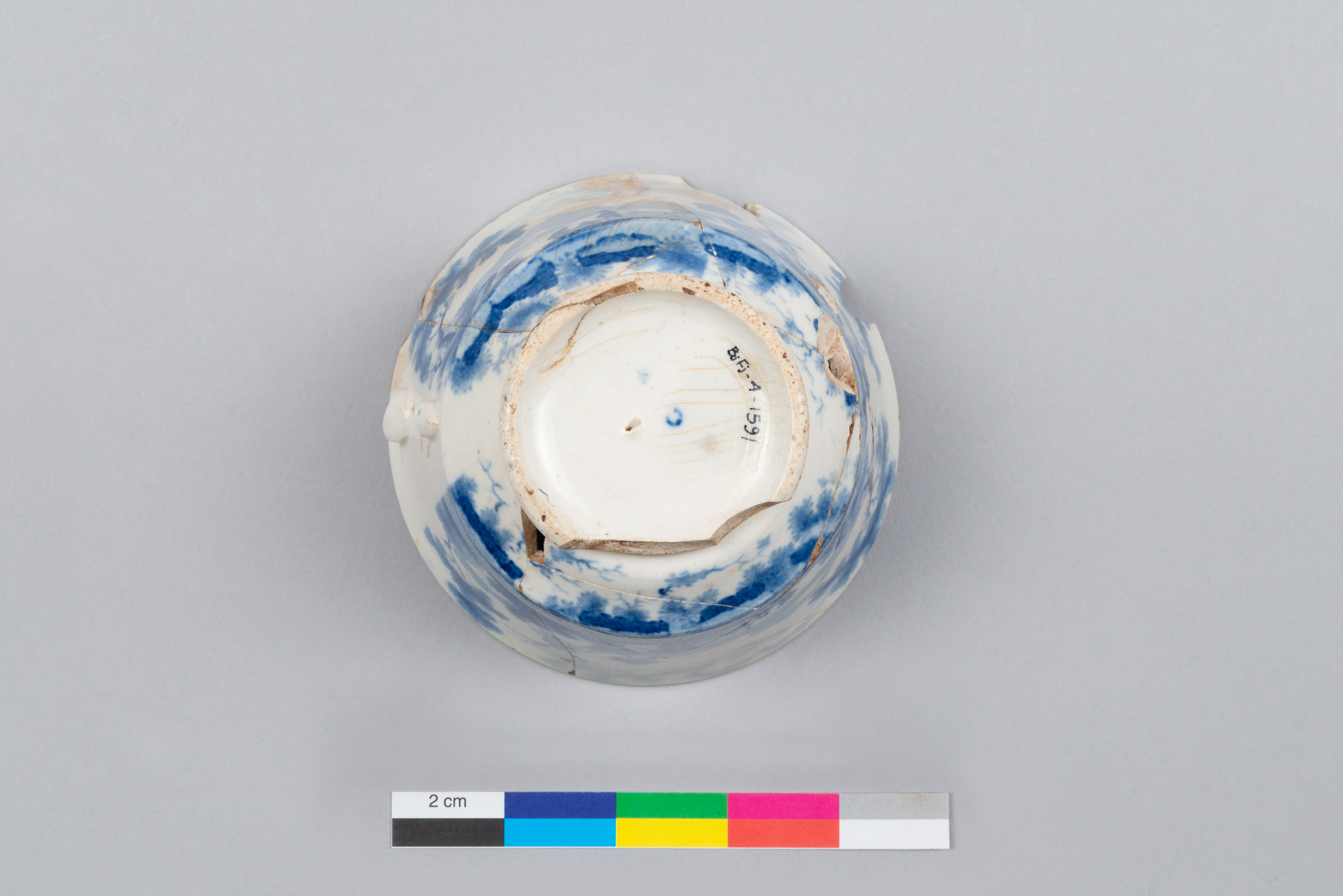 La tasse provient de la cave des celliers de la section nord de l'aile ouest du premier marché Sainte-Anne (1834-1844). Sous les décombres du Parlement incendié le 25 avril 1849, plusieurs monticules de déchets ont été localisés par les archéologues le long des murs entre les piliers ou contreforts soutenant les planchers des celliers du marché. Ces monticules ont révélé une importante quantité d'artéfacts complets après remontage qui aurait été jetée dans les caves par les trappes des planchers avant 1844 ou 1849. Étant donné leur position stratigraphique et l'absence d'altération par le feu, ces artéfacts sont associés à la période d'occupation des celliers par divers locataires du premier marché.