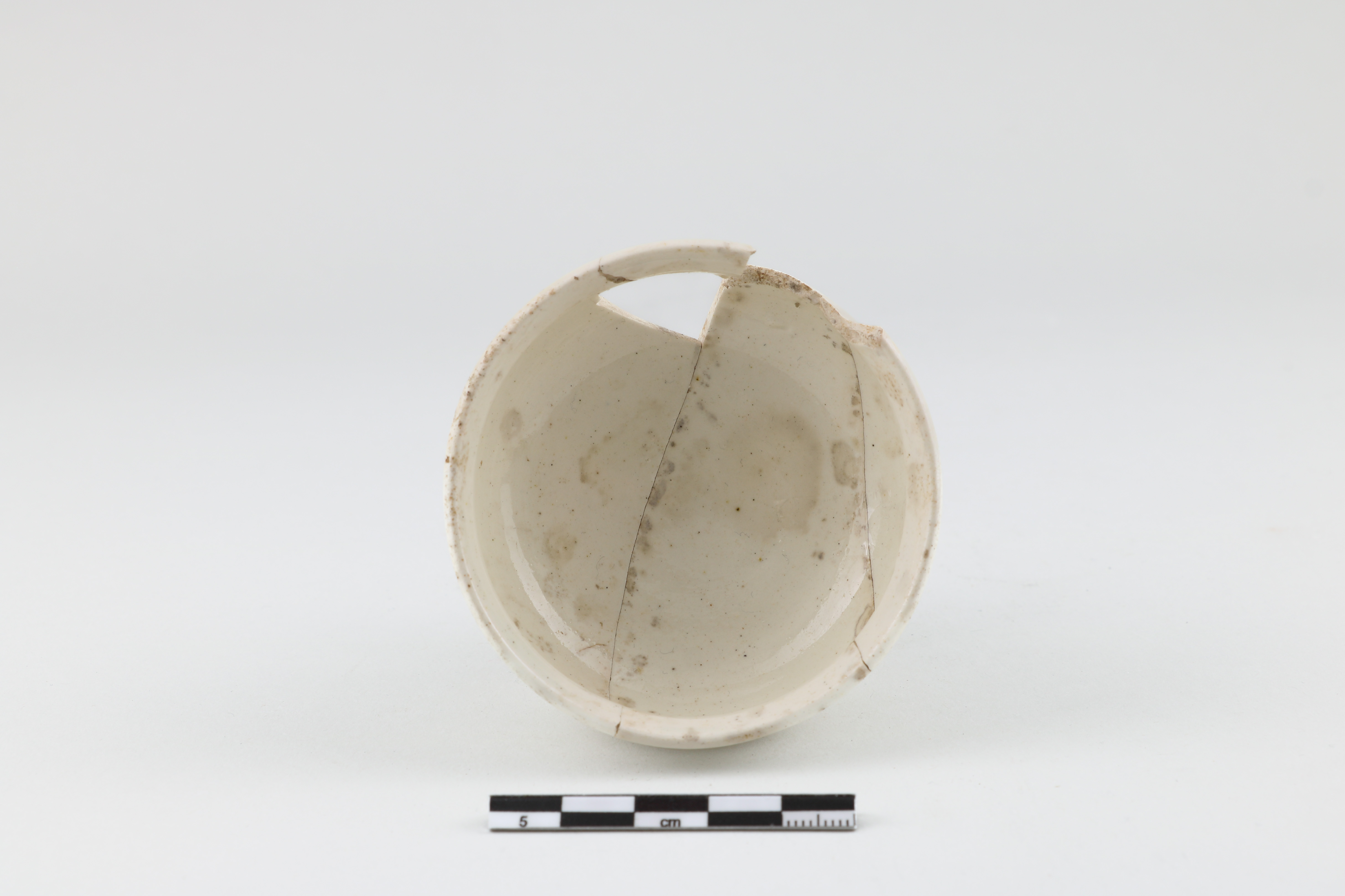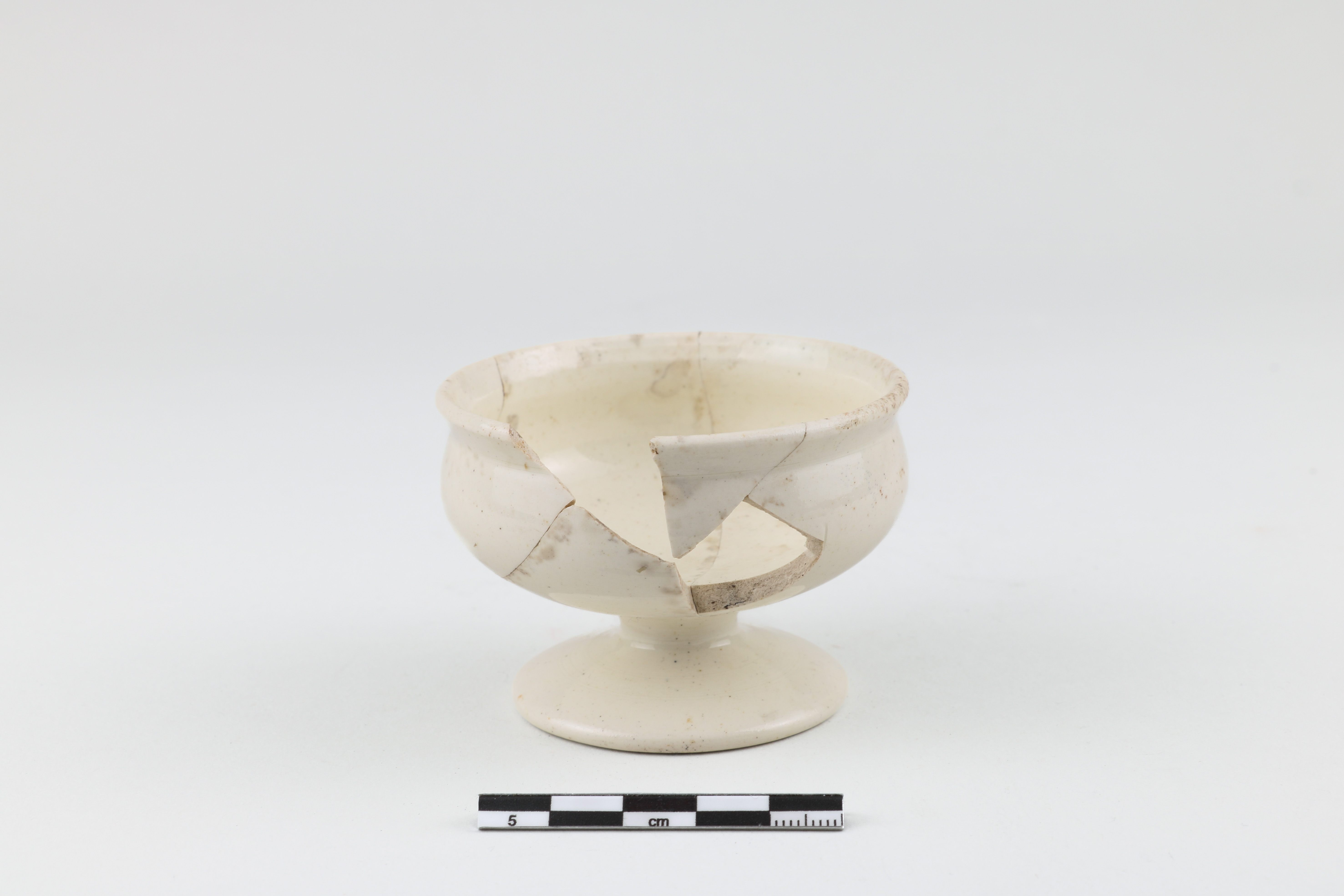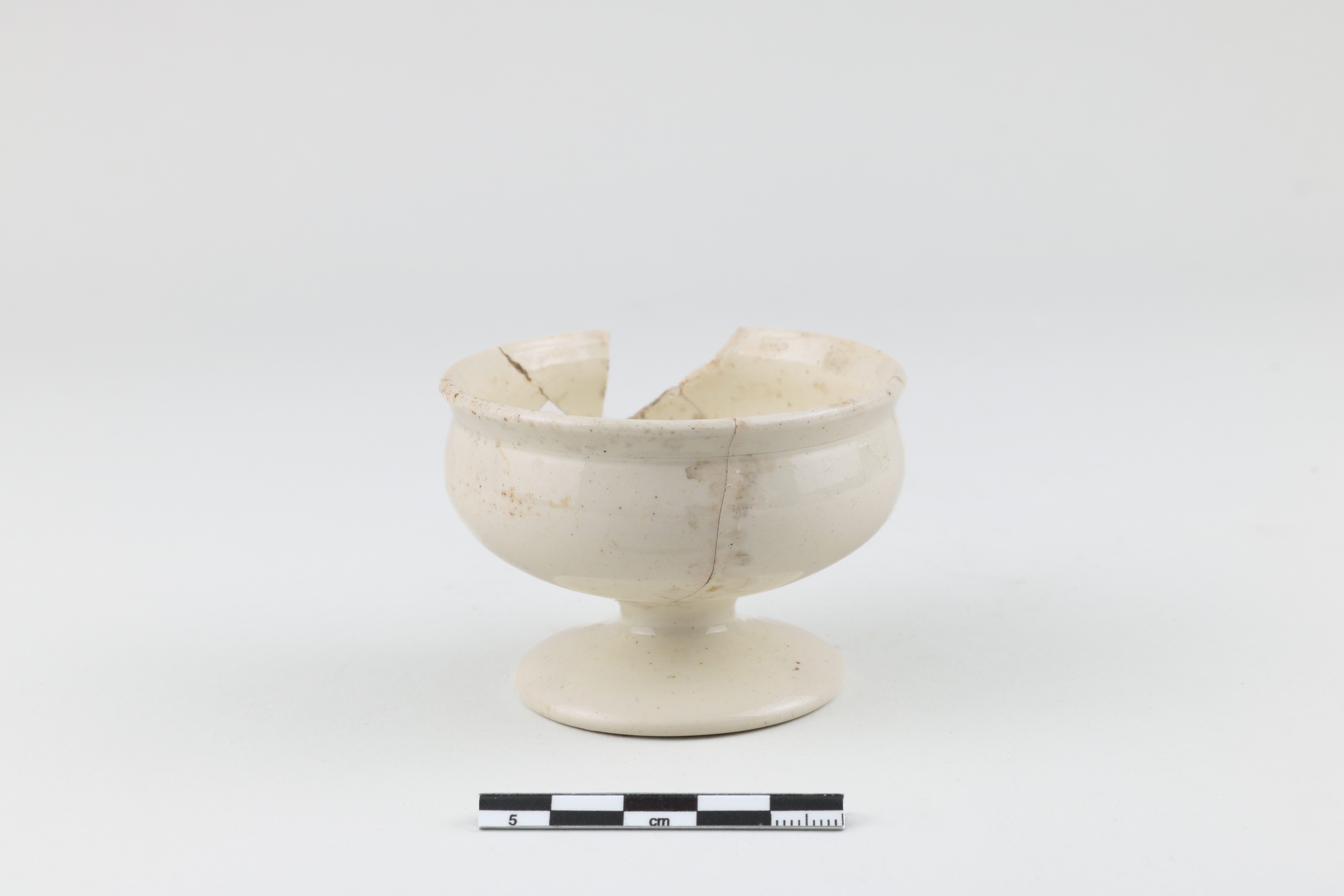 La salière est un contenant lié à l'alimentation datant du premier tiers du XIXe siècle. Complète, cette salière en terre cuite fine blanche est composée de quatre fragments. Elle est munie d'une coupe circulaire hémisphérique au rebord évasé vers l'extérieur. Elle repose sur une tige cylindrique courte et un pied circulaire en cône peu profond. Sans décor, la salière mesure 7,2 cm de diamètre et 5,1 cm de hauteur.