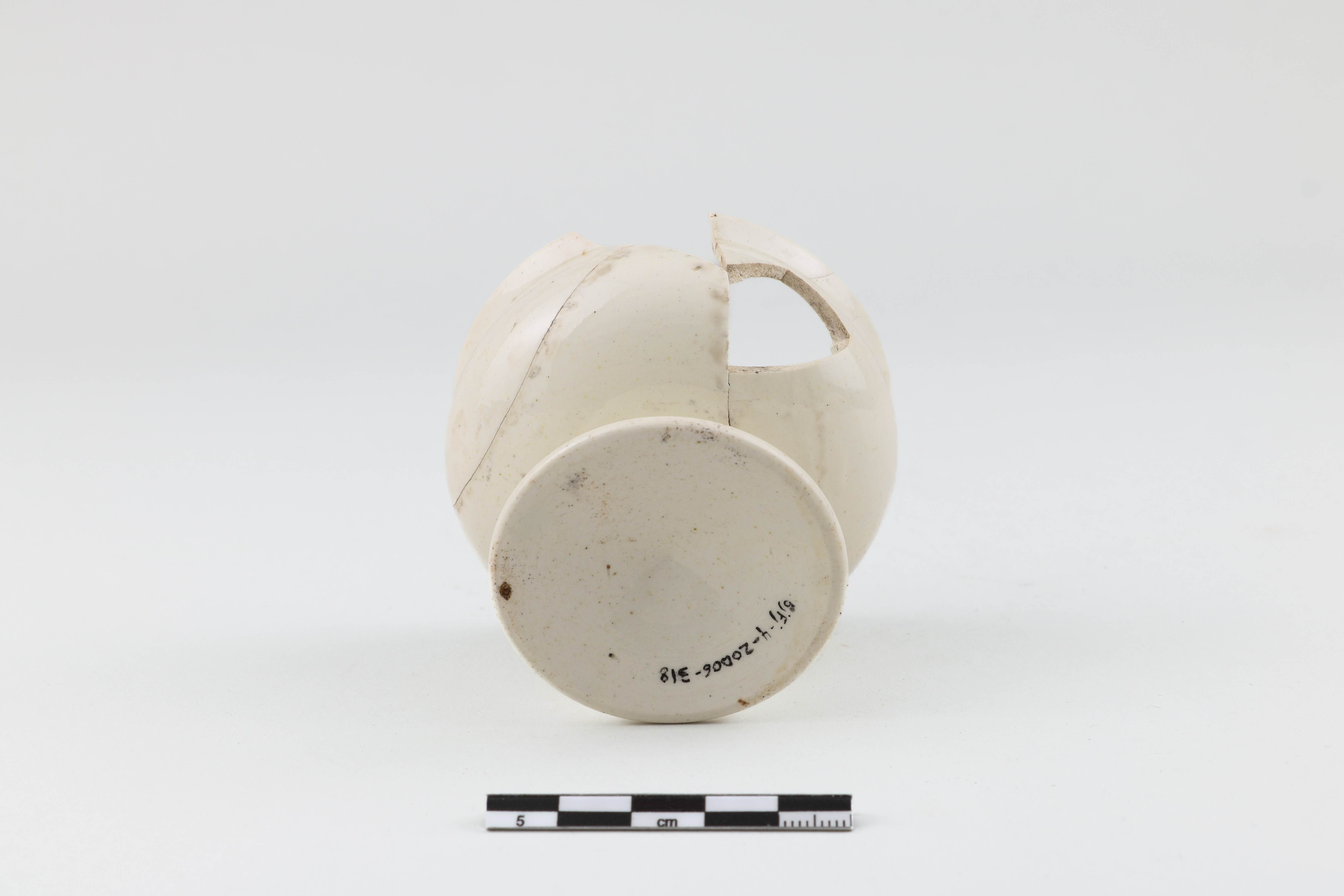 La salière en terre cuite fine blanche est fabriquée au Royaume-Uni entre 1800 et les années 1830. Elle est moulée et cuite une première fois, puis est ensuite trempée dans la glaçure et recuite. Le type céramique peut être identifié comme de la terre cuite fine à glaçure bleutée, en raison de la présence de cobalt dans la glaçure.