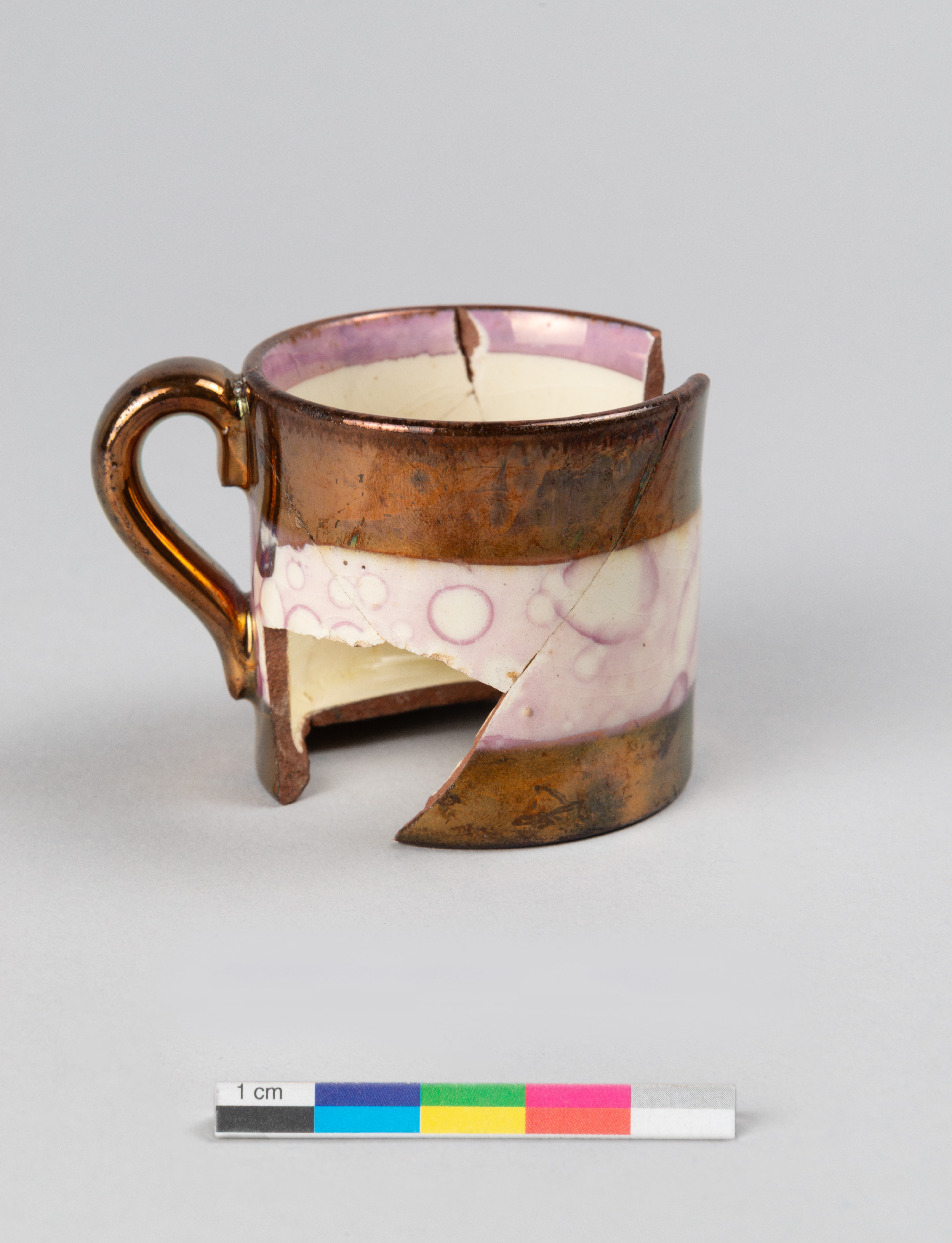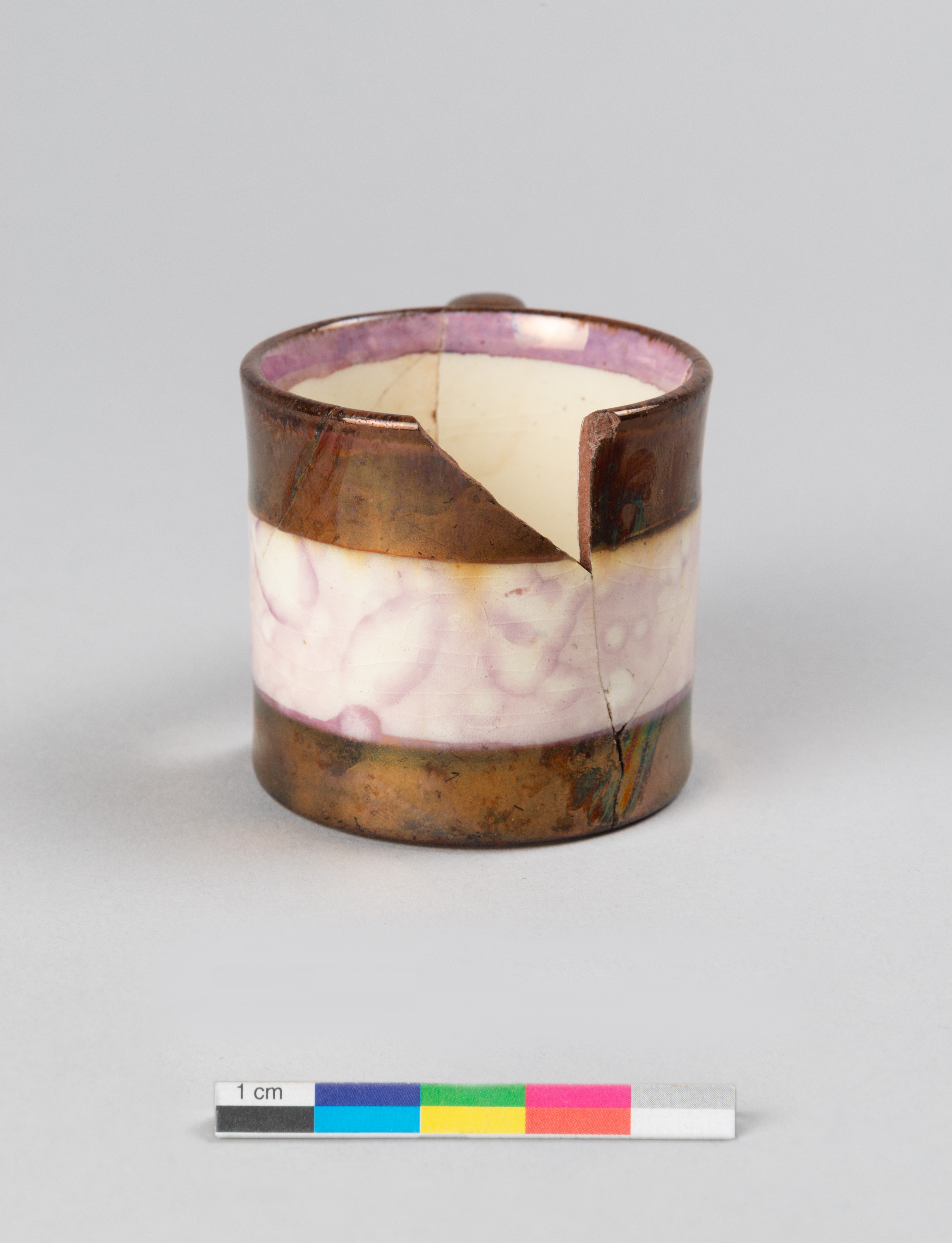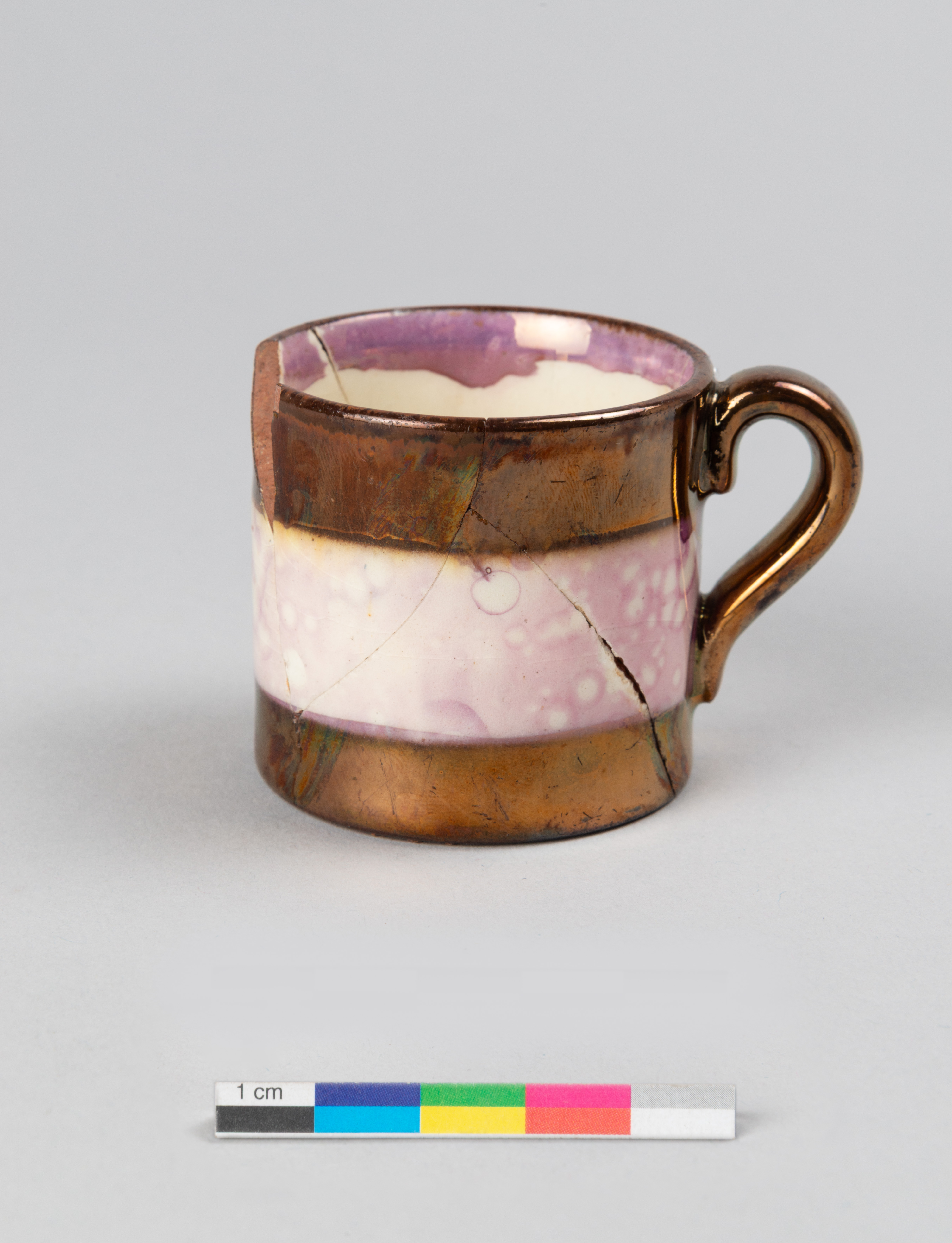 La tasse d'enfant ou tasse jouet en terre cuite fine rouge est fabriquée entre 1820 et 1849 au Royaume-Uni. L'objet présente un décor lustré métallique à effet cuivré appelé « Copper Lustre ». La tasse comporte également une large bande horizontale à motif d'éclaboussures diffuses « Splashed lustre » de couleur rose-mauve lustré sur fond d'engobe blanc. Cette technique, généralement réalisée en lustre rose, est réalisée en pulvérisant des gouttes d'huile sur la surface lustrée. L'effet d'éclaboussures se produit lors de la cuisson. Cette technique de décoration est généralement produite entre les années 1820 et les années 1840. Elle est rapide à produire et peut être réalisée par une main-d'œuvre peu qualifiée comme des enfants ou des journaliers.