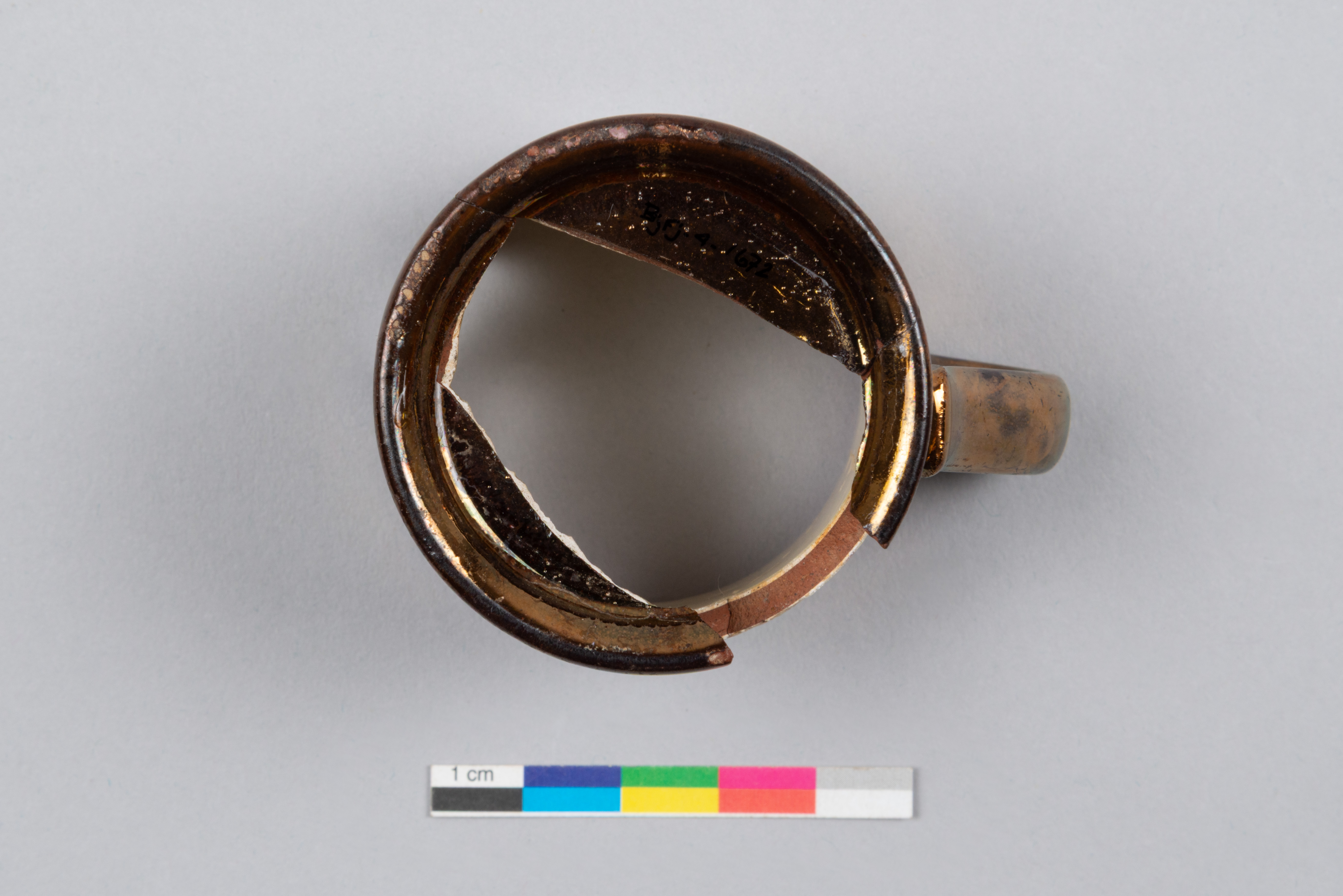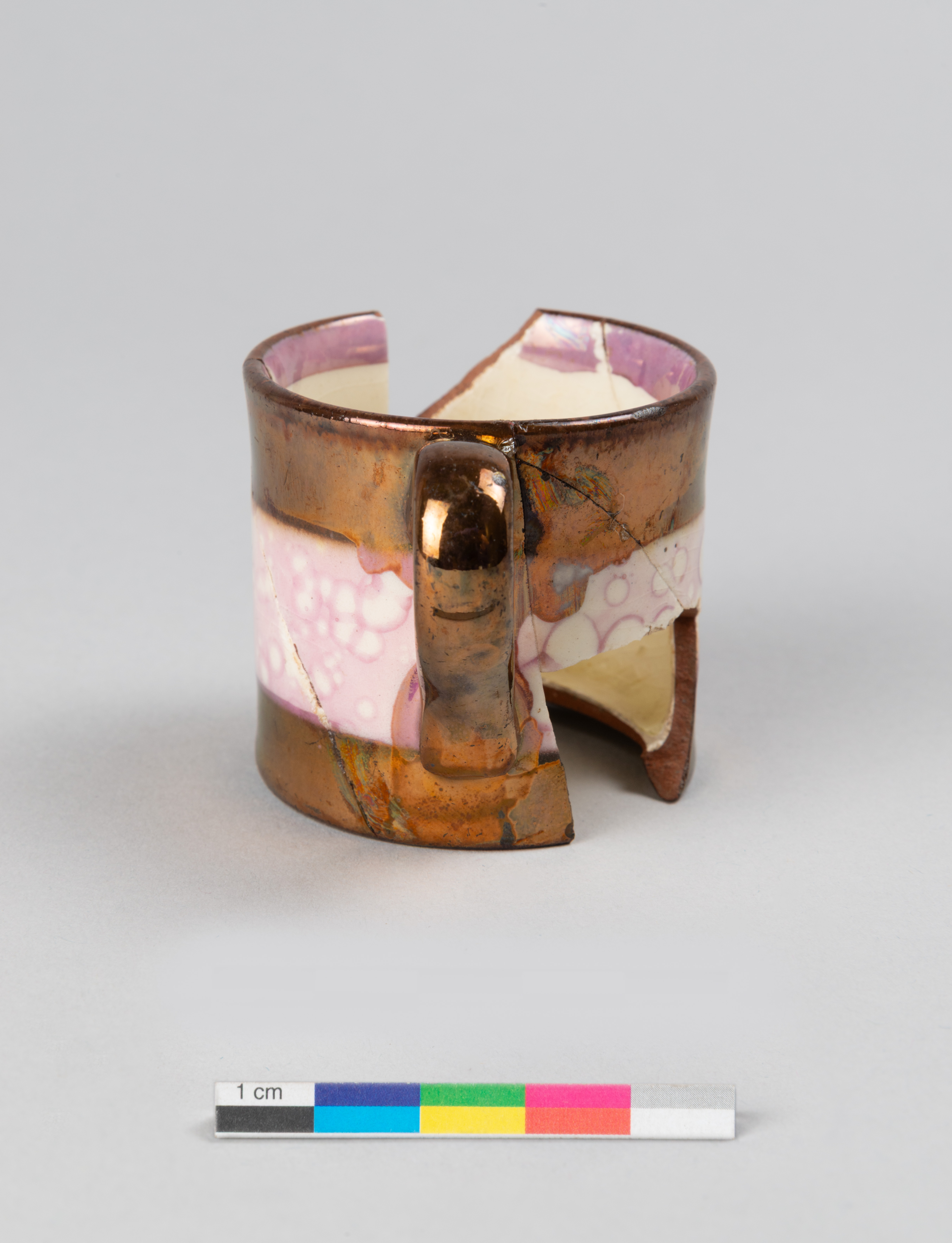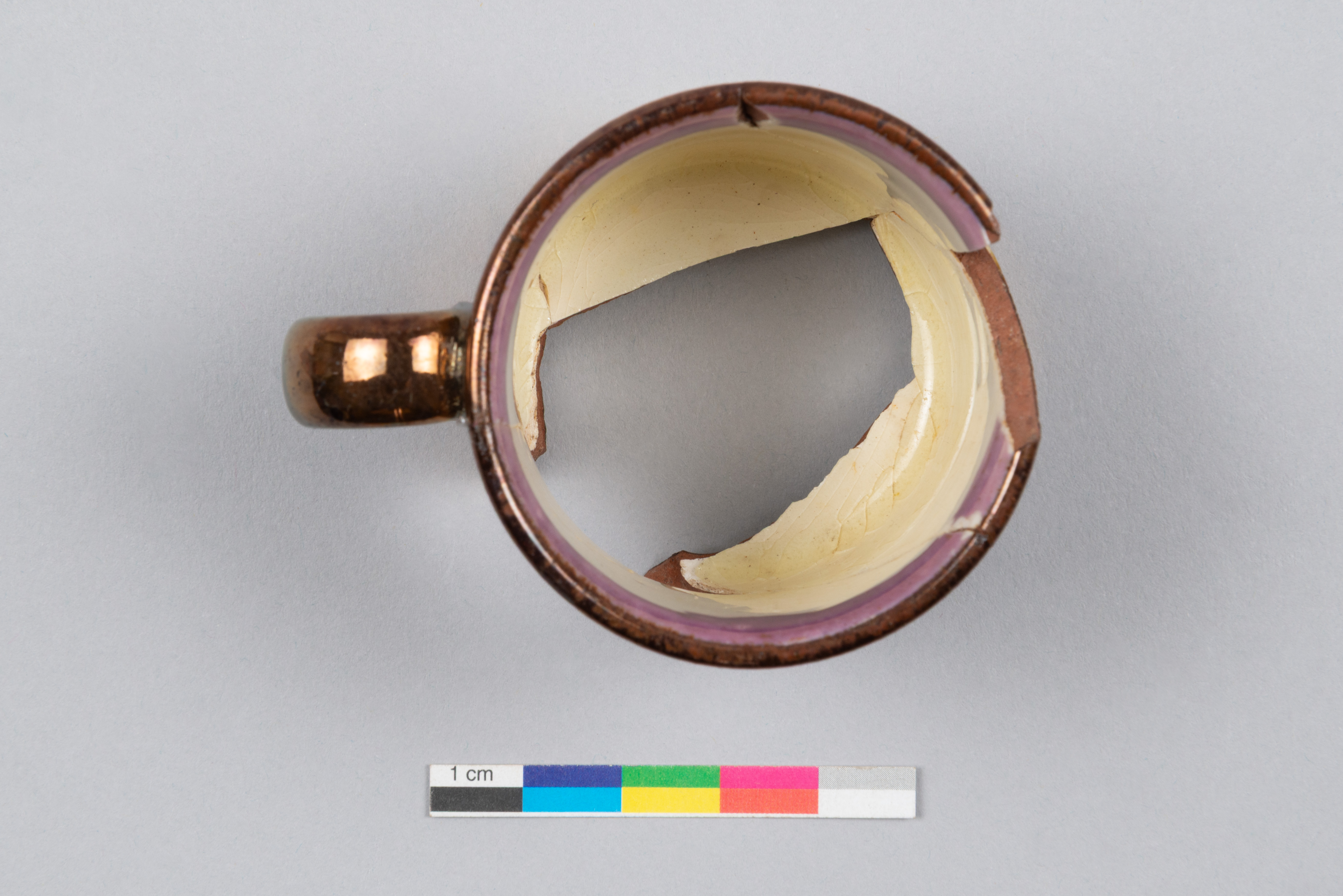 La tasse d'enfant ou tasse jouet en terre cuite fine rouge est fabriquée entre 1820 et 1849 au Royaume-Uni. L'objet présente un décor lustré métallique à effet cuivré appelé « Copper Lustre ». La tasse comporte également une large bande horizontale à motif d'éclaboussures diffuses « Splashed lustre » de couleur rose-mauve lustré sur fond d'engobe blanc. Cette technique, généralement réalisée en lustre rose, est réalisée en pulvérisant des gouttes d'huile sur la surface lustrée. L'effet d'éclaboussures se produit lors de la cuisson. Cette technique de décoration est généralement produite entre les années 1820 et les années 1840. Elle est rapide à produire et peut être réalisée par une main-d'œuvre peu qualifiée comme des enfants ou des journaliers.