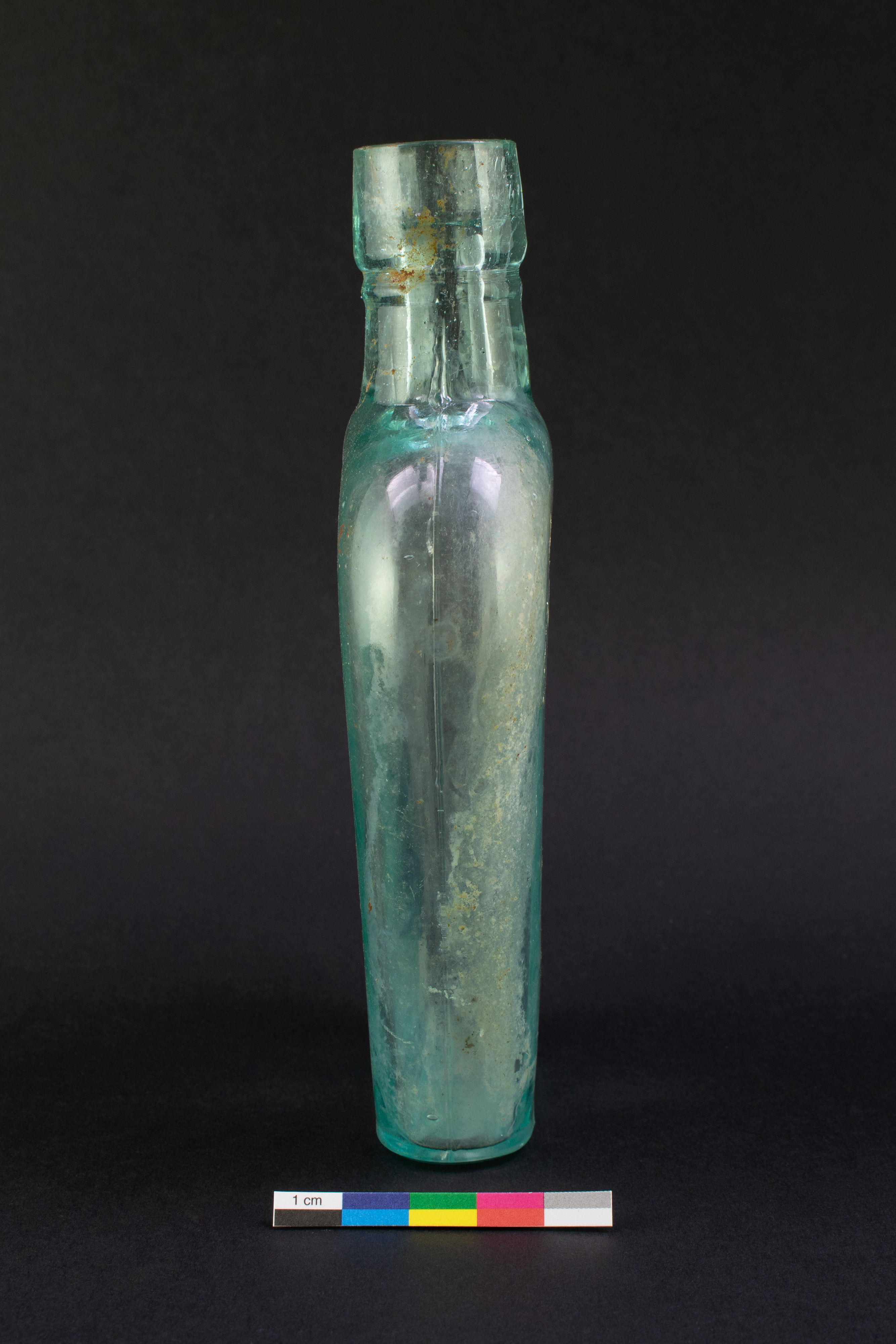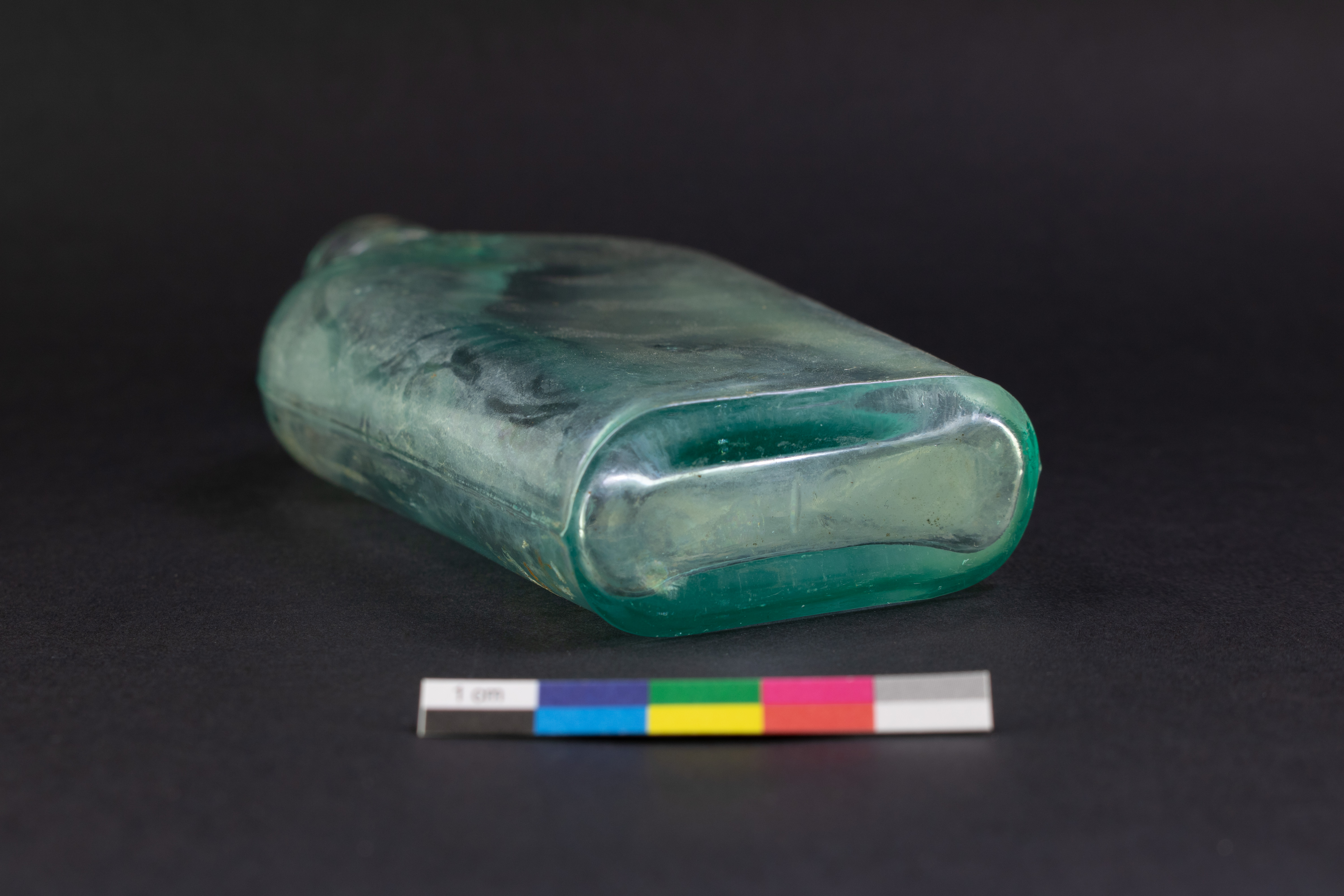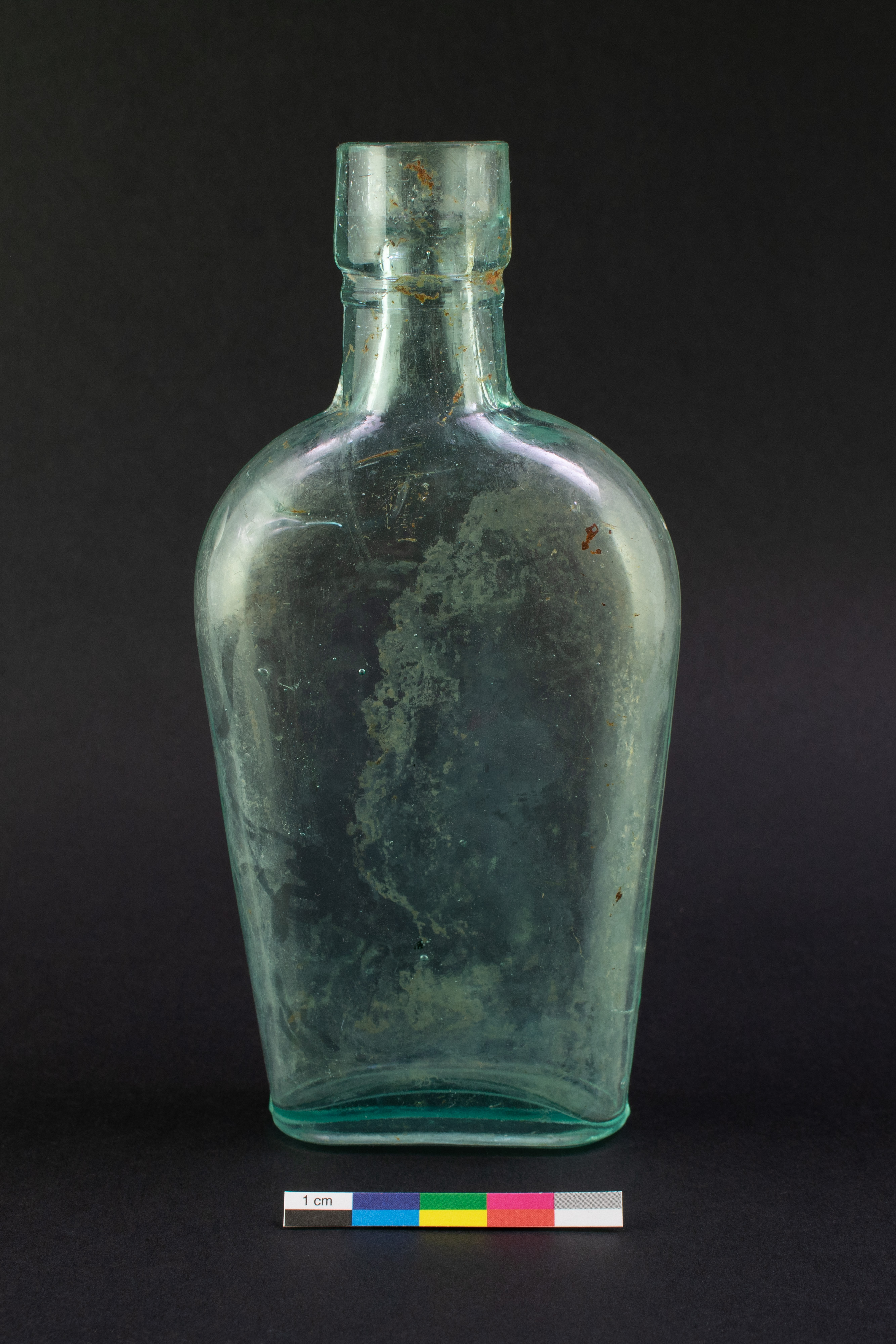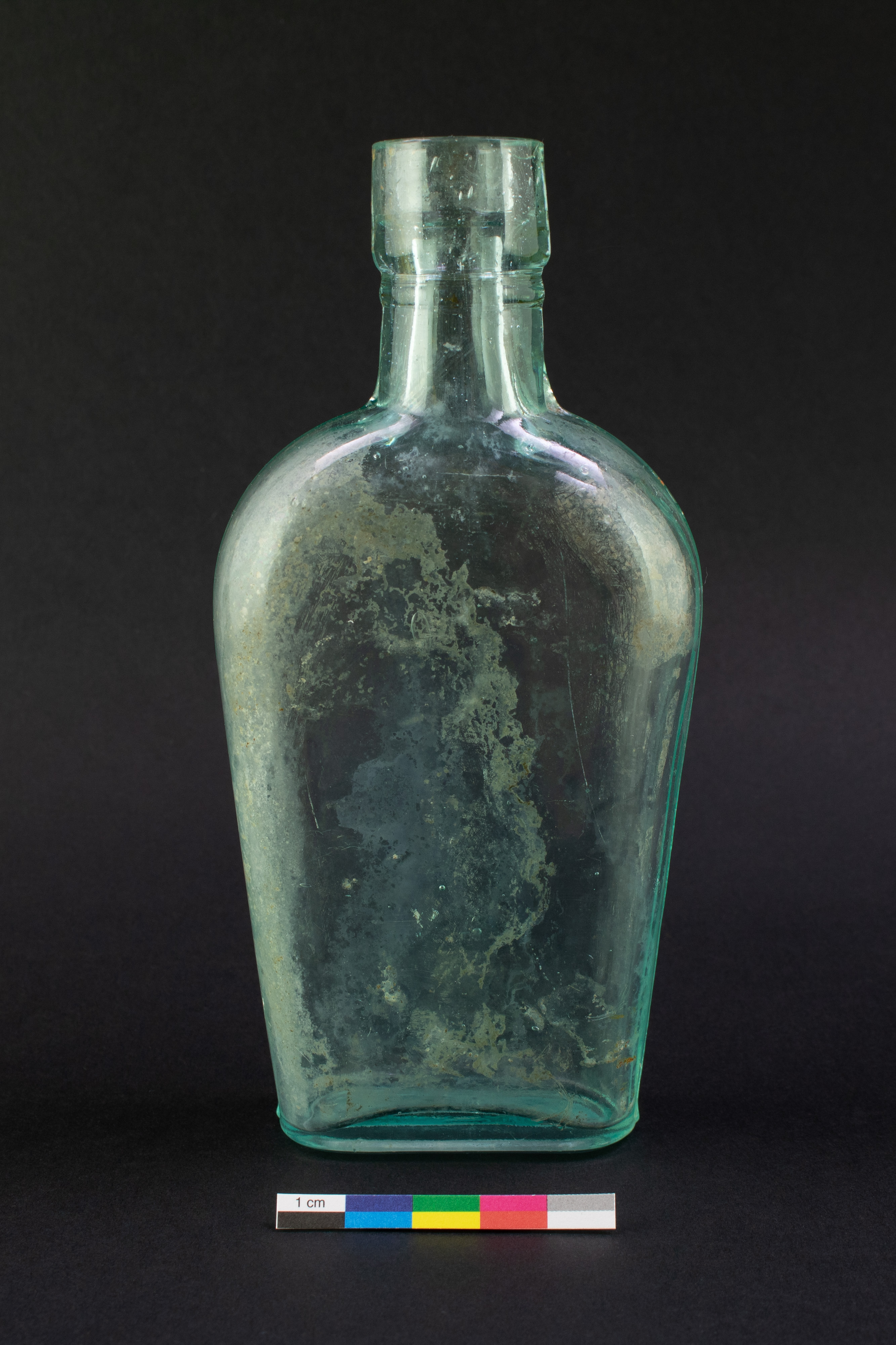 La flasque est un récipient servant à la conservation des spiritueux datant d'entre le dernier quart du XIXe siècle et le tournant du XXe siècle. Entière, la flasque est moulée en verre teinté régulier de couleur turquoise. Elle comporte un col court, une épaule arrondie et un corps typique des flasques de type « shoofly », avec une base légèrement plus étroite que l'épaule, et une base ovale avec deux pans plats. Le goulot est terminé par une lèvre aplatie ajoutée. Le nombre « 13 » est moulé en relief sous la base. L'objet a une hauteur de 16 cm et une base rectangulaire mesurant 6 cm sur 2,5 cm.
