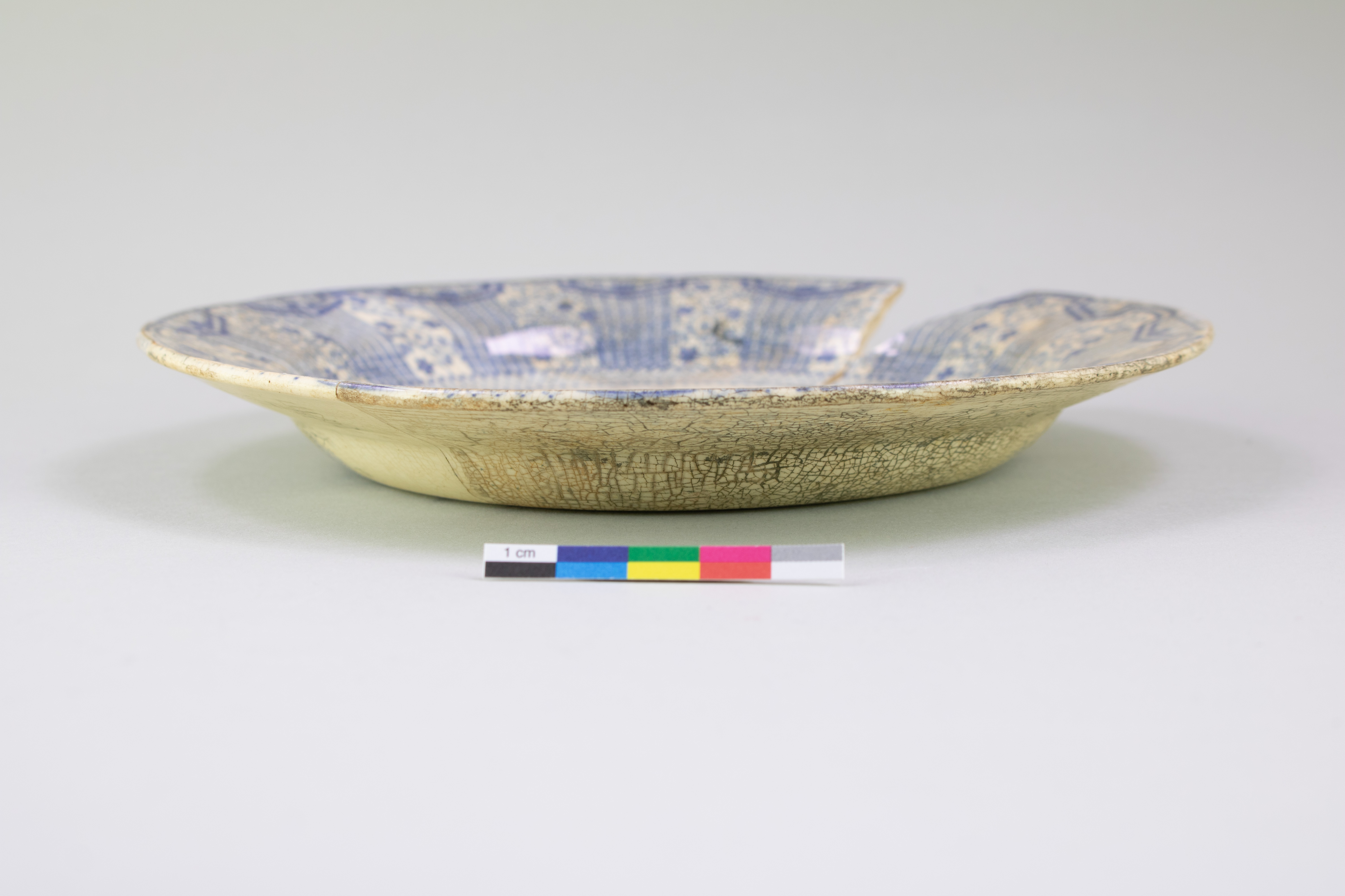 La soucoupe est un récipient lié à l'alimentation datant d'entre le deuxième tiers et la première moitié du XIXe siècle. Complète et possédant quatre tessons jointifs, la soucoupe est fabriquée en terre cuite fine blanche. Un décor imprimé en bleu comprend des motifs floraux, géométriques ainsi qu'une scène illustrant une femme qui pratique le funambulisme sur une corde avec un balancier en main. Des inscriptions sont également imprimées sous la soucoupe. L'objet mesure 2,5 cm de hauteur et a un diamètre de 19,5 cm.