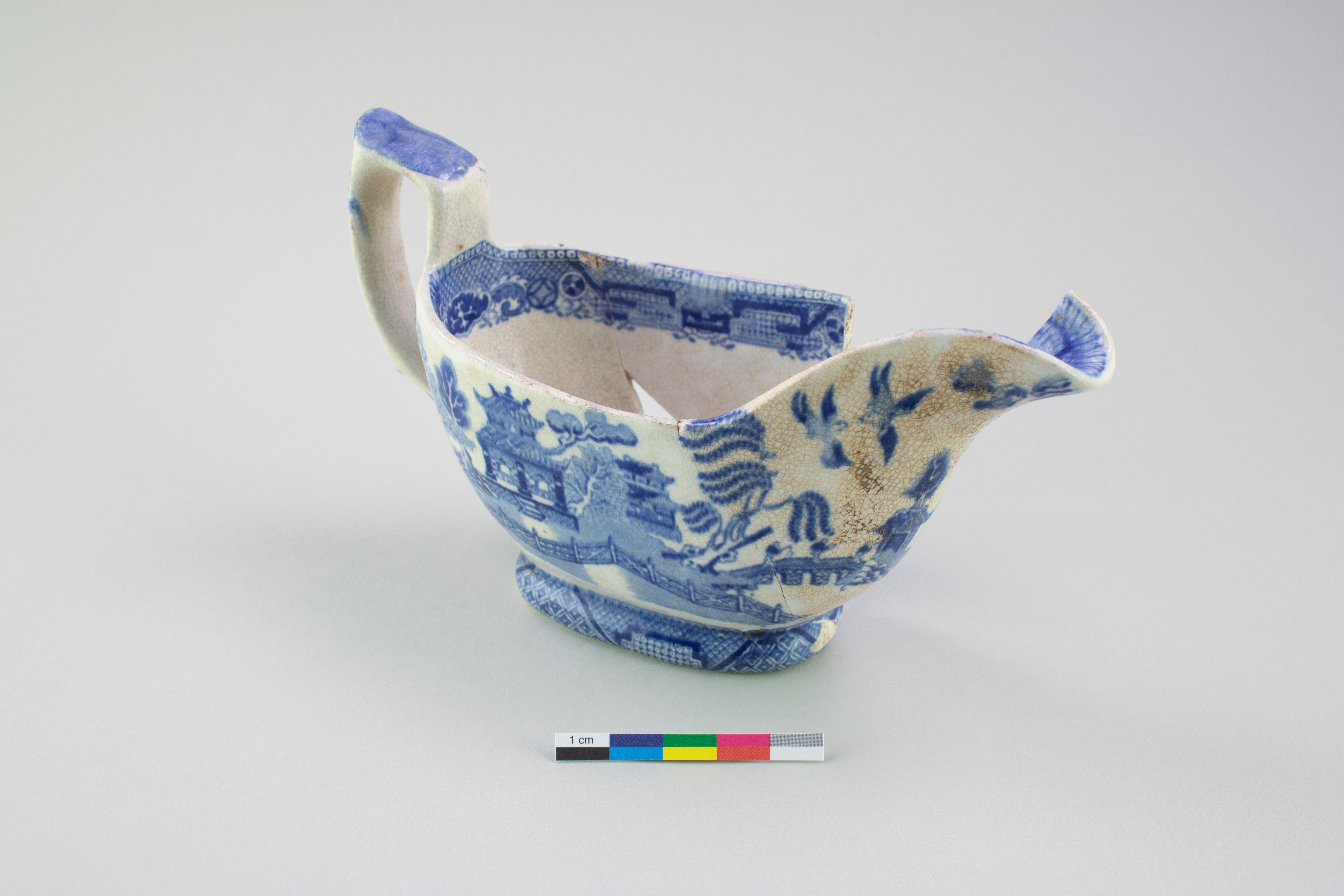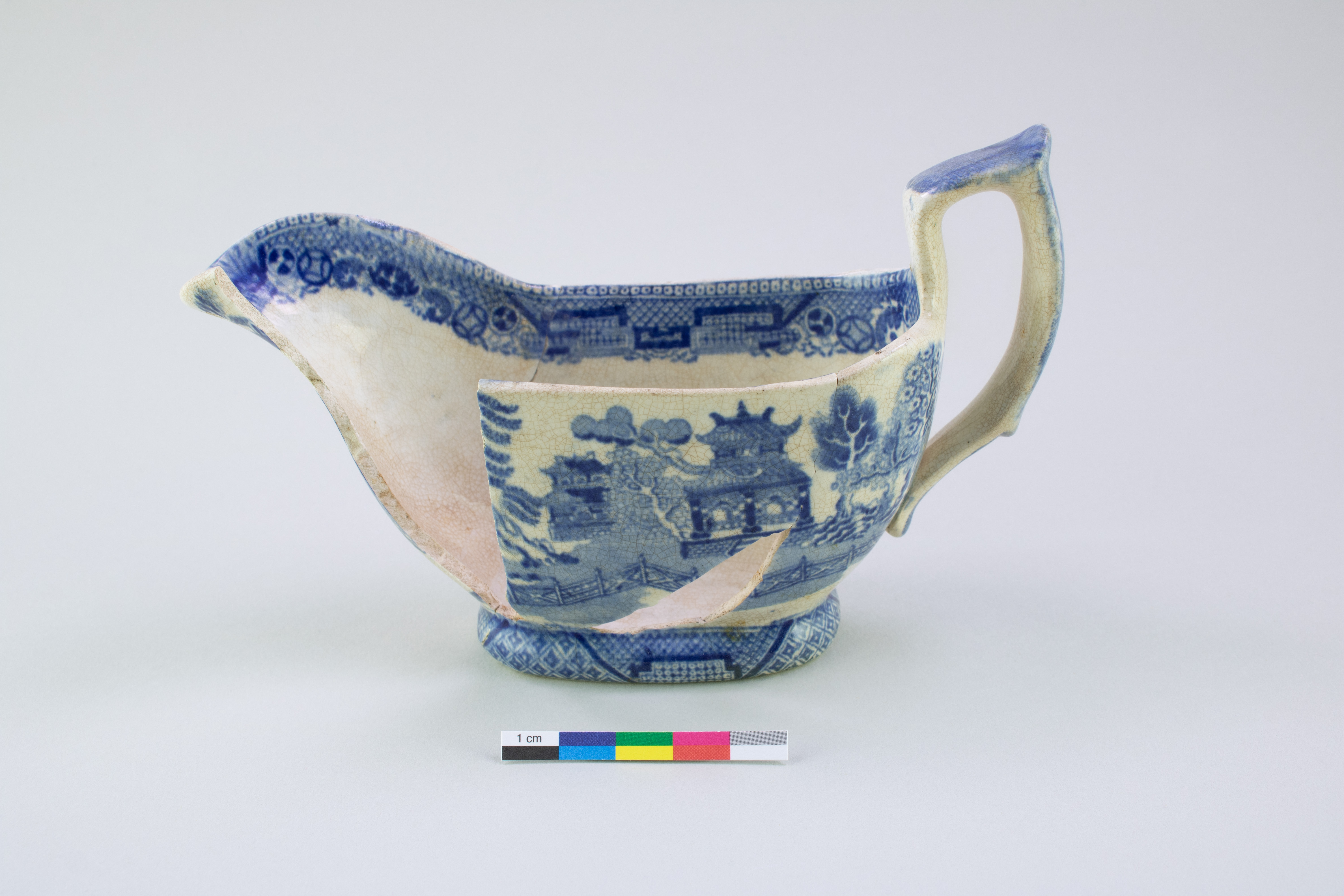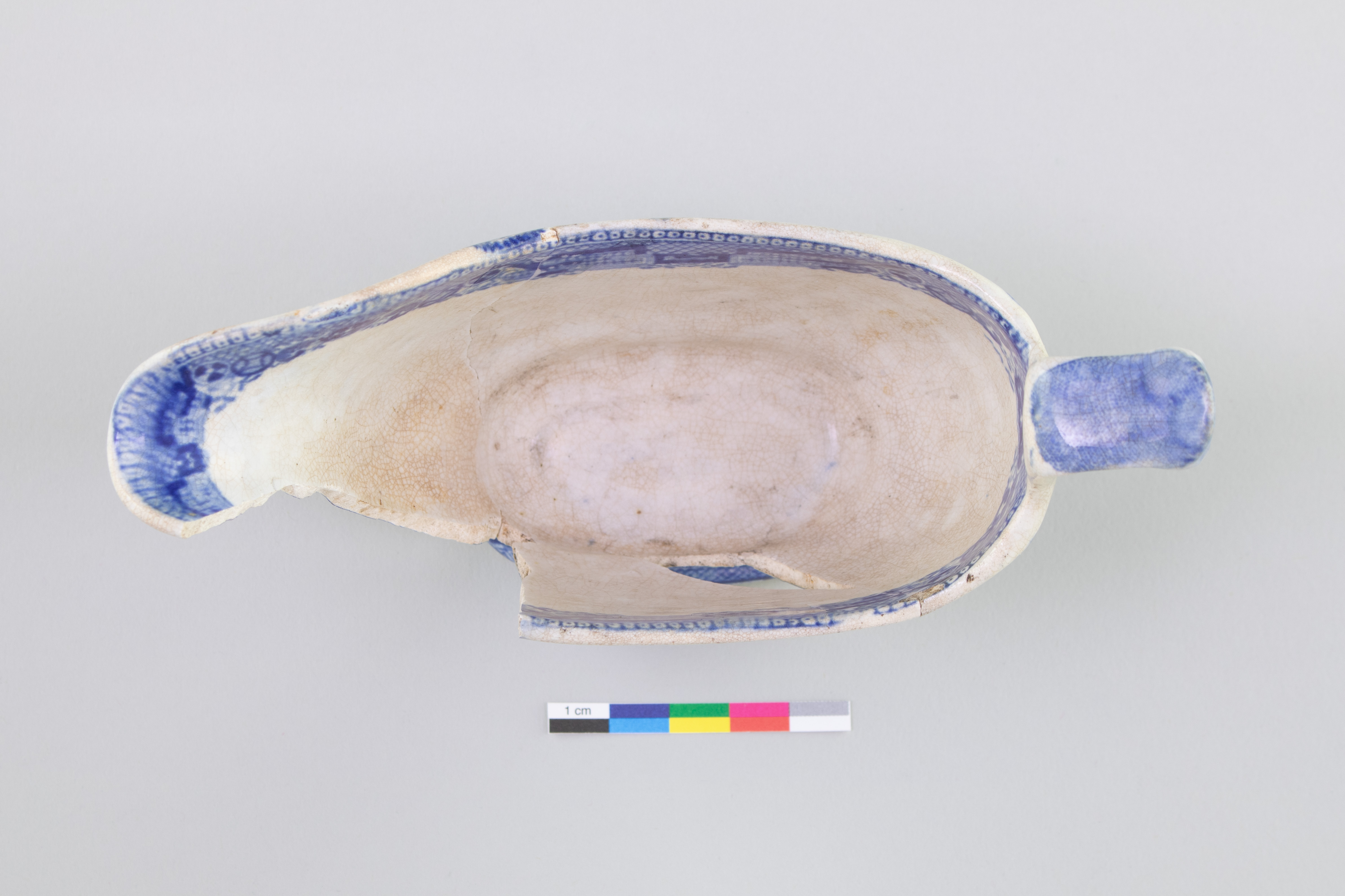 La saucière ovale est fabriquée en terre cuite fine blanche, probablement entre 1836 et 1850 à Hanley, en Angleterre. Parfois appelée « en forme bateau », cette saucière possède un piédouche, un bec verseur à une extrémité et une anse carrée à l'autre extrémité. Un décor imprimé bleu de type « Willow » orne le récipient sur sa surface extérieure ainsi qu'en bordure près du rebord, sur la surface intérieure. D'après la marque située sous la saucière, qui semble correspondre aux lettres « RCA », il pourrait s'agir d'une production par Read, Clementson and Anderson, potiers de Hanley en activité à partir de 1836.