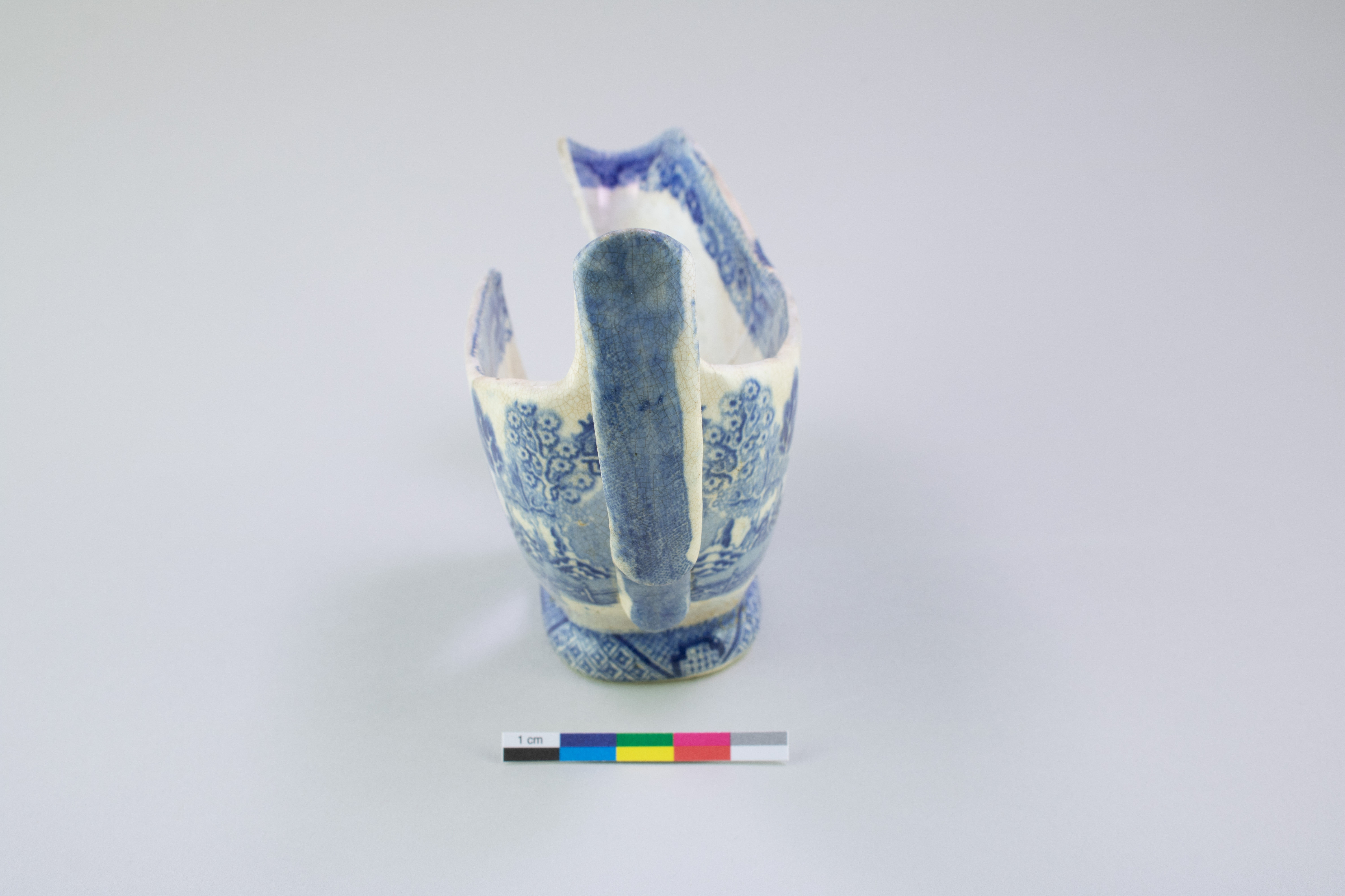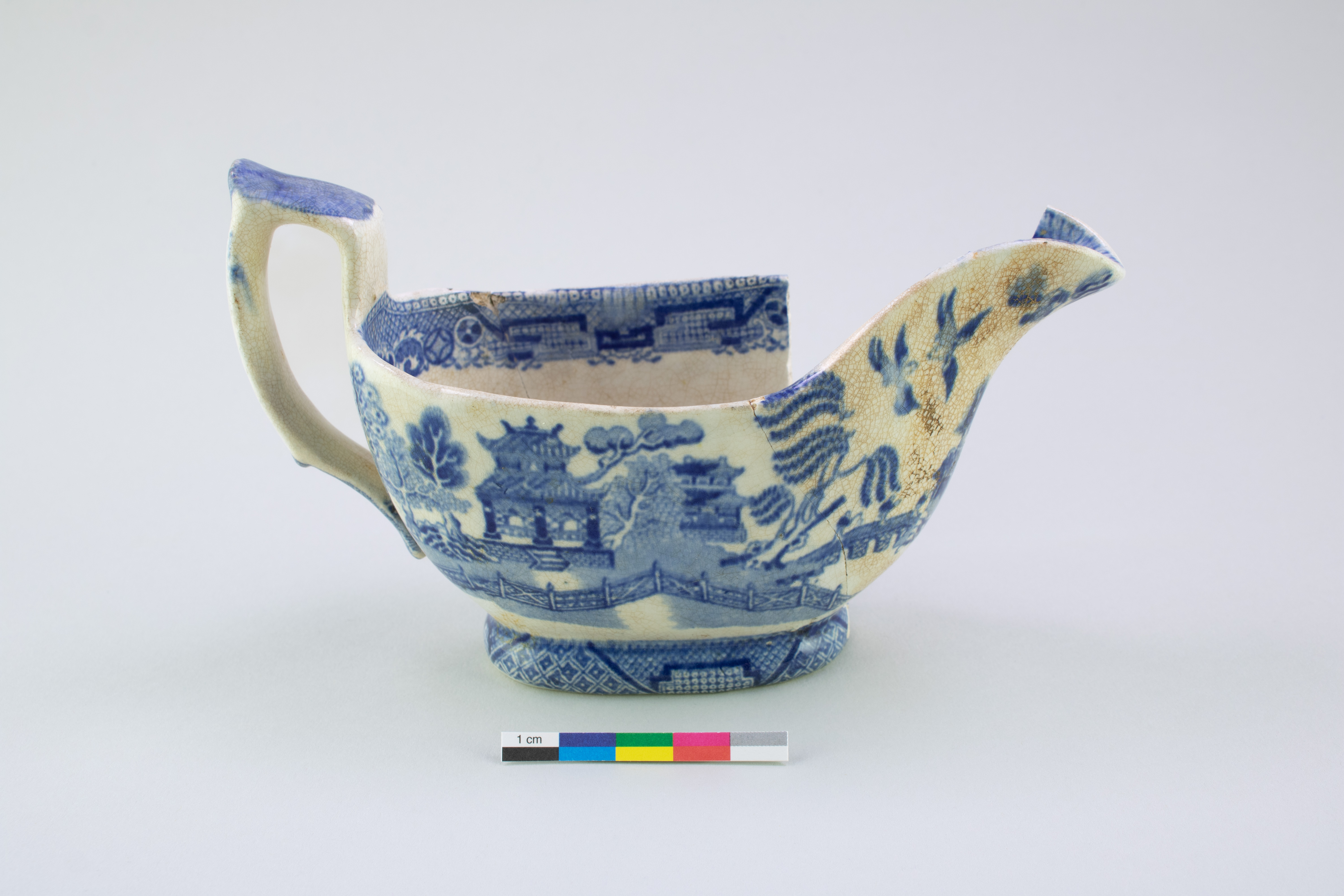 La saucière est un récipient spécifiquement utilisé pour le service des sauces. Le décor imprimé de type « Blue Willow » comprend obligatoirement, à droite, une pagode et un pavillon à l'avant d'un oranger, au centre, un saule pleureur et un pont à trois arches avec trois personnages courant vers la gauche, à gauche, un bateau couvert avec un personnage devant une île, en haut, deux colombes volant dans le ciel et au premier plan, une clôture de treillis en zigzag. Ce motif, vraisemblablement réalisé par Thomas Minton (1765-1836), est produit à partir de 1793 pour être ensuite repris par plusieurs potiers. Des légendes variées sont issues de ce décor hautement populaire, qui est toujours produit aujourd'hui. À partir de 1814 et tout au long du XIXe siècle, il est considéré comme étant l'un des motifs les plus abordables sur les listes de prix des potiers. Le motif « Willow » est habituellement de couleur bleue, mais peut aussi plus rarement être de couleur brune, verte, rouge et autre. Le motif ornant cette saucière est de seconde qualité, car il est mal exécuté. En effet, les feuillets employés pour la pose du décor semblent mal apposés, créant ainsi une scission dans les motifs ou des bavures (erreur d'impression). De plus, le positionnement de certains éléments ne correspond pas au motif traditionnel.