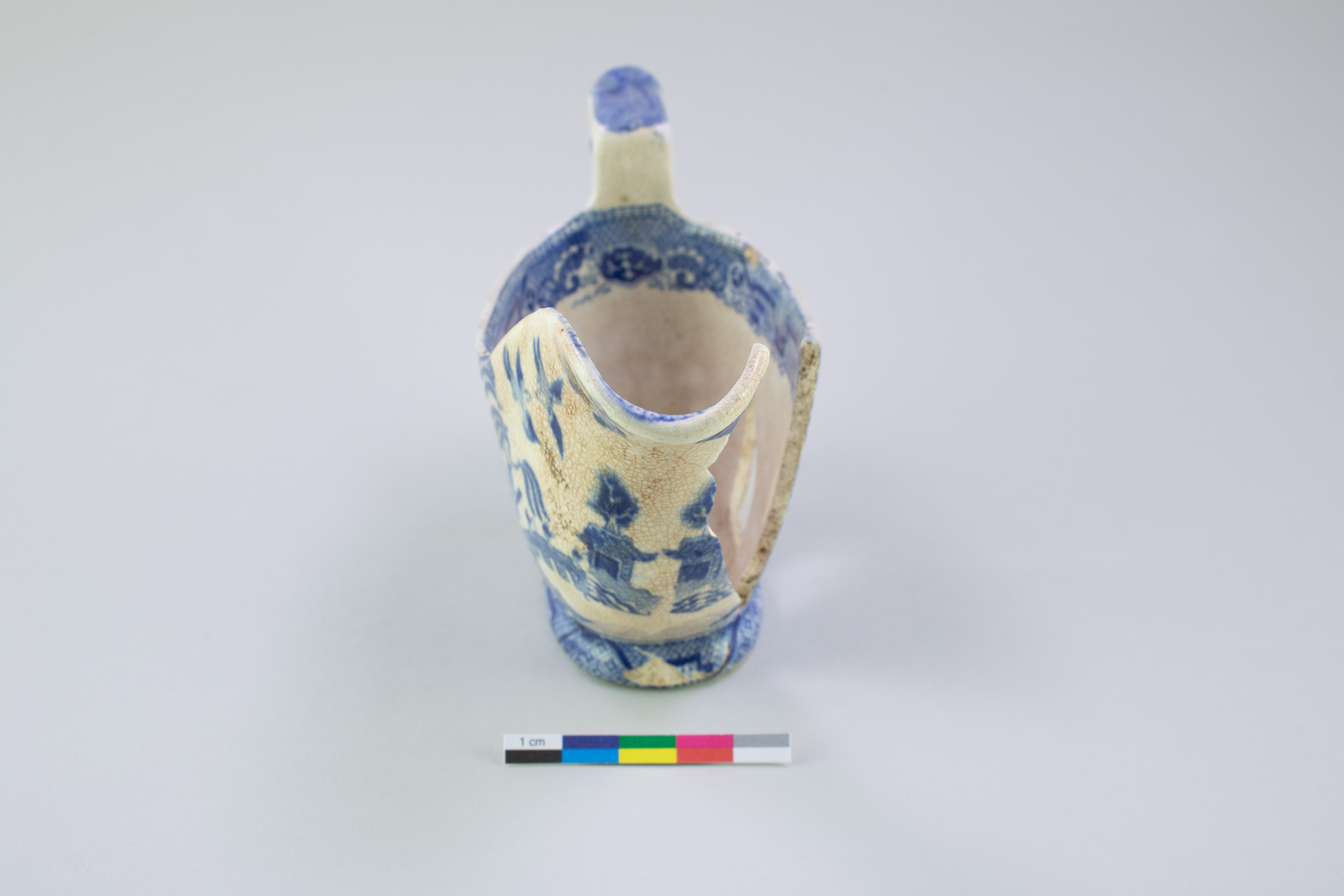 La saucière est un récipient lié à l'alimentation datant d'entre le deuxième tiers et la moitié du XIXe siècle. Complète, la saucière ovale est fabriquée en terre cuite fine blanche. Elle possède un piédouche, un bec verseur à une extrémité et une anse carrée à l'autre extrémité. Un décor imprimé bleu de type « Willow » orne le récipient. Une marque semblant correspondre aux lettres « RCA » est située sous l'objet. La saucière a une hauteur totale de 10 cm, l'ouverture mesure 6 cm sur 13,5 cm, et la base mesure 7,2 cm sur 4,5 cm.