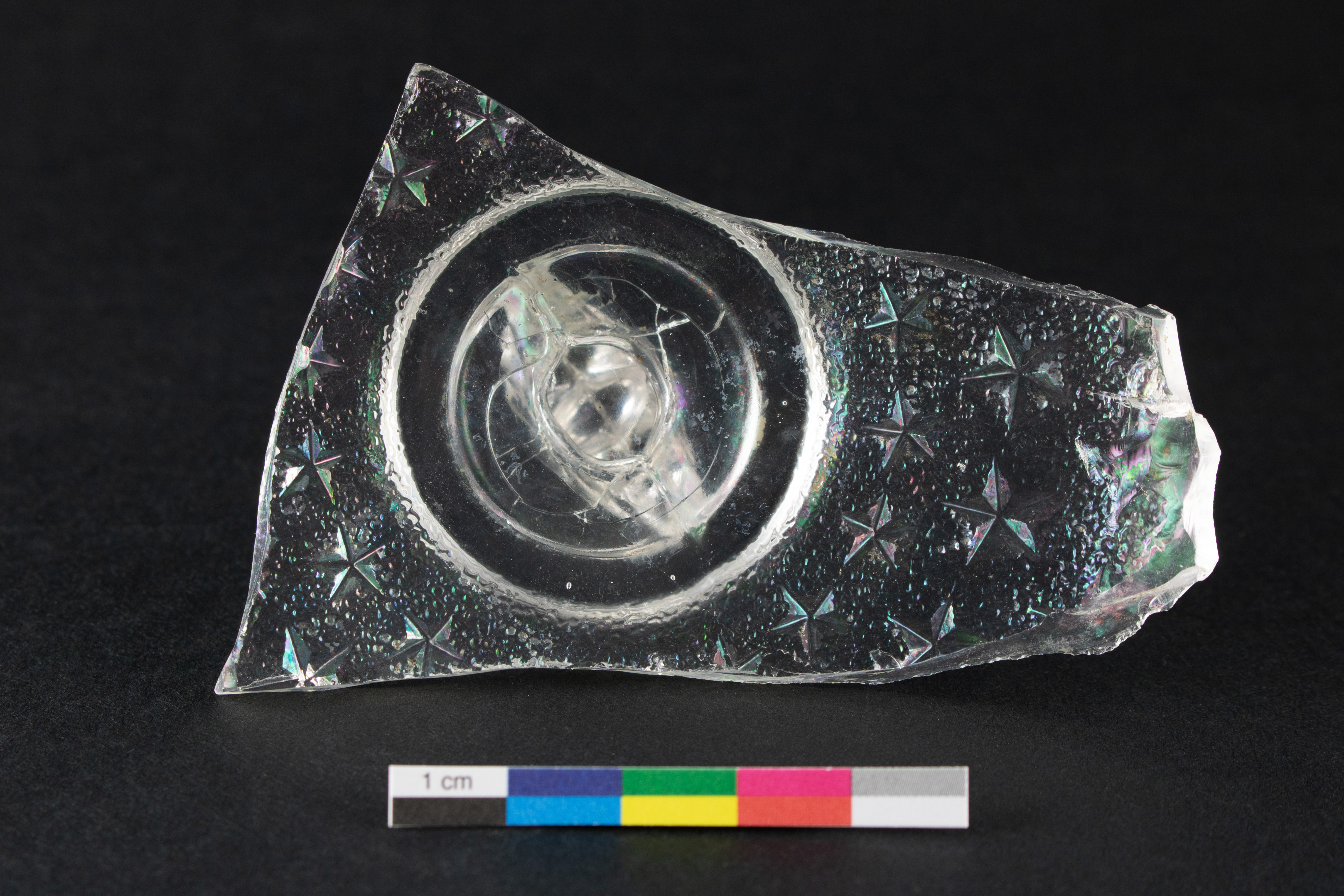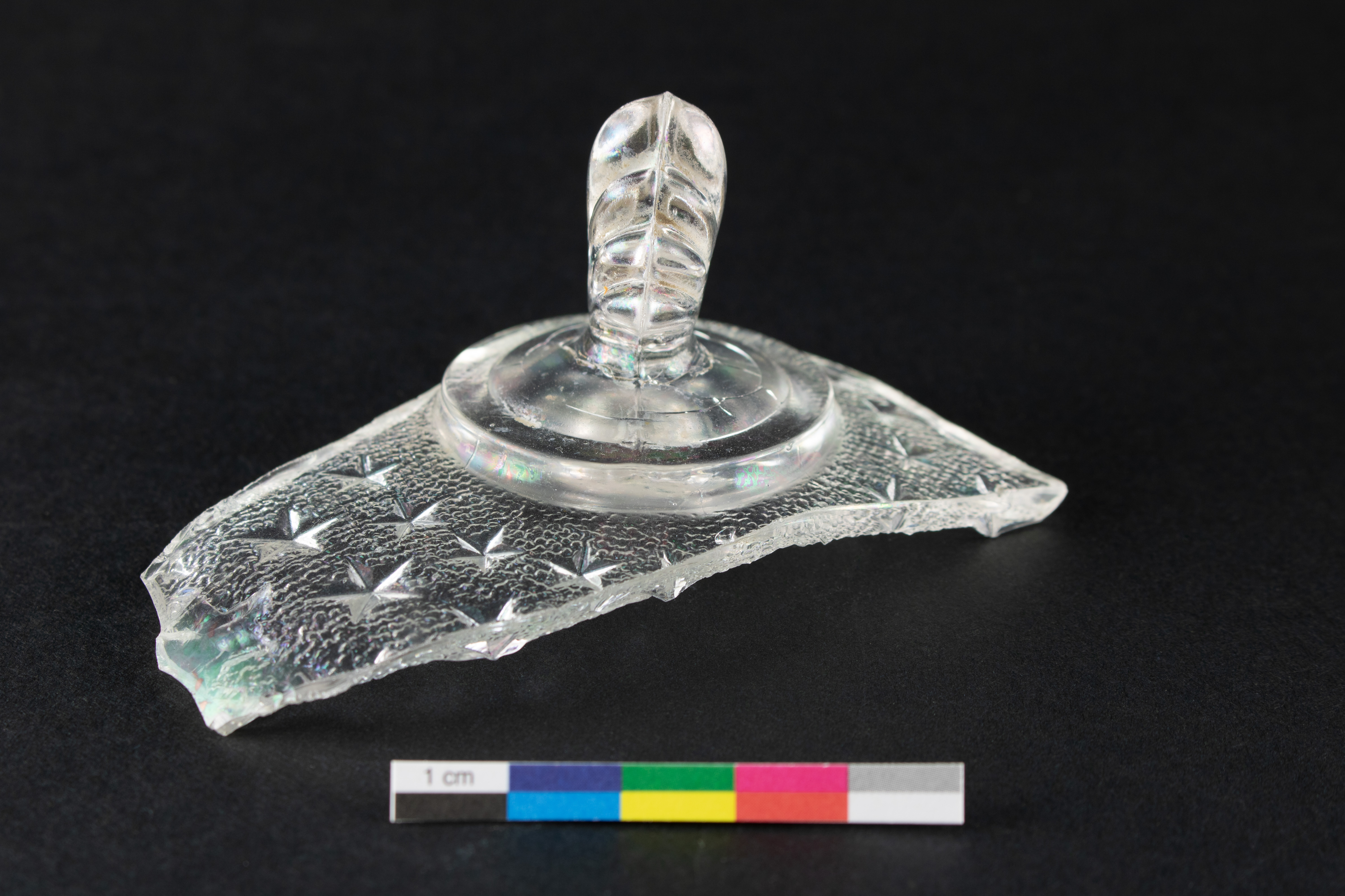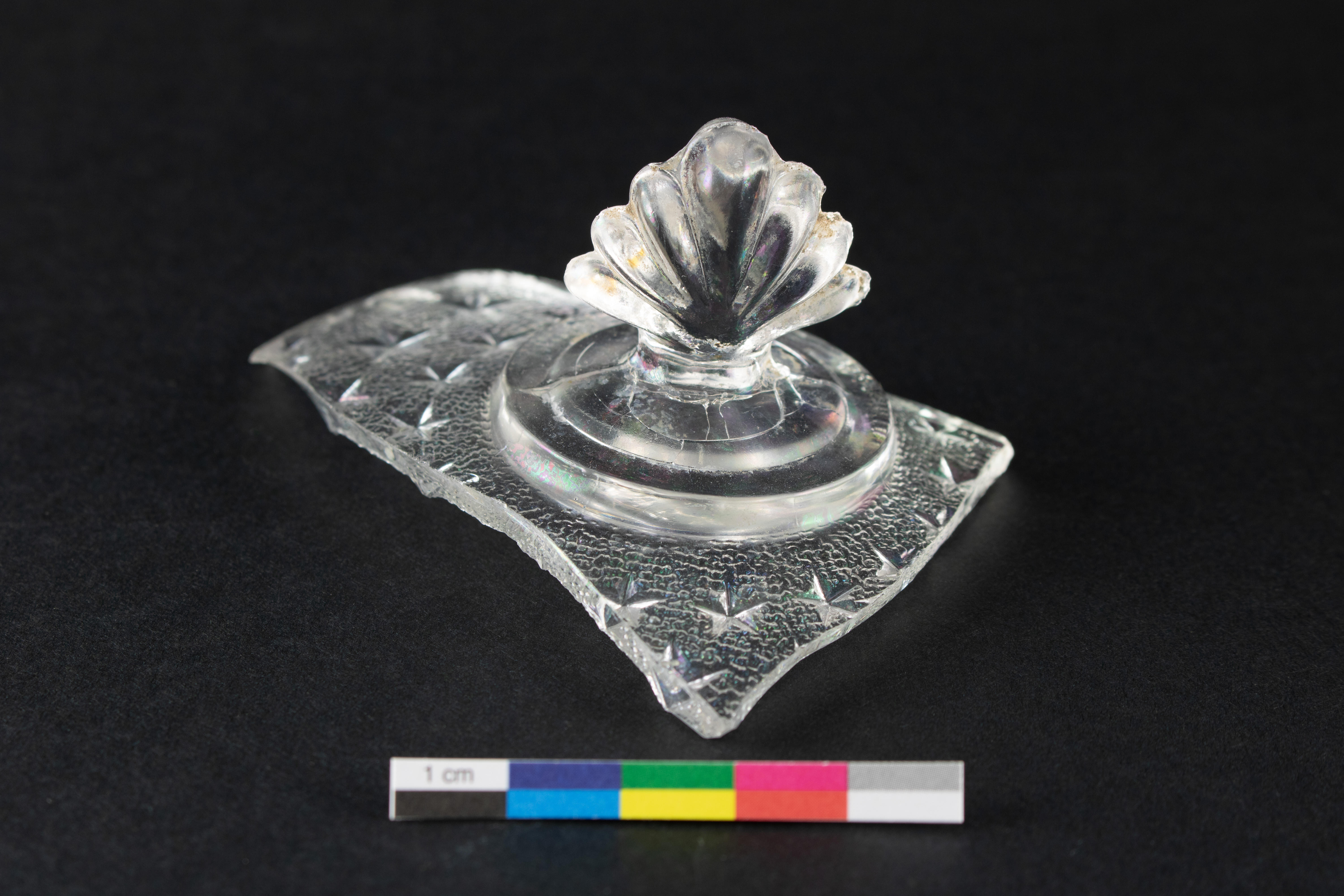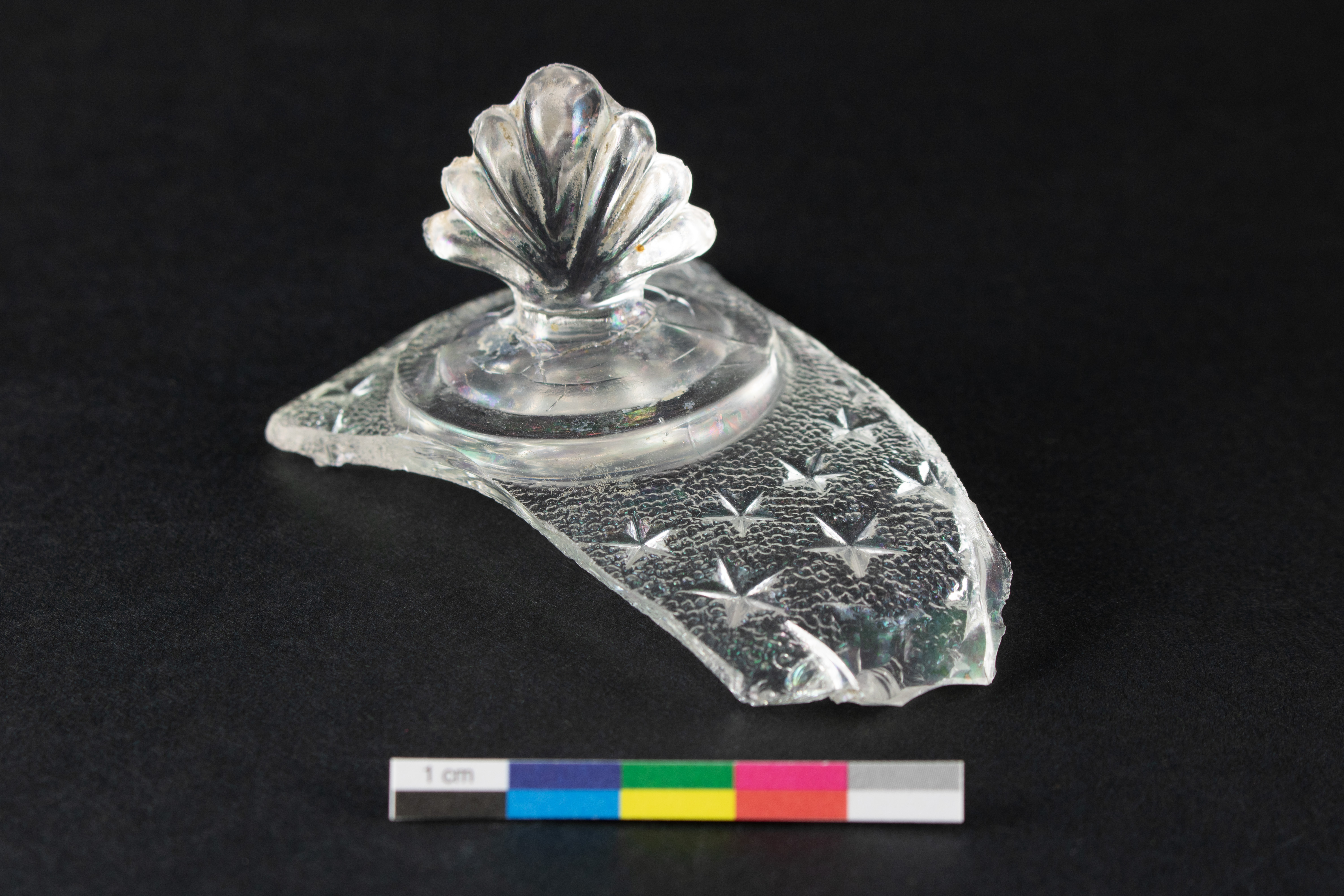 Le couvercle de beurrier est un élément lié à l'alimentation datant du dernier quart du XIXe siècle. Incomplet, le couvercle en verre incolore est fabriqué par moulage à la presse. La surface intérieure du couvercle est ornée d'un motif moulé en relief intitulé « Star » ou « Stippled Star », dont le fond en pointillé est rehaussé d'étoiles en relief. Le couvercle possède un bouton décoré qui rappelle la forme d'un coquillage. L'objet mesure 9,5 cm de longueur et 6,5 cm de largeur résiduelles et le bouton mesure environ 4 cm de hauteur.